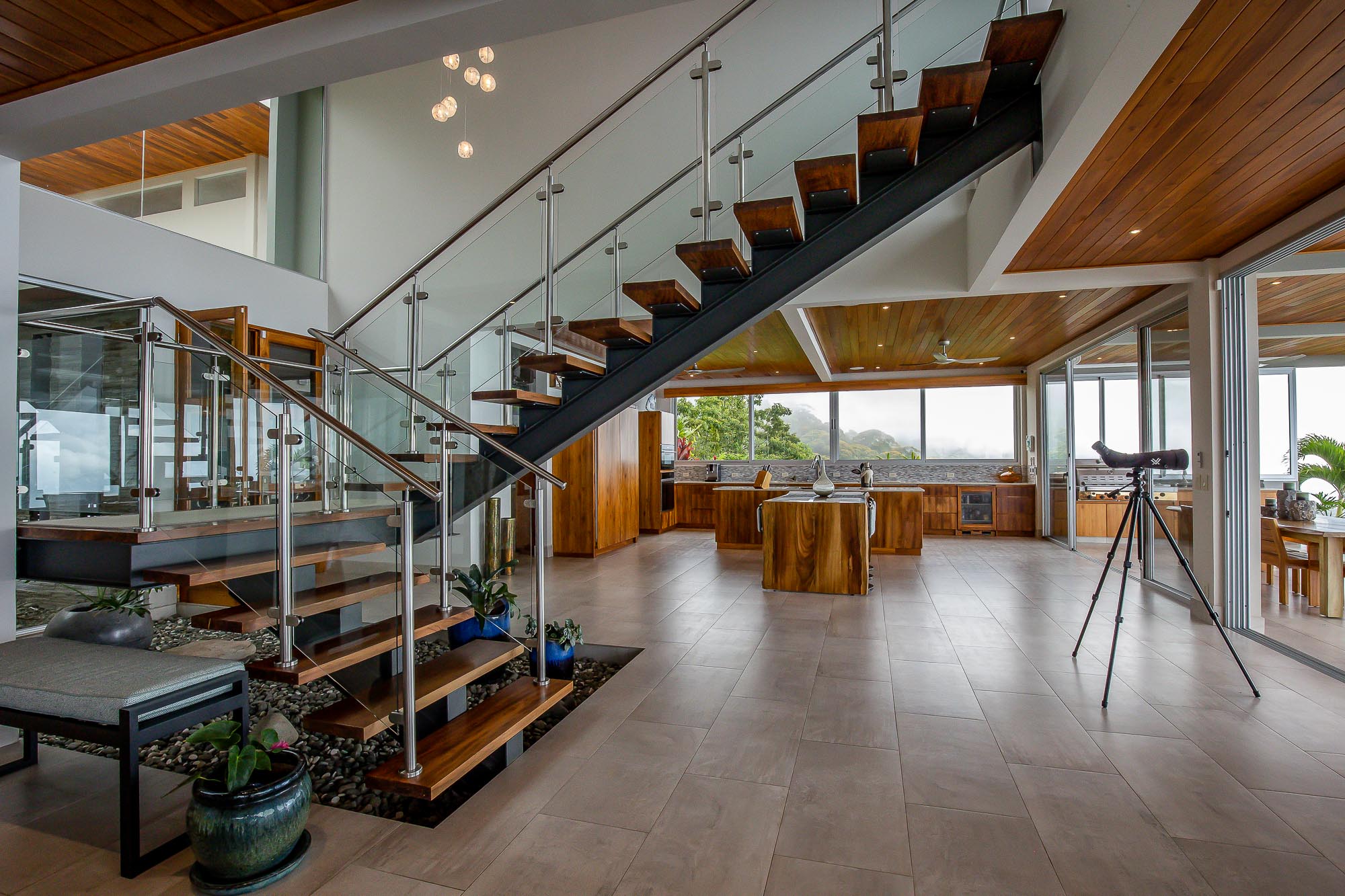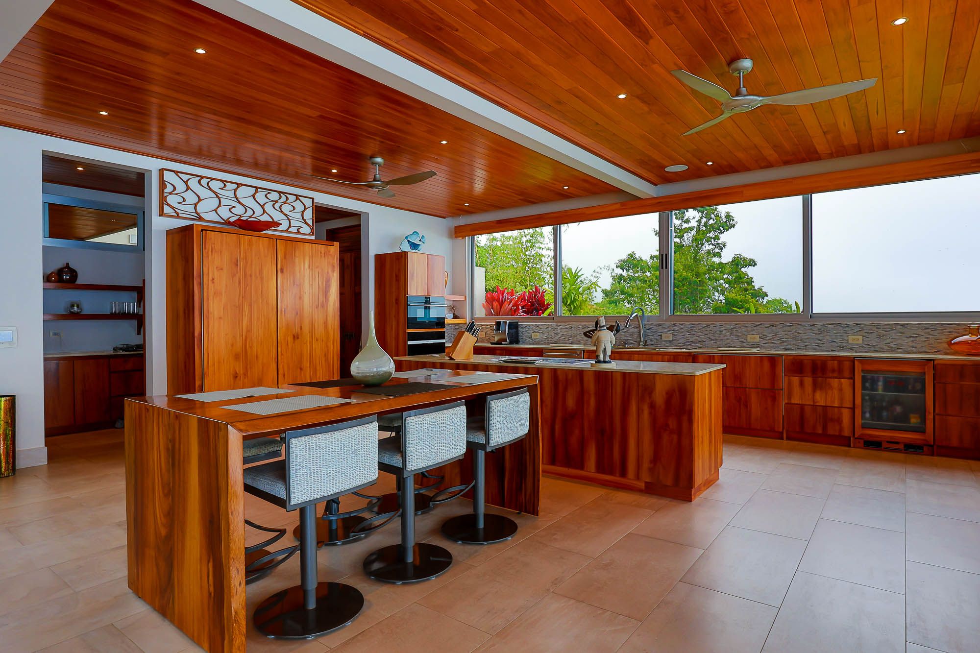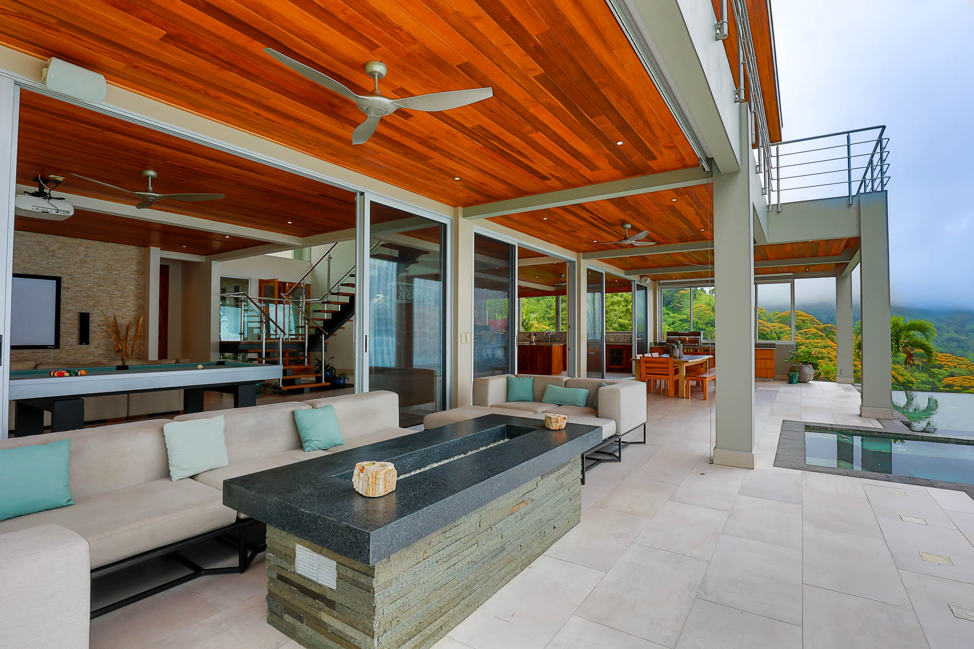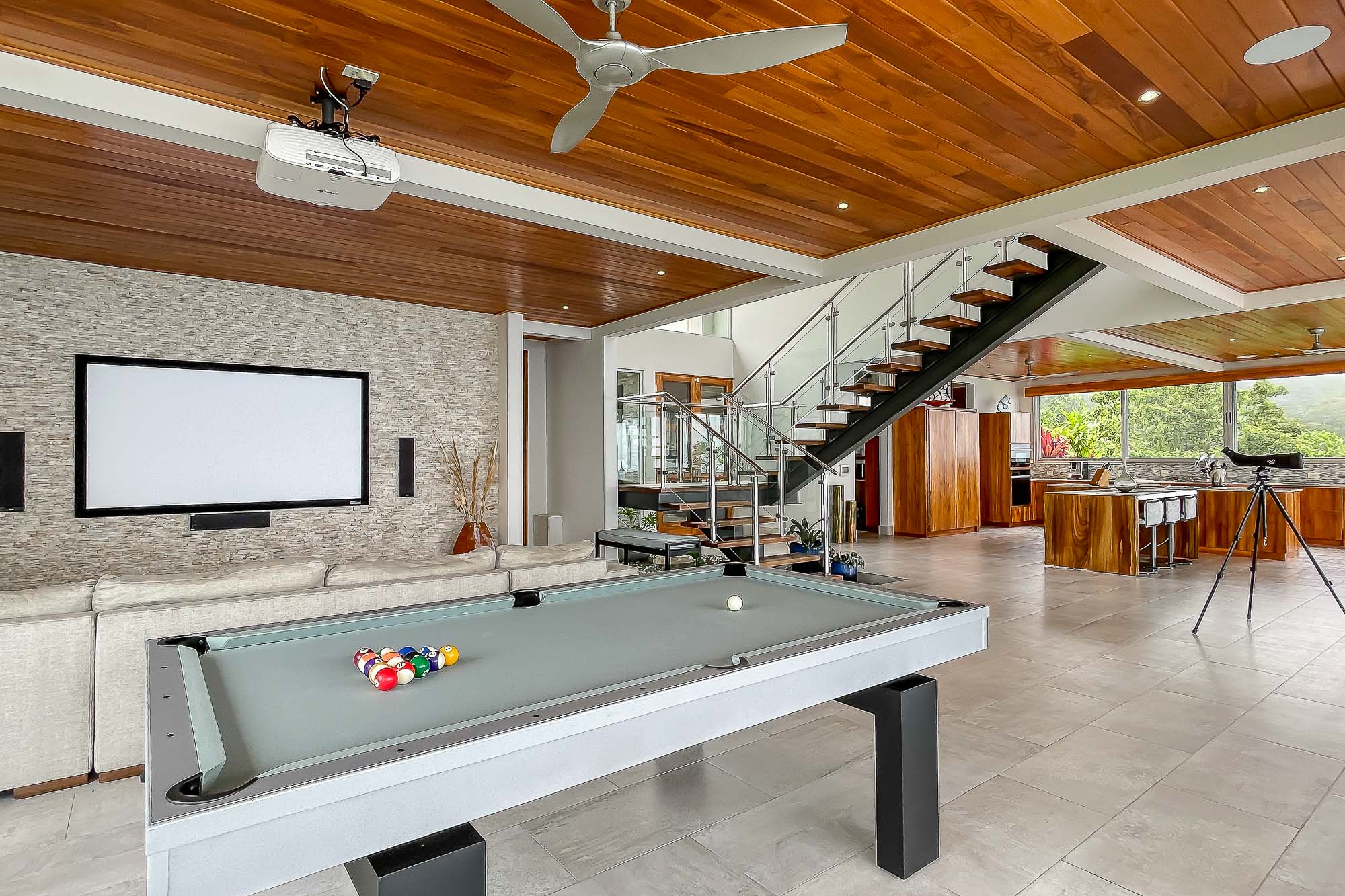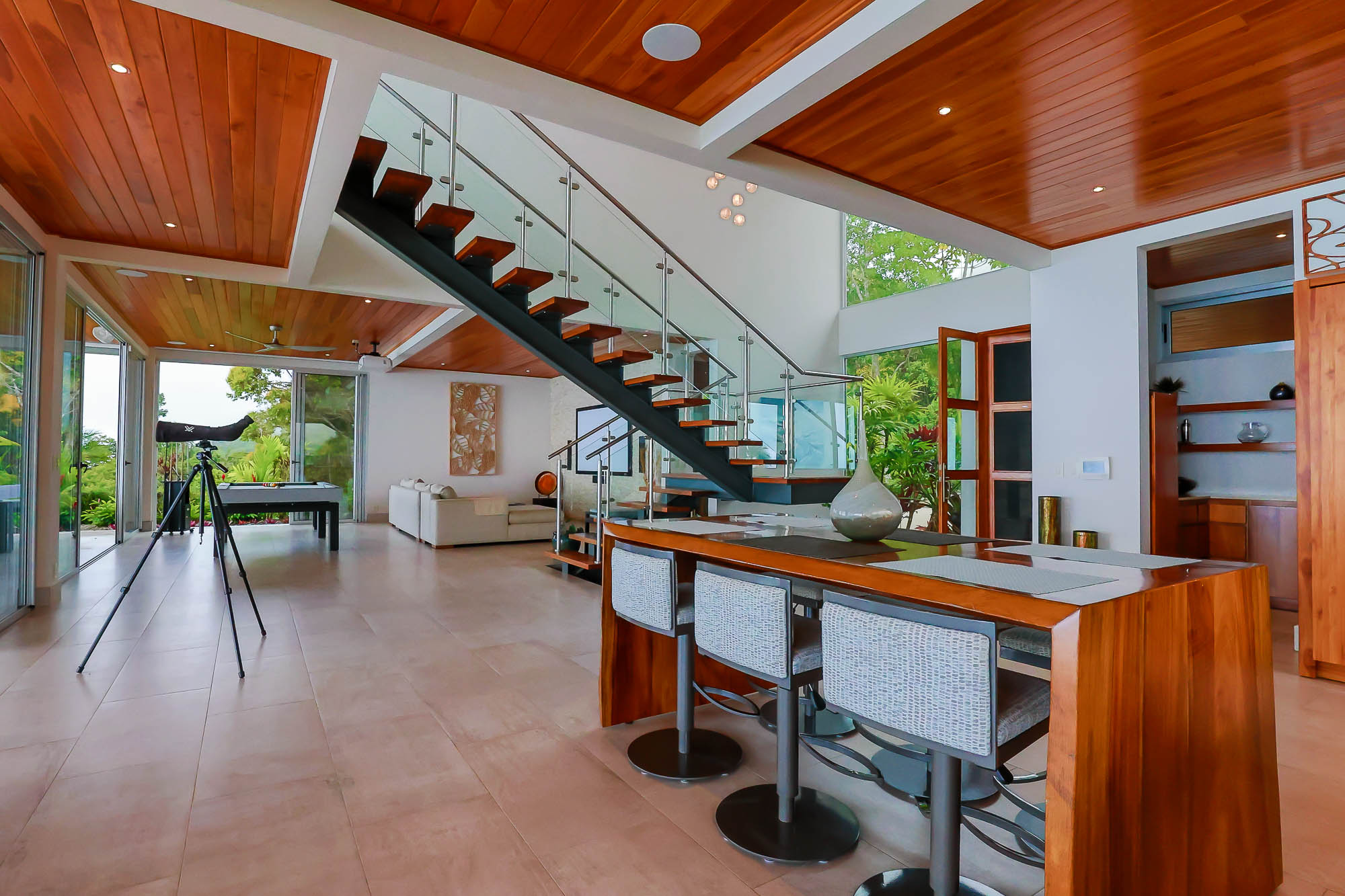 On the main level is a great room that includes a chef's kitchen, two islands (cook island and breakfast island), pantry, laundry and a service area on the south side. On the north side, a game area (custom billiards table) and media area offer plenty of entertainment potential. This area is connected to a generous outdoor living space with a firepit and seating area on the right, and a covered outdoor dining area with bbq on the left side. Right next to this section is an adjacent jacuzzi tub that ties into an infinity edge swimming pool, all of which are one level and all of which overlook the most dramatic Pacific views that Costa Rica has to offer. The surrounding landscapes offer uninterrupted views down the coast from the Osa Peninsula, with the iconic Whale's Tail, long stretches of coast, headlands, rocky outcroppings and year-round sunsets.