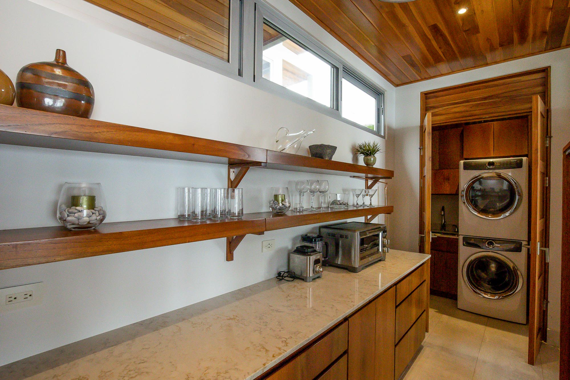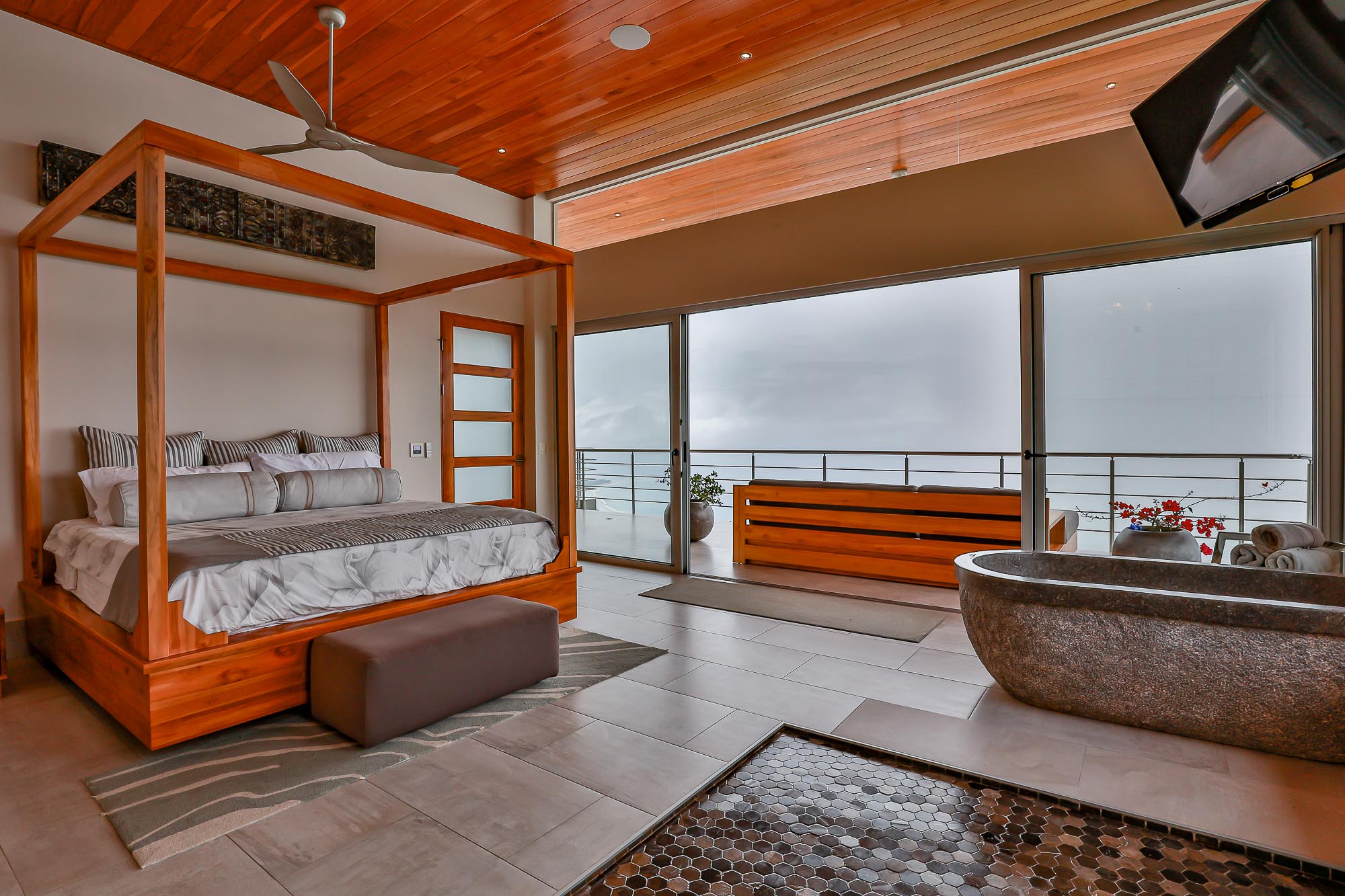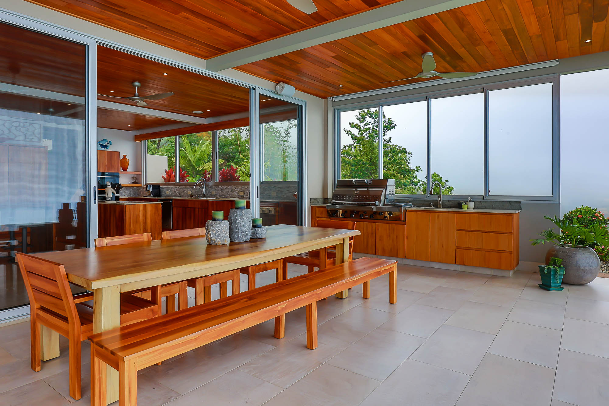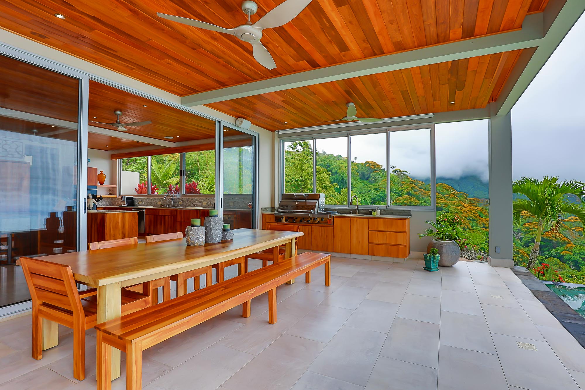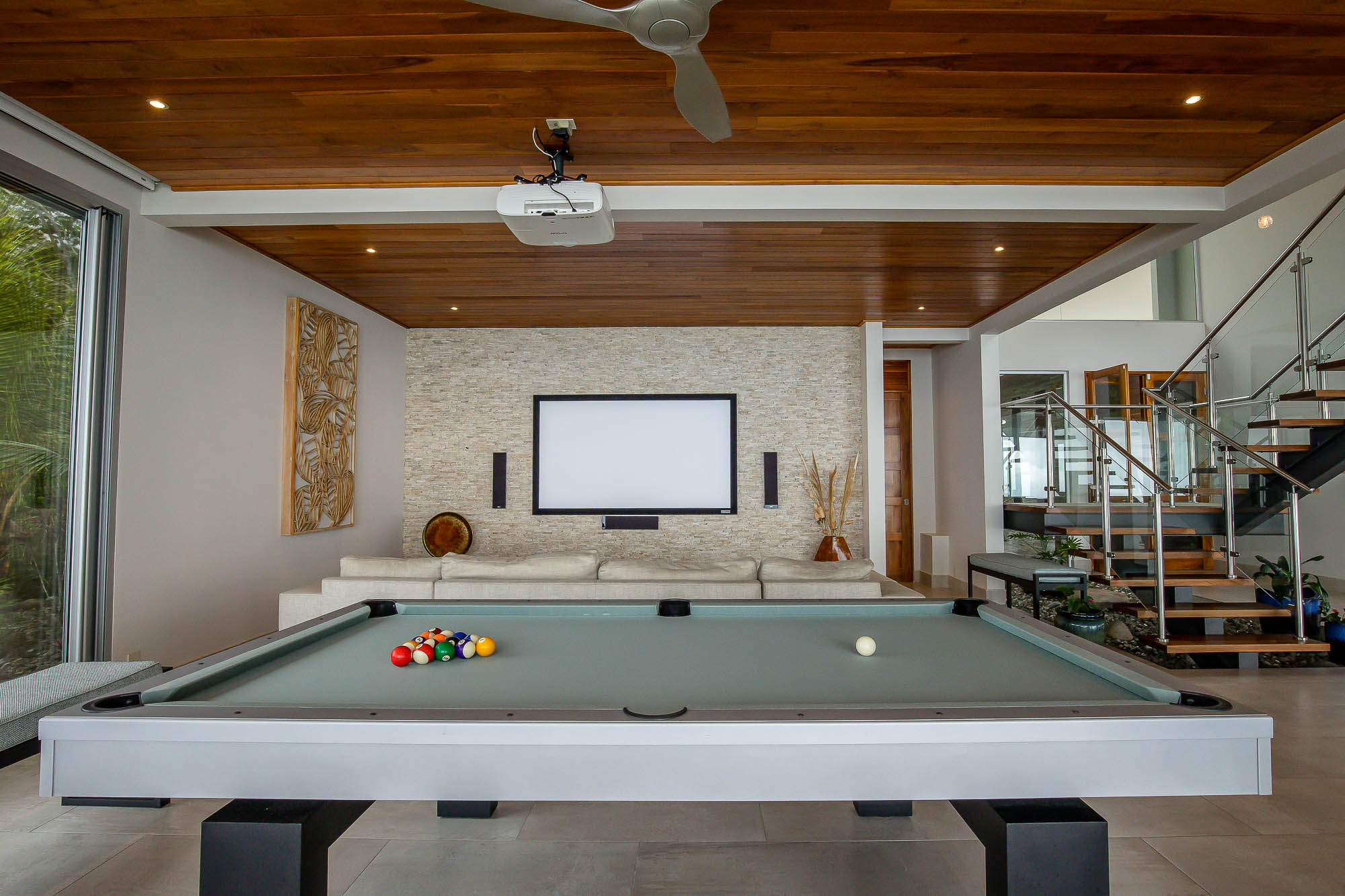On the main level is a great room that includes a chef's kitchen, two islands (cook island and breakfast island), pantry, laundry and a service area on the south side. On the north side, a game area (custom billiards table) and media area offer plenty of entertainment potential. This area is connected to a generous outdoor living space with a firepit and seating area on the right, and a covered outdoor dining area with bbq on the left side. Right next to this section is an adjacent jacuzzi tub that ties into an infinity edge swimming pool, all of which are one level and all of which overlook the most dramatic Pacific views that Costa Rica has to offer. The surrounding landscapes offer uninterrupted views down the coast from the Osa Peninsula, with the iconic Whale's Tail, long stretches of coast, headlands, rocky outcroppings and year-round sunsets.