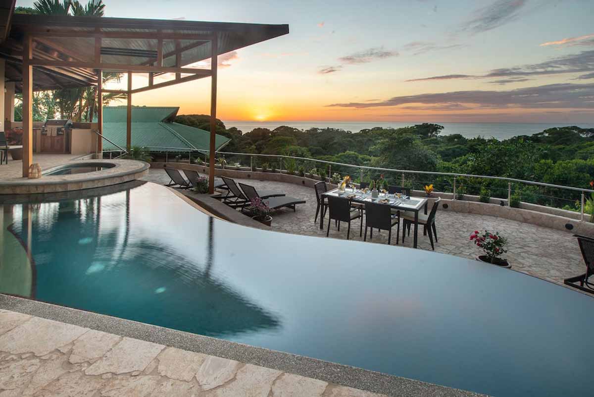 Exclusive 8,365 square foot, newly renovated, luxury home offering a breathtaking 180-degree view of ocean, jungle, and of course, perfect sunsets. The Villa is located 350 feet above the ocean, on a two-acre property, in a safe and secure gated community, only a four-minute drive from the ocean and beaches.
