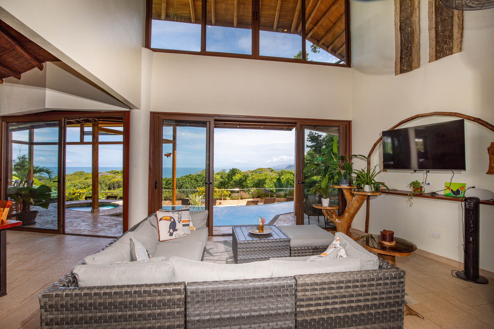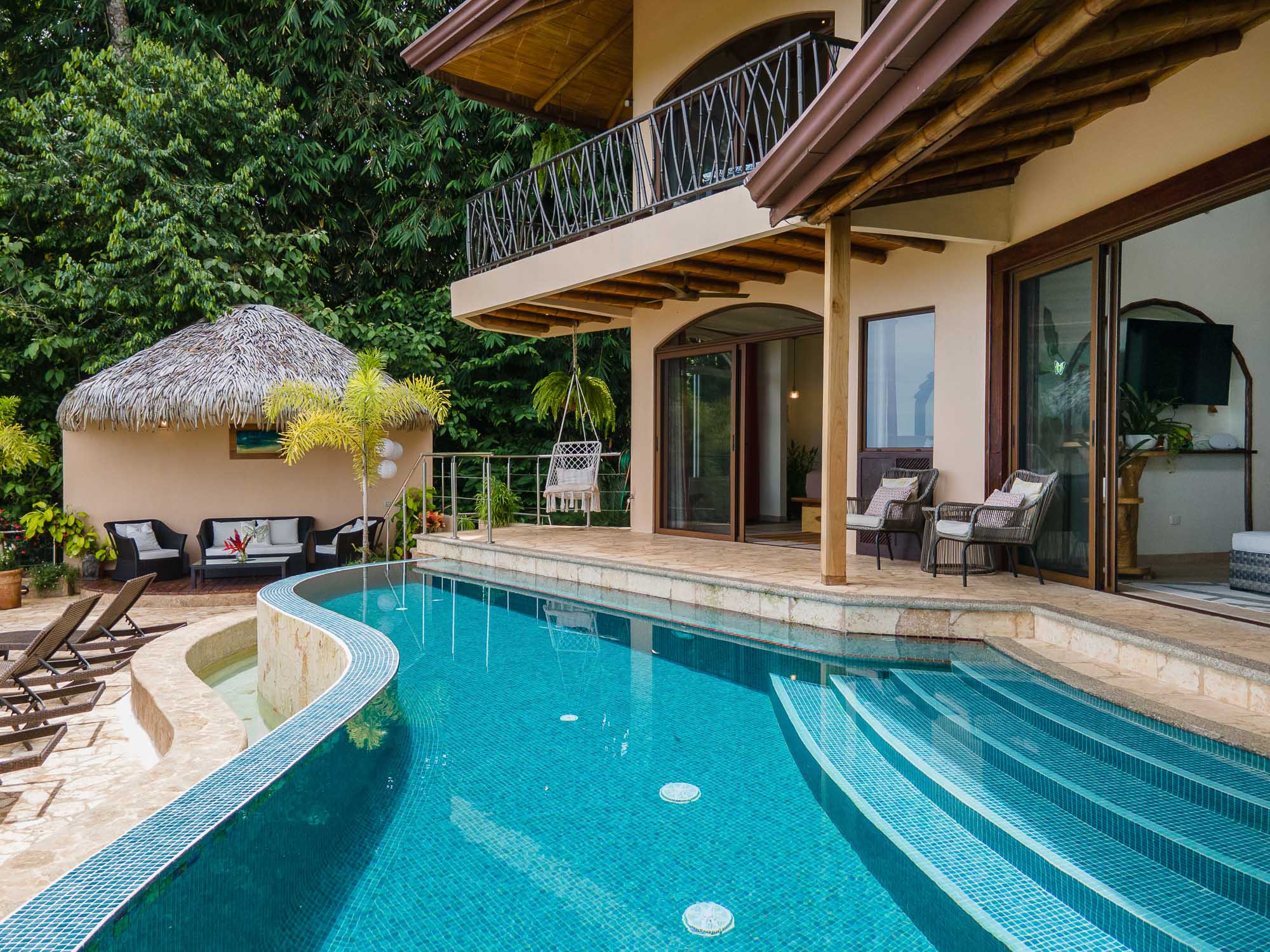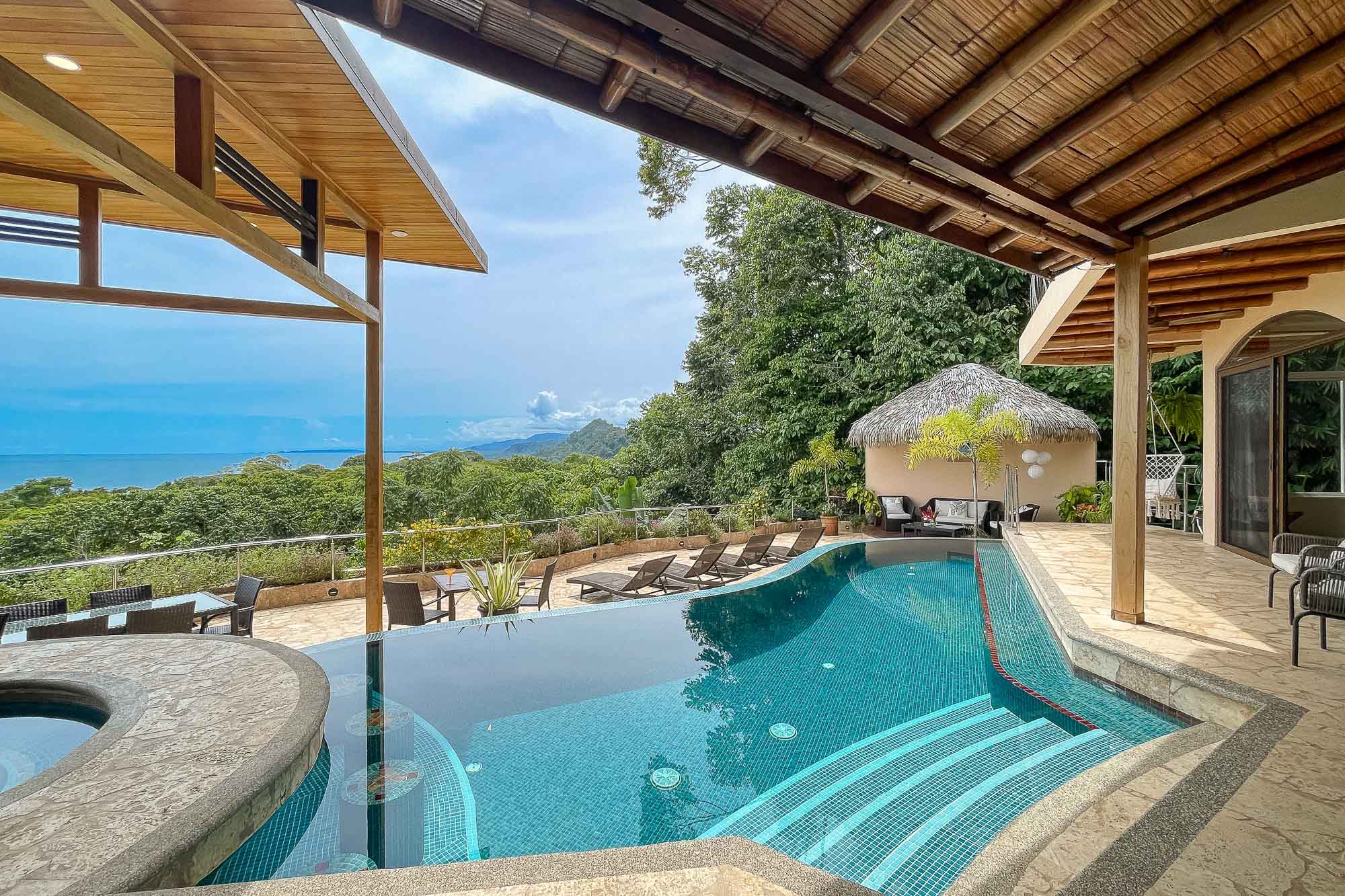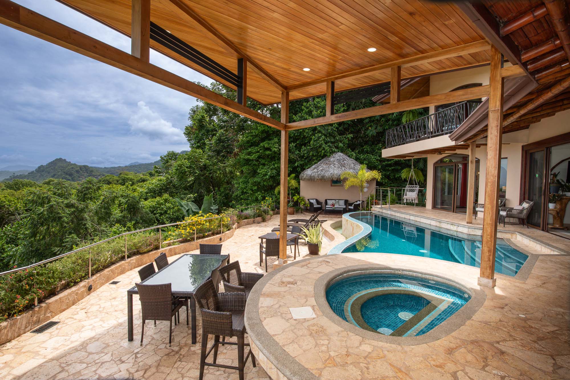 Upon entering the property, you will follow a short driveway to a 5-car parking area. You will be greeted near the front door by a trickling waterfall and pond. Immediately upon entering the front door of the main Villa you will be wowed by the view of the infinity pool, the expansive wrap-around balcony, and of course, the never-ending view of jungle, mountains, and ocean.
