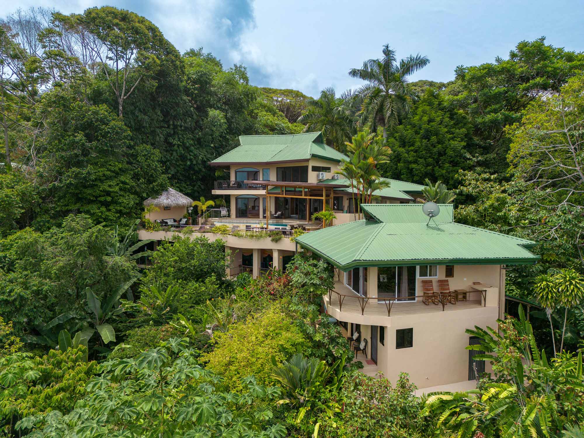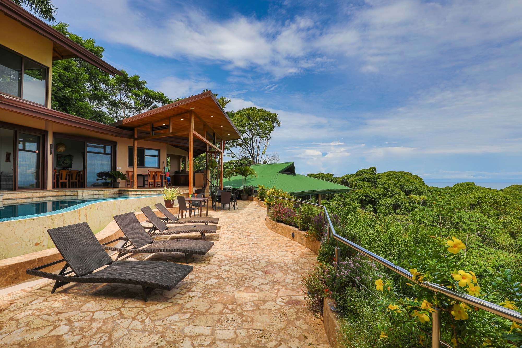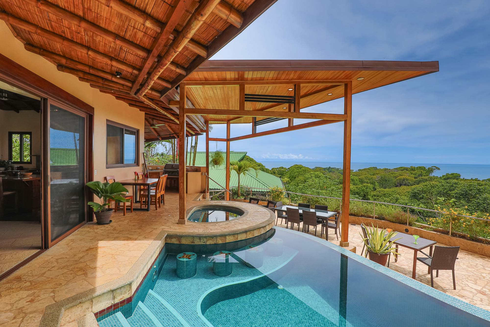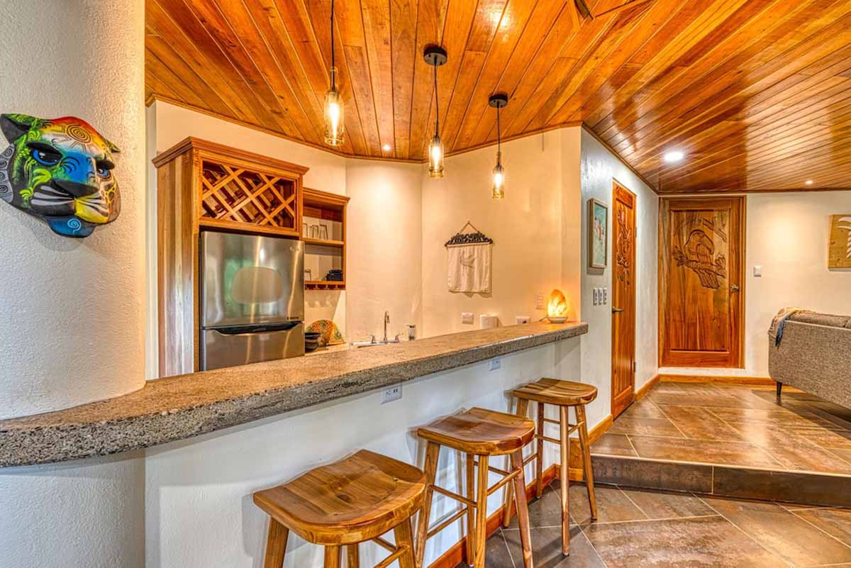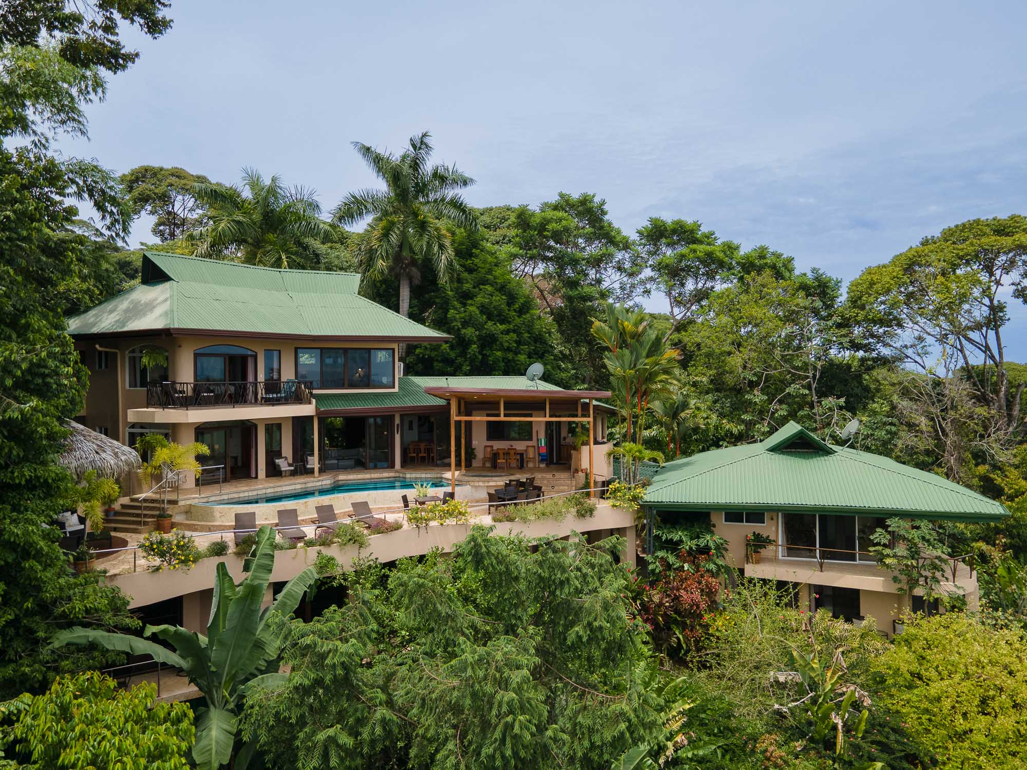 Upon entering the property, you will follow a short driveway to a 5-car parking area. You will be greeted near the front door by a trickling waterfall and pond. Immediately upon entering the front door of the main Villa you will be wowed by the view of the infinity pool, the expansive wrap-around balcony, and of course, the never-ending view of jungle, mountains, and ocean.