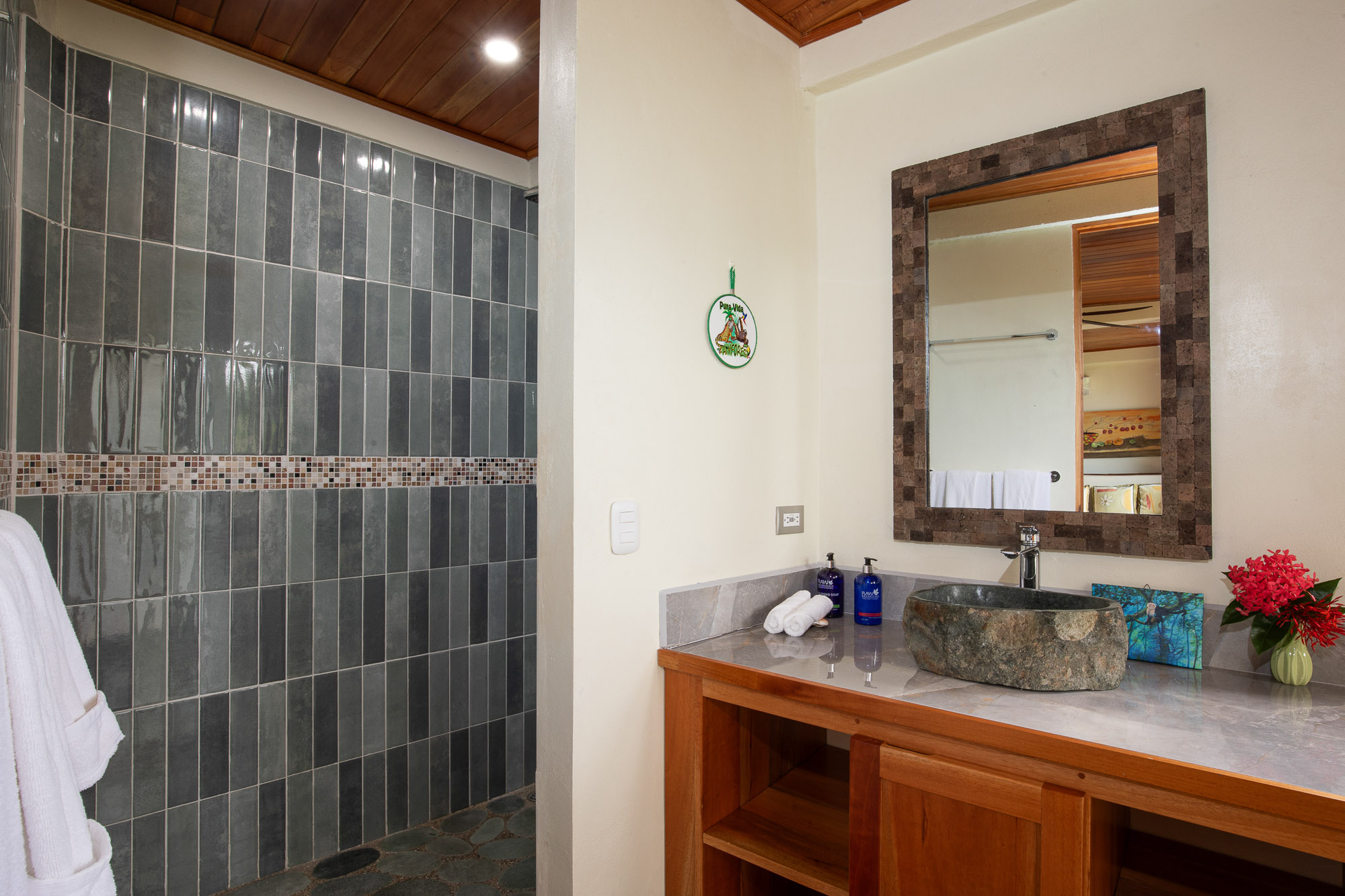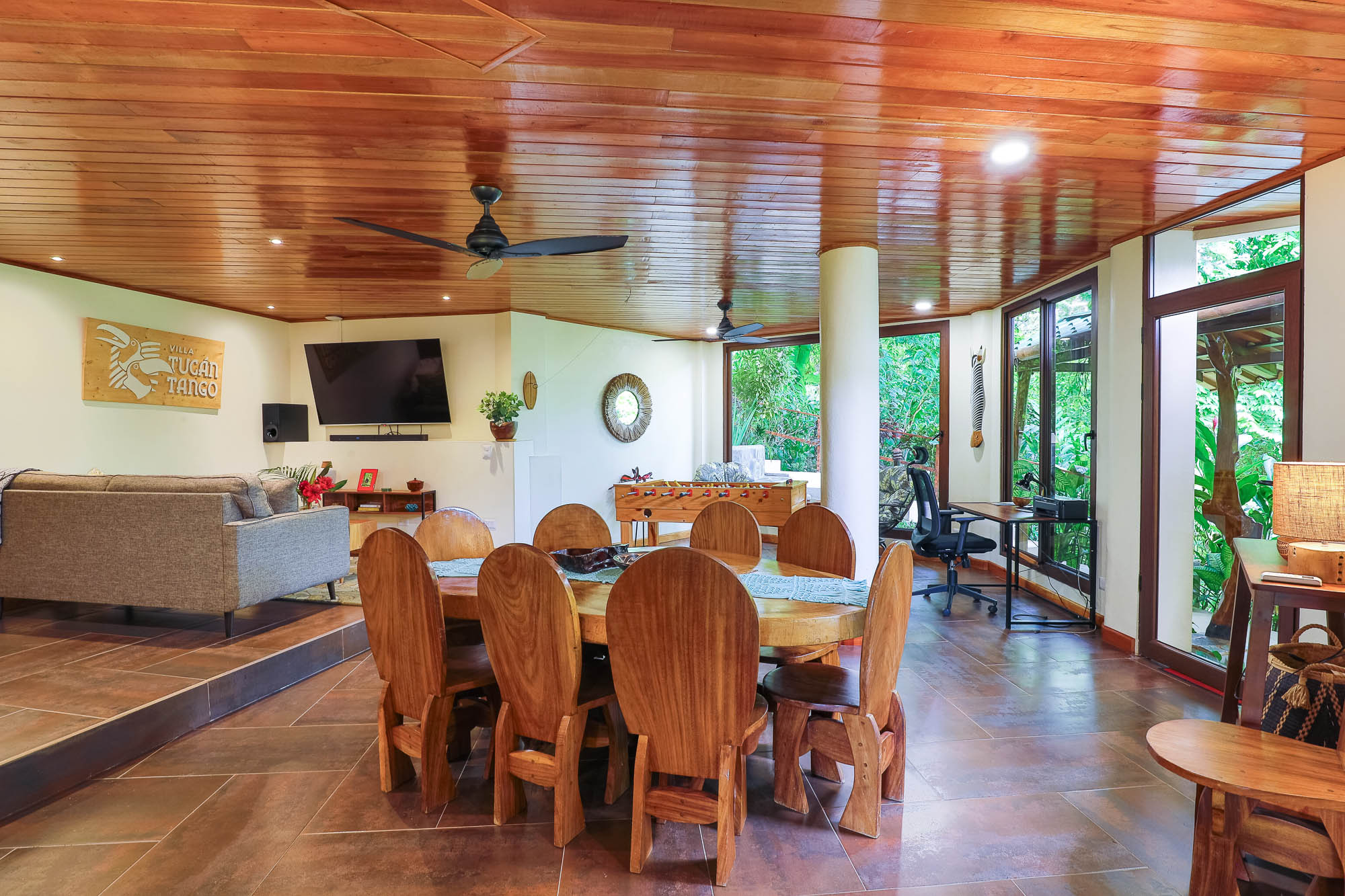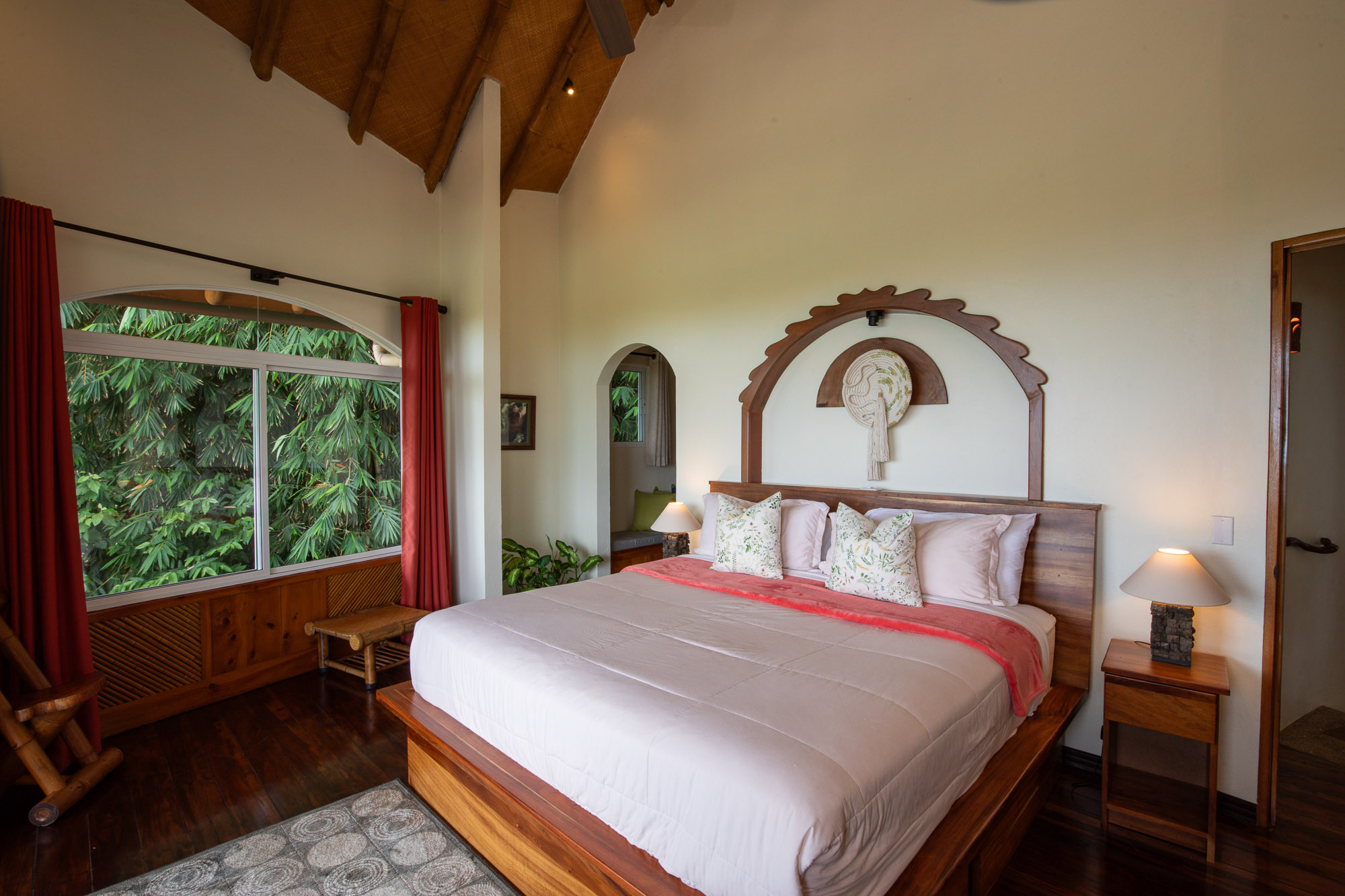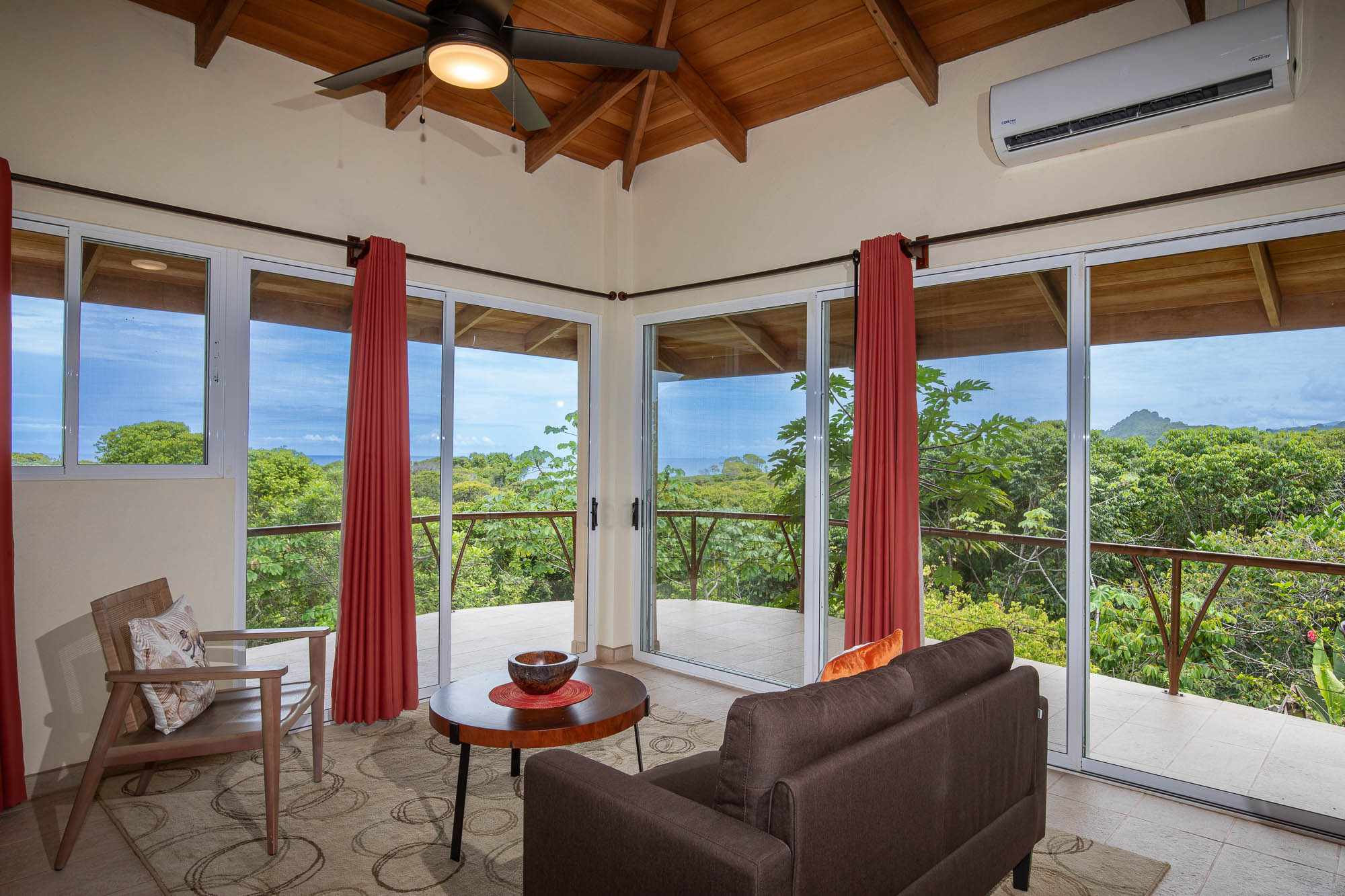Upon entering the property, you will follow a short driveway to a 5-car parking area. You will be greeted near the front door by a trickling waterfall and pond. Immediately upon entering the front door of the main Villa you will be wowed by the view of the infinity pool, the expansive wrap-around balcony, and of course, the never-ending view of jungle, mountains, and ocean.
