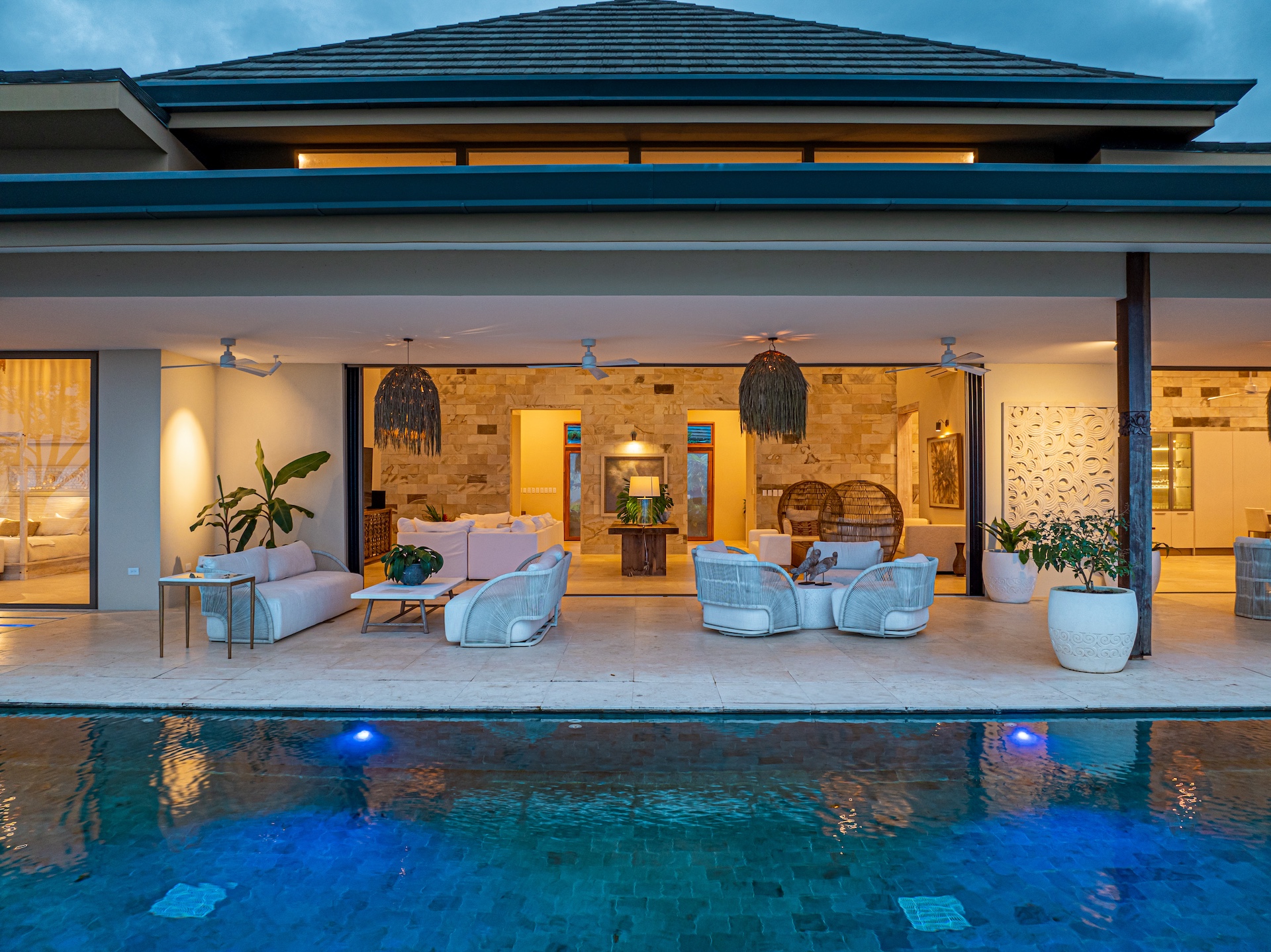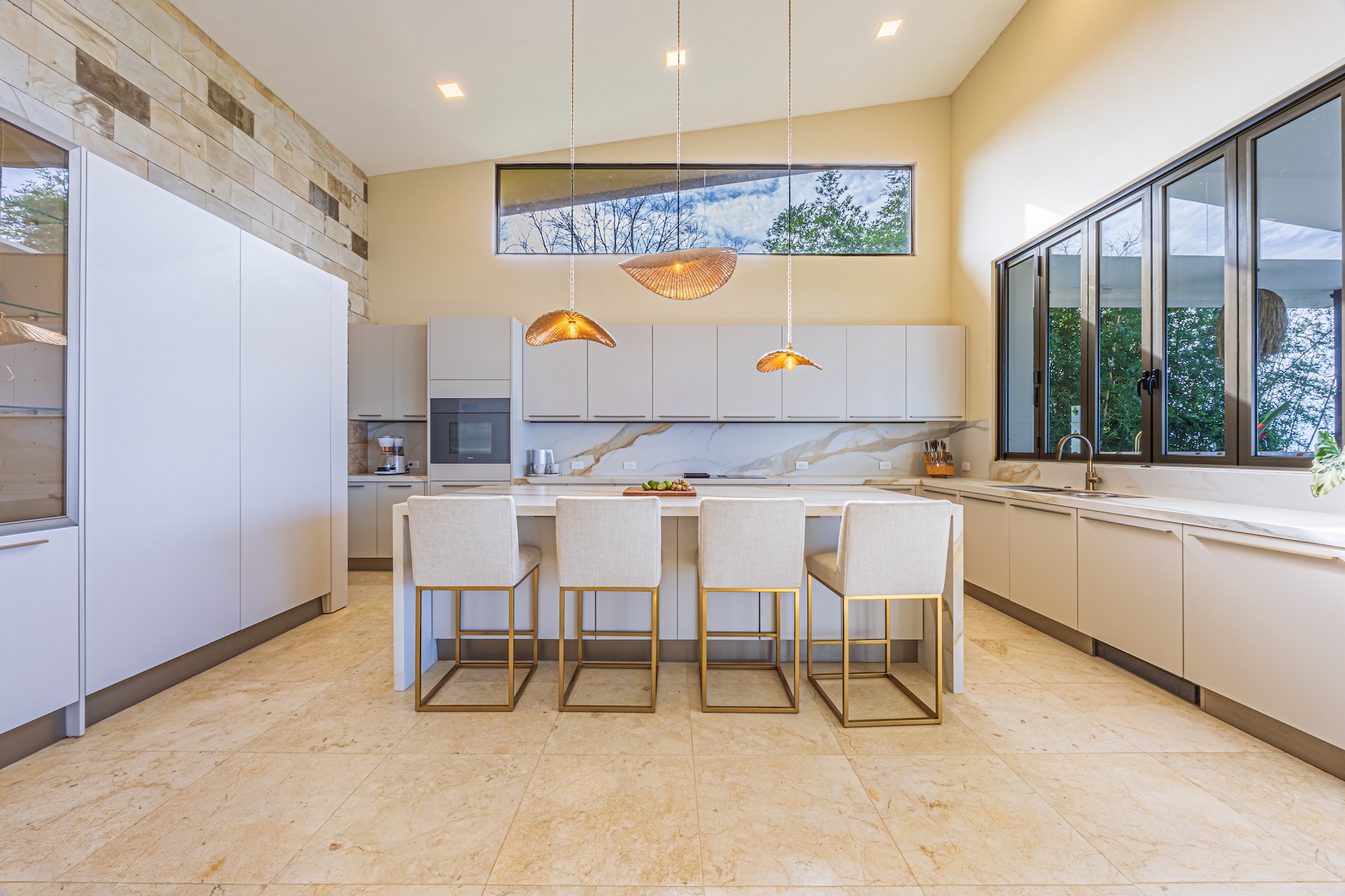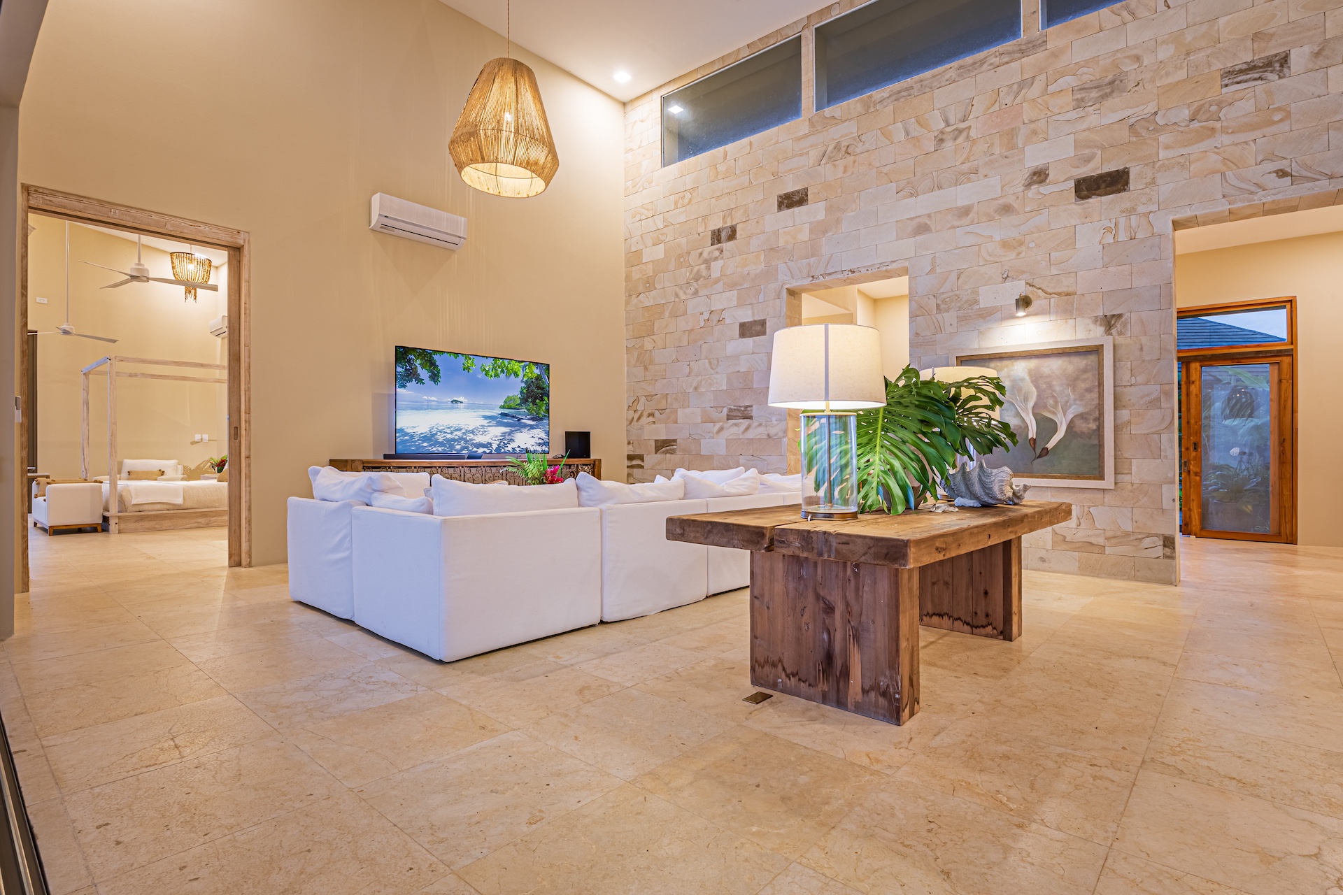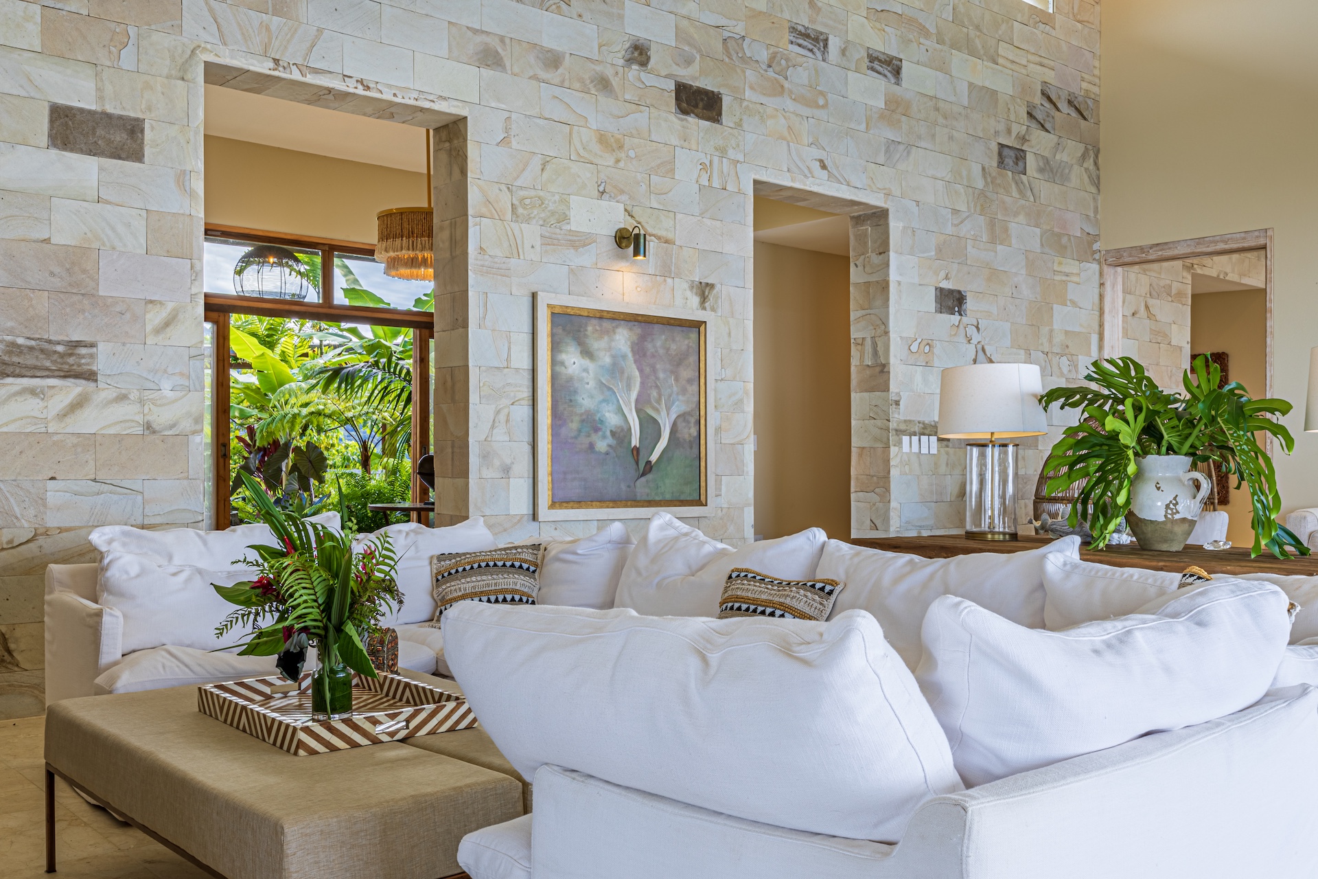 At the heart of MU is Casa Lemuria, an expansive ocean-view estate where luxury and nature intertwine. As you enter this magnificent home, you are greeted by hand-carved travertine tiles, gracefully leading you into the great room. Here, exotic tiles from Bali and curated Restoration Hardware furniture create an atmosphere of serenity and elegance. The great room itself is a masterpiece, designed to evoke the feeling of a luxury hotel lobby with its cloud sofas, ample seating, and open, inviting space.