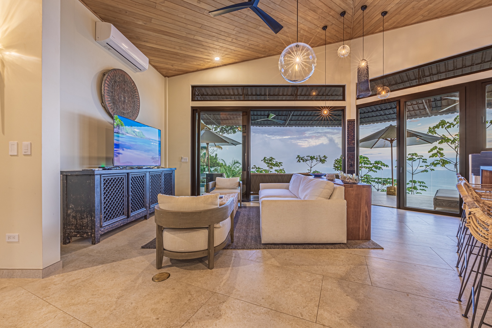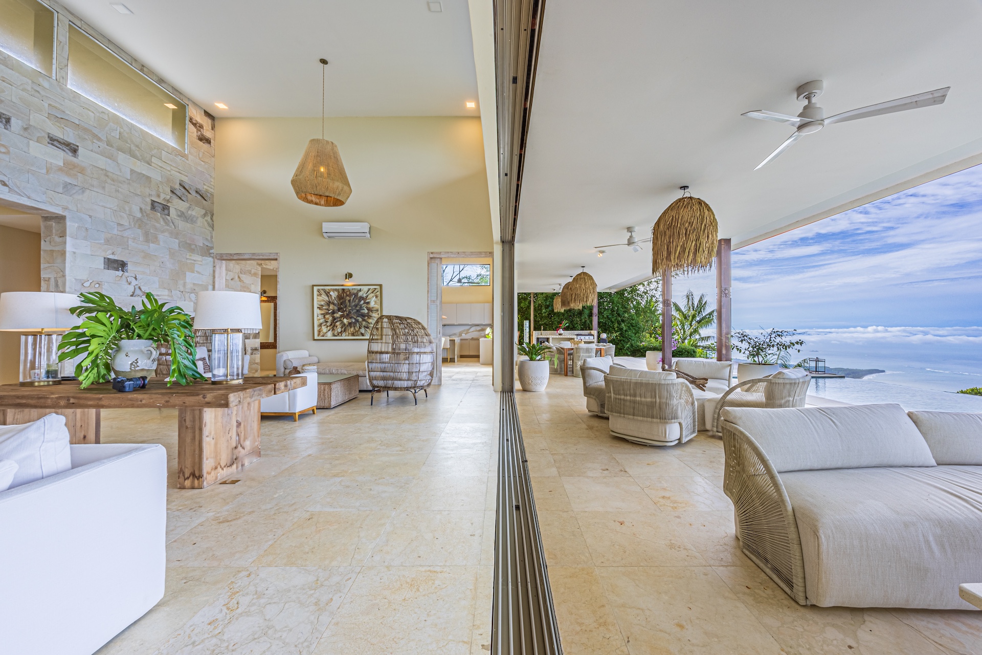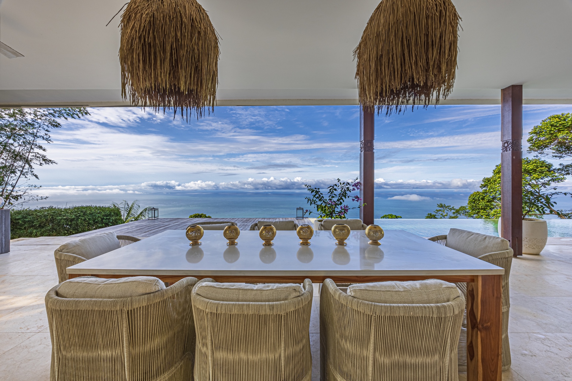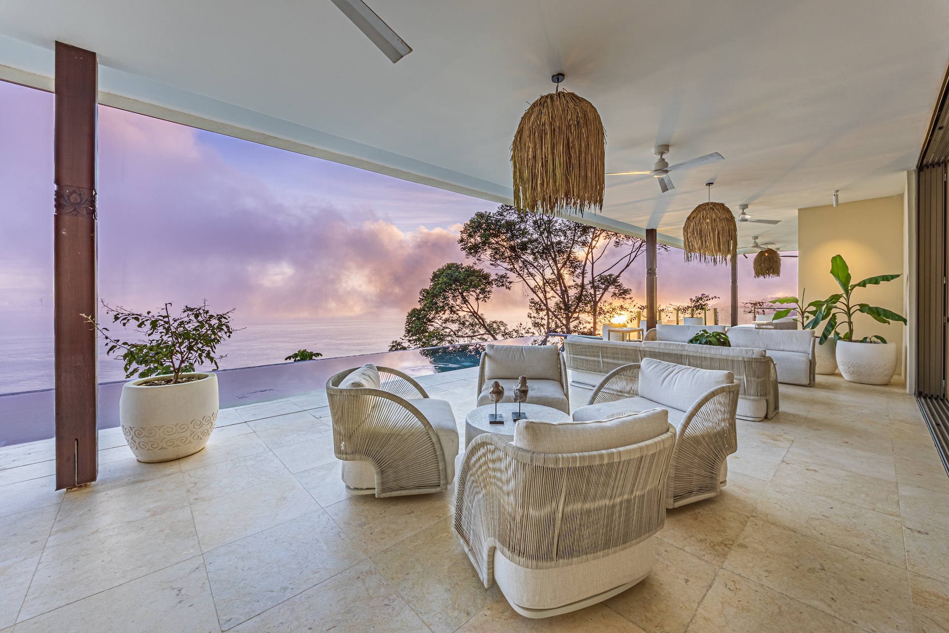 The full indoor-outdoor window systems, with retractable glass walls, allow for a seamless transition between the great room and the expansive oceanfront terrace. This terrace offers sweeping views of the Pacific Ocean, including the iconic Whale's Tail, the Osa Peninsula to the south, and Manuel Antonio National Park to the north. Whether you're entertaining guests or simply relaxing, this setting provides the perfect backdrop to enjoy Costa Rica's vibrant sunsets.