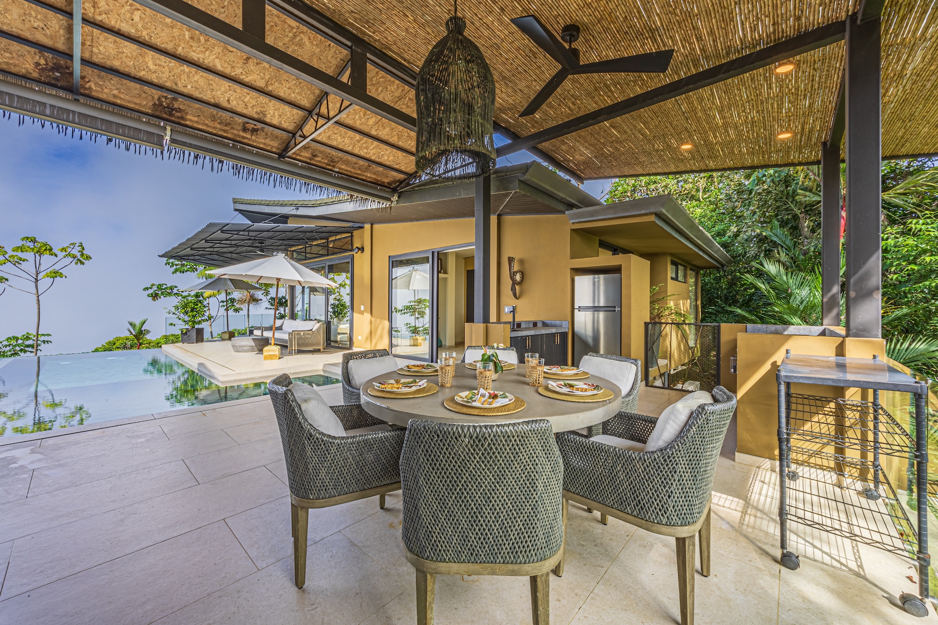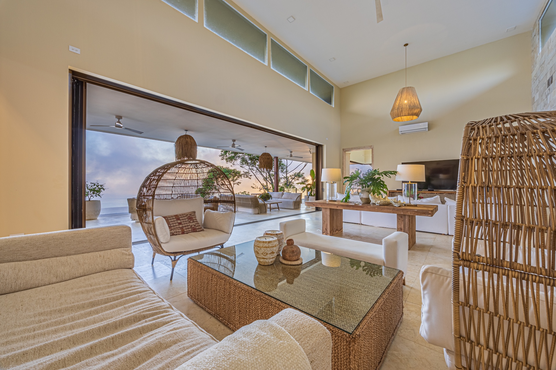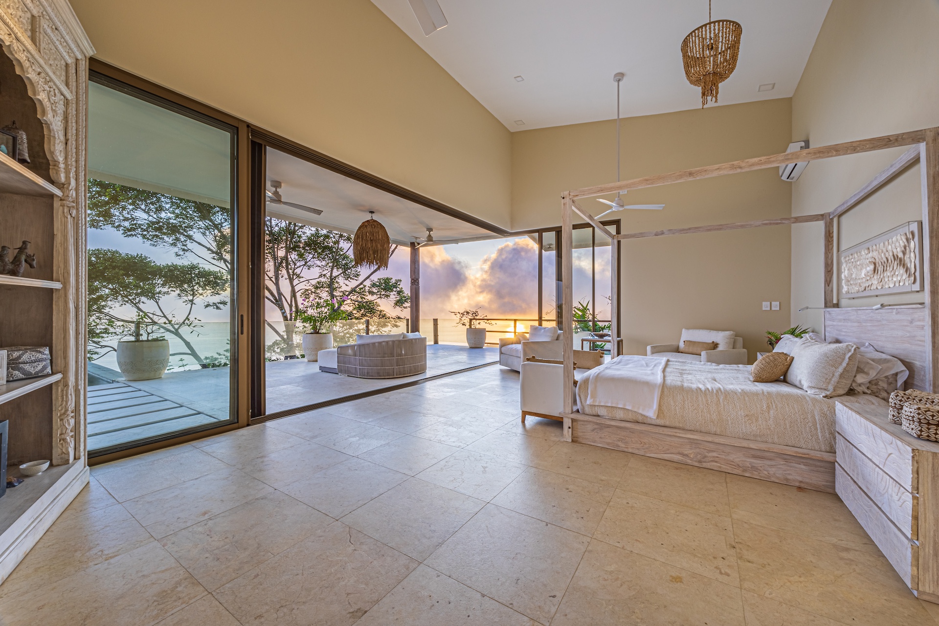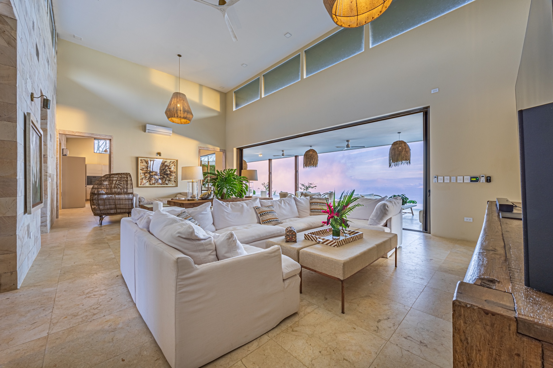 The full indoor-outdoor window systems, with retractable glass walls, allow for a seamless transition between the great room and the expansive oceanfront terrace. This terrace offers sweeping views of the Pacific Ocean, including the iconic Whale's Tail, the Osa Peninsula to the south, and Manuel Antonio National Park to the north. Whether you're entertaining guests or simply relaxing, this setting provides the perfect backdrop to enjoy Costa Rica's vibrant sunsets.