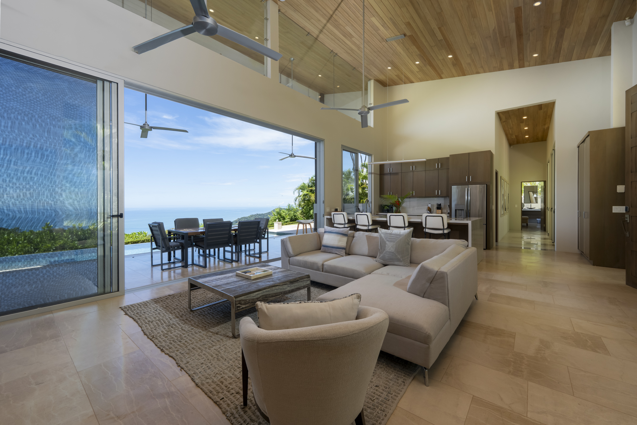Inside, the home features three spacious en-suite bedrooms, each with a private patio that invites calm and quiet reflection. The primary suite is a true sanctuary, offering a deep soaking tub and open-air rainfall shower with unobstructed views of the ocean and surrounding rainforest. A sleek, fully equipped chef's kitchen opens into a bright, open-plan living and dining area, which connects seamlessly to a covered outdoor lounge, ideal for hosting or relaxing in total privacy. The infinity-edge pool appears to float above the jungle, offering a front-row seat to toucans, howler monkeys, and seasonal whale migrations.