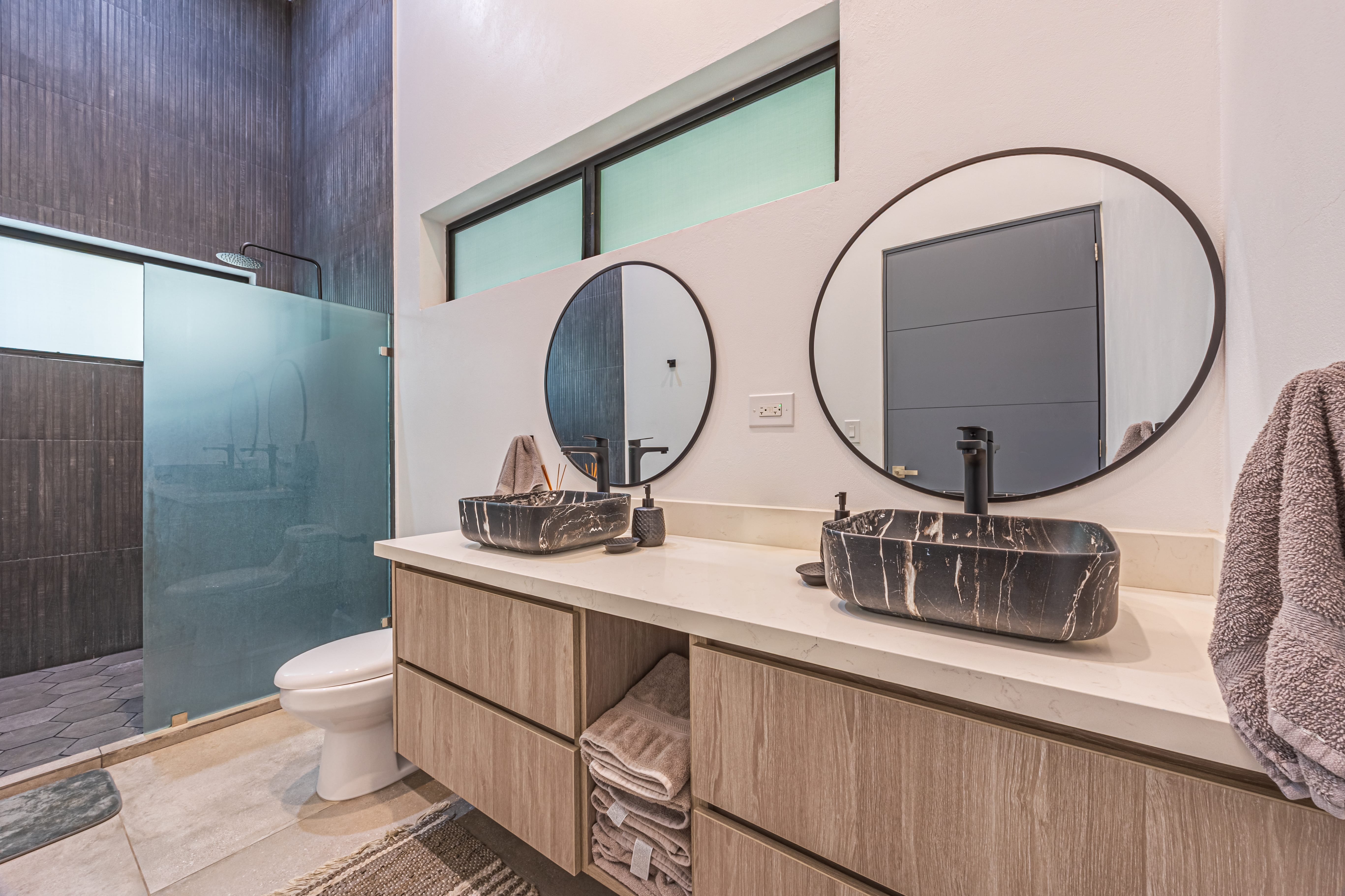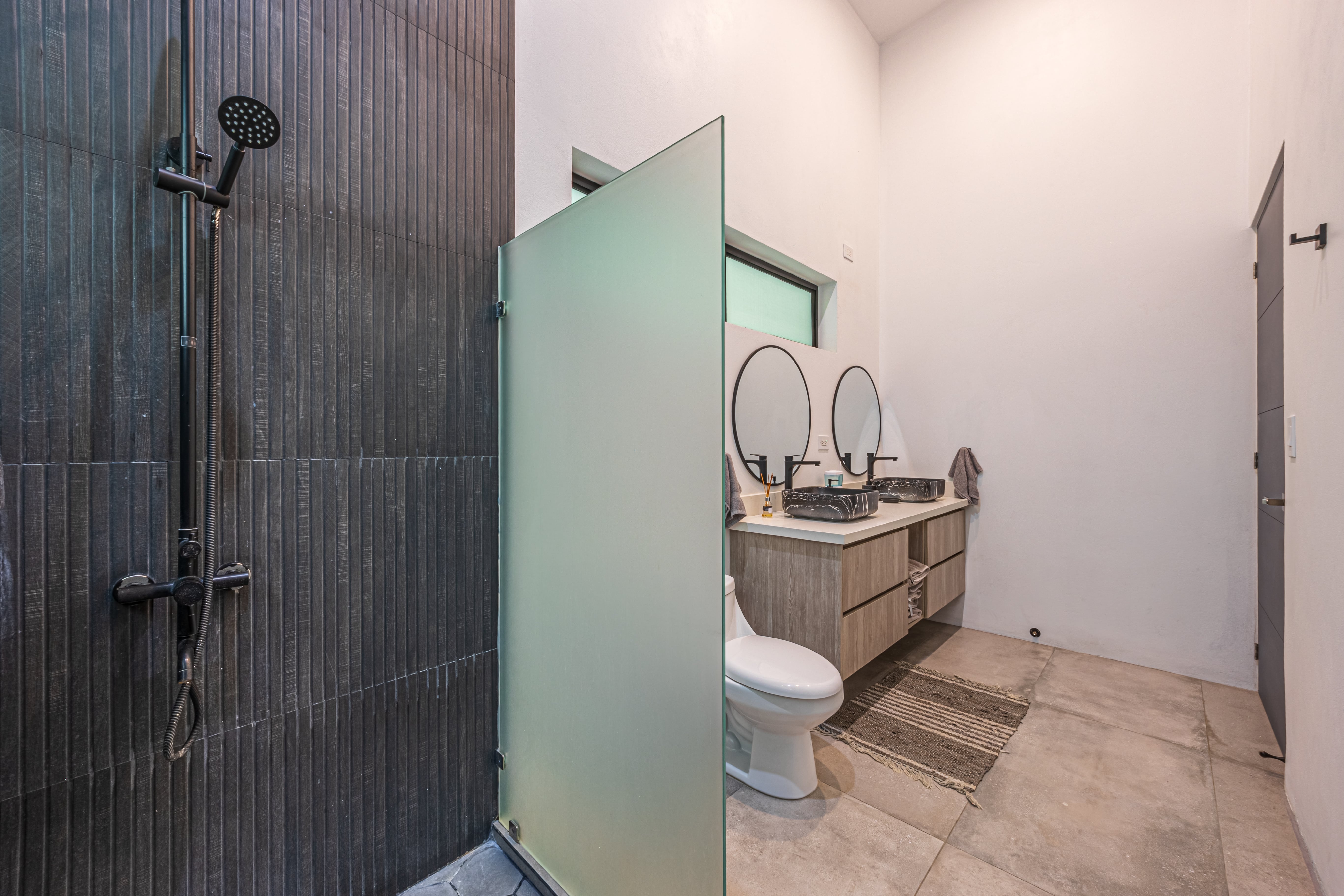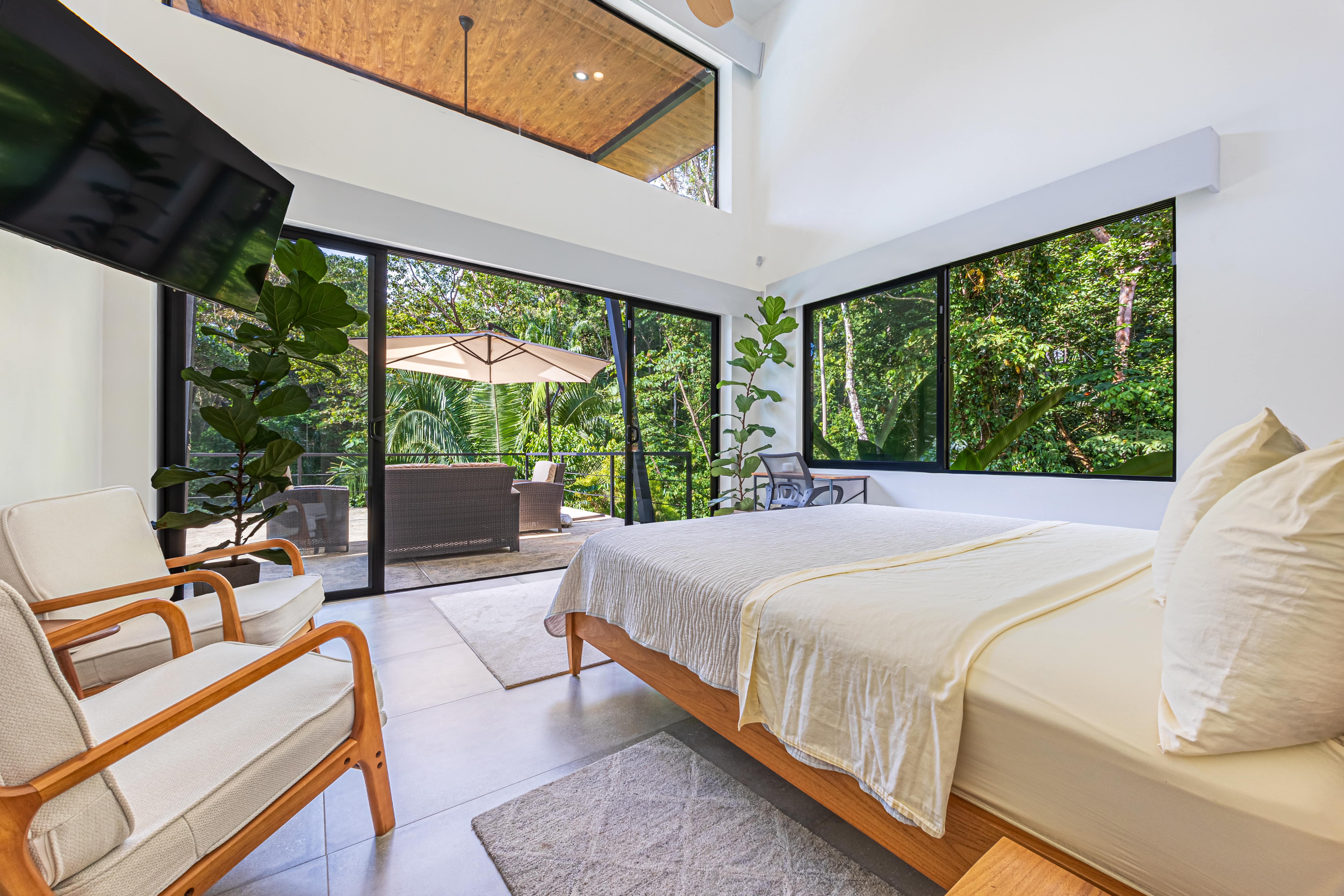 Primary Suite Upstairs: A true retreat with a spa-inspired bathroom, soaking tub with rainforest views, double vanity, walk-in closet, and private terrace with breathtaking ocean and jungle panoramas.