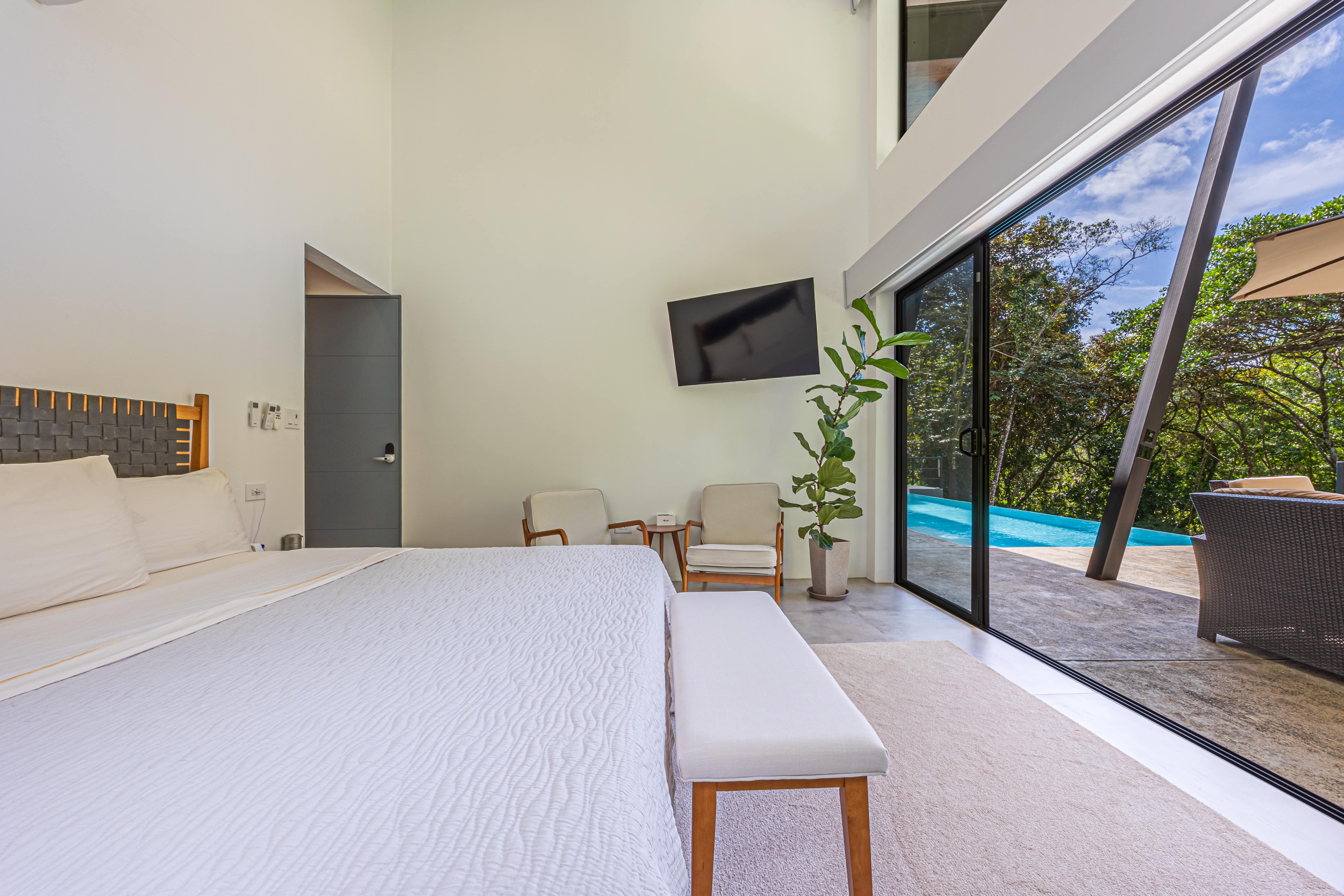 Two Additional Bedrooms: Each with air conditioning, ceiling fans, TV screen and terrace access overlooking the infinity-edge pool and jungle backdrop.