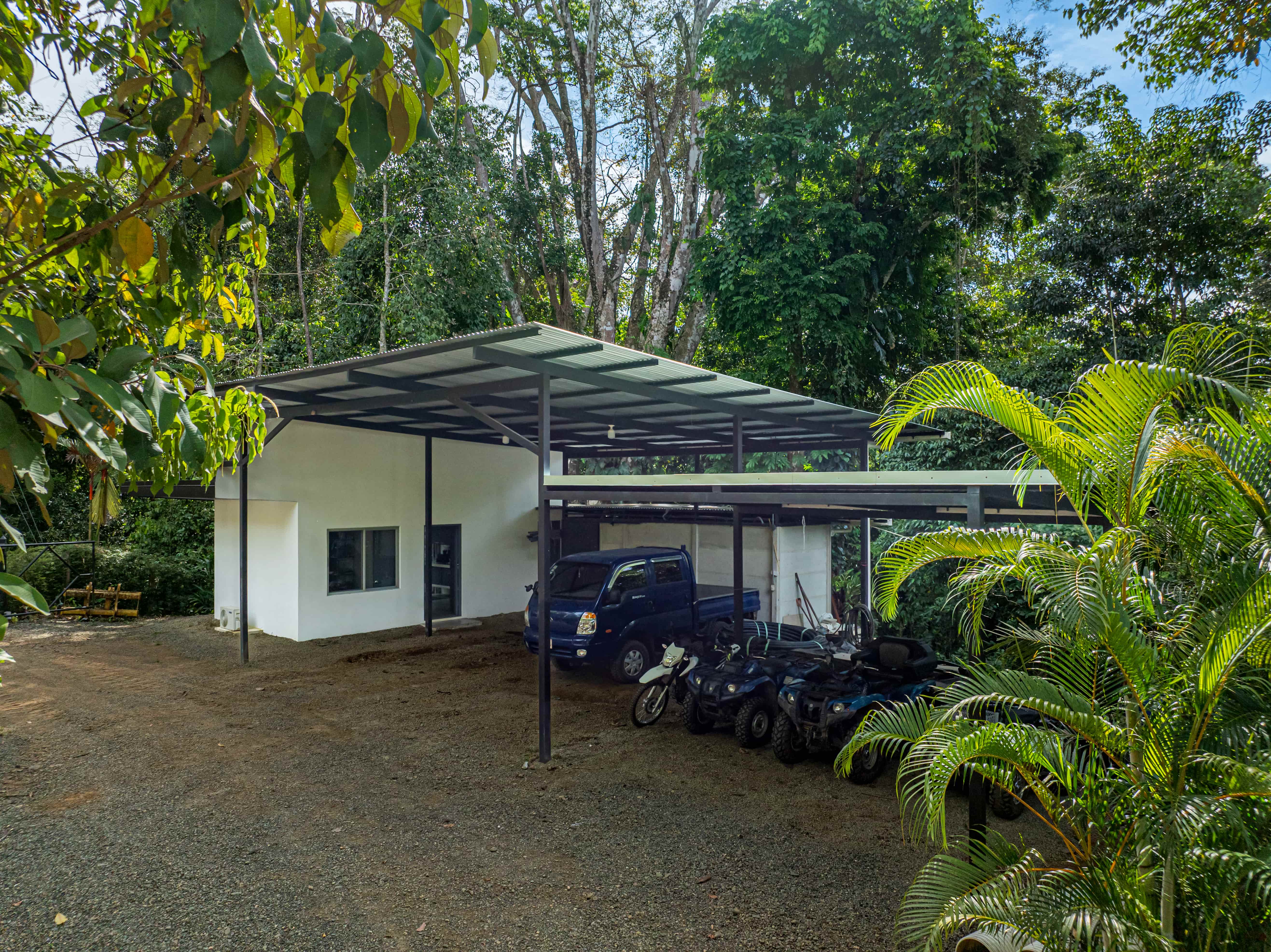 Bonus: The property features a one-bedroom guest or caretaker casita equipped with air conditioning, a kitchen, a small jungle-view terrace, and a private bathroom. Additionally, there is a spacious storage room for tools and a large covered multifunctional area that can be used to store multiple vehicles, serve as a workshop, or be enclosed to build another large home next to the guest casita.