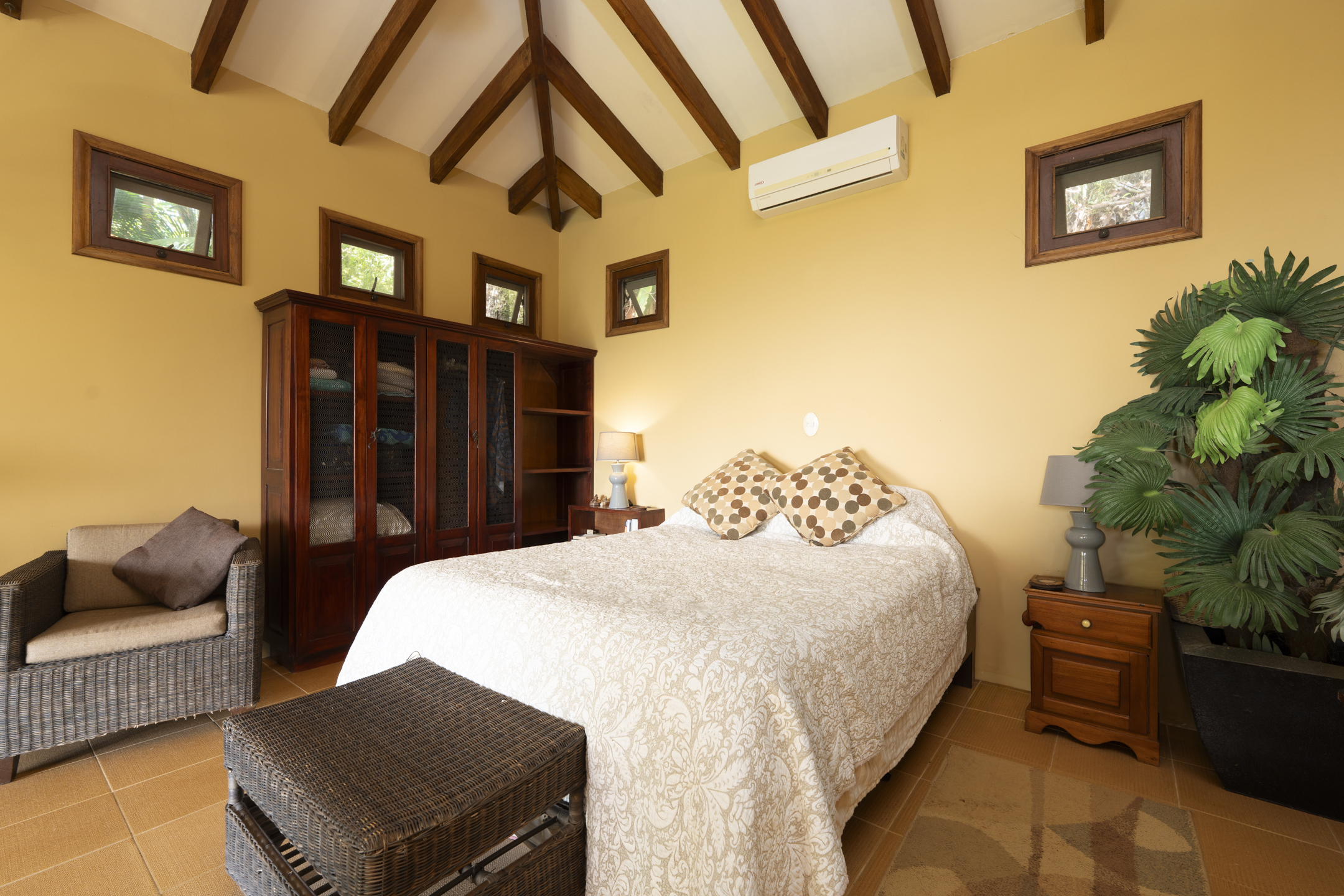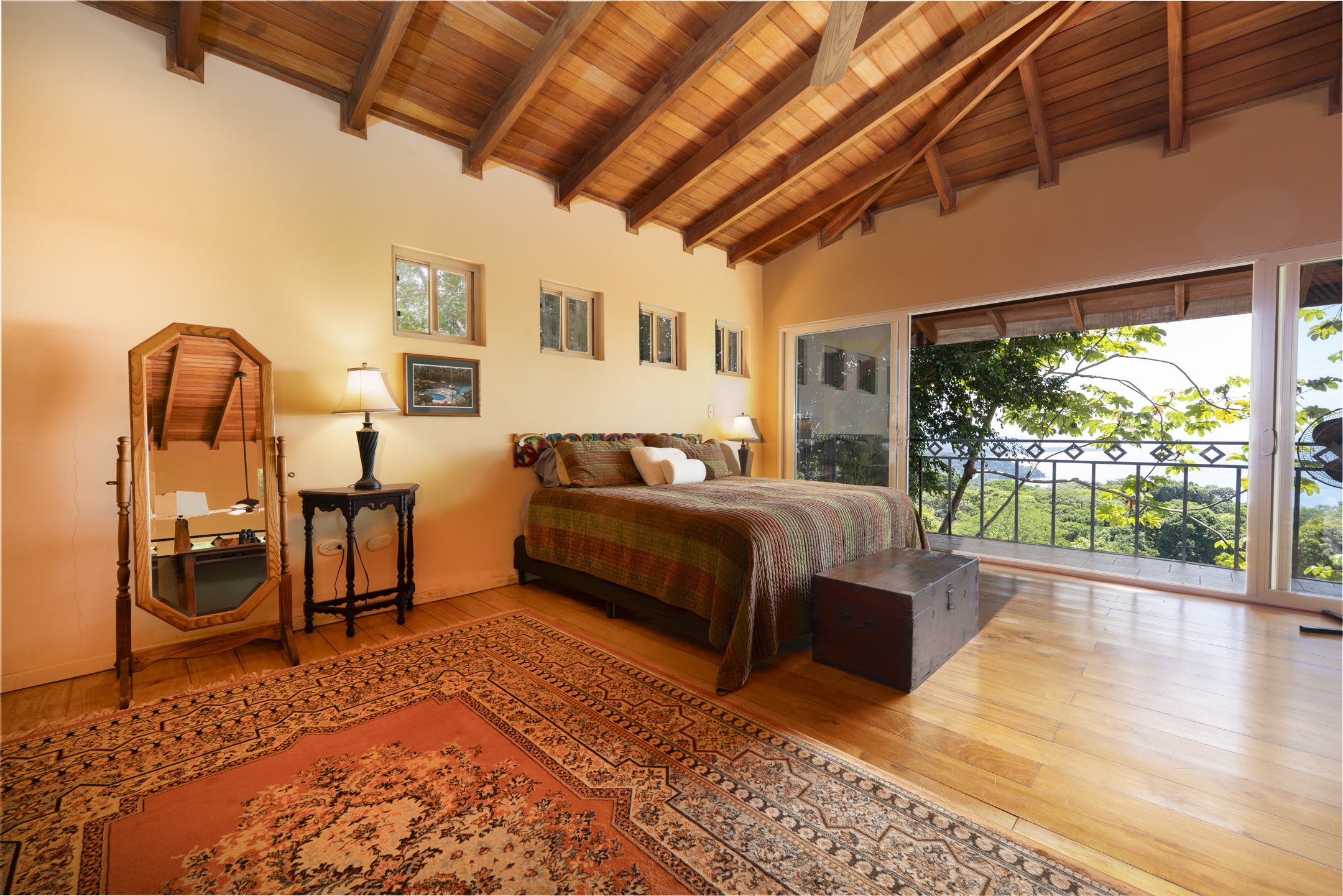 The main residence features two spacious bedrooms, generous entertaining areas, and wide glass openings that frame sweeping ocean and jungle views. Natural materials such as stone, hardwood, and artisan finishes bring warmth and authenticity to the contemporary design.