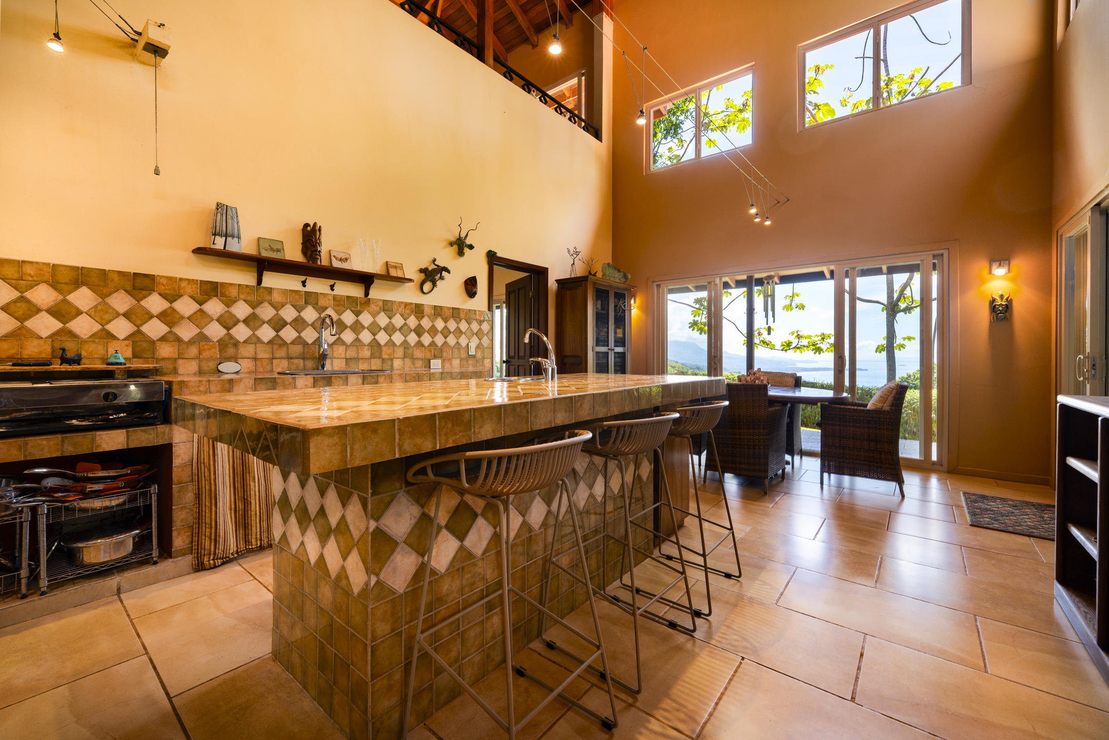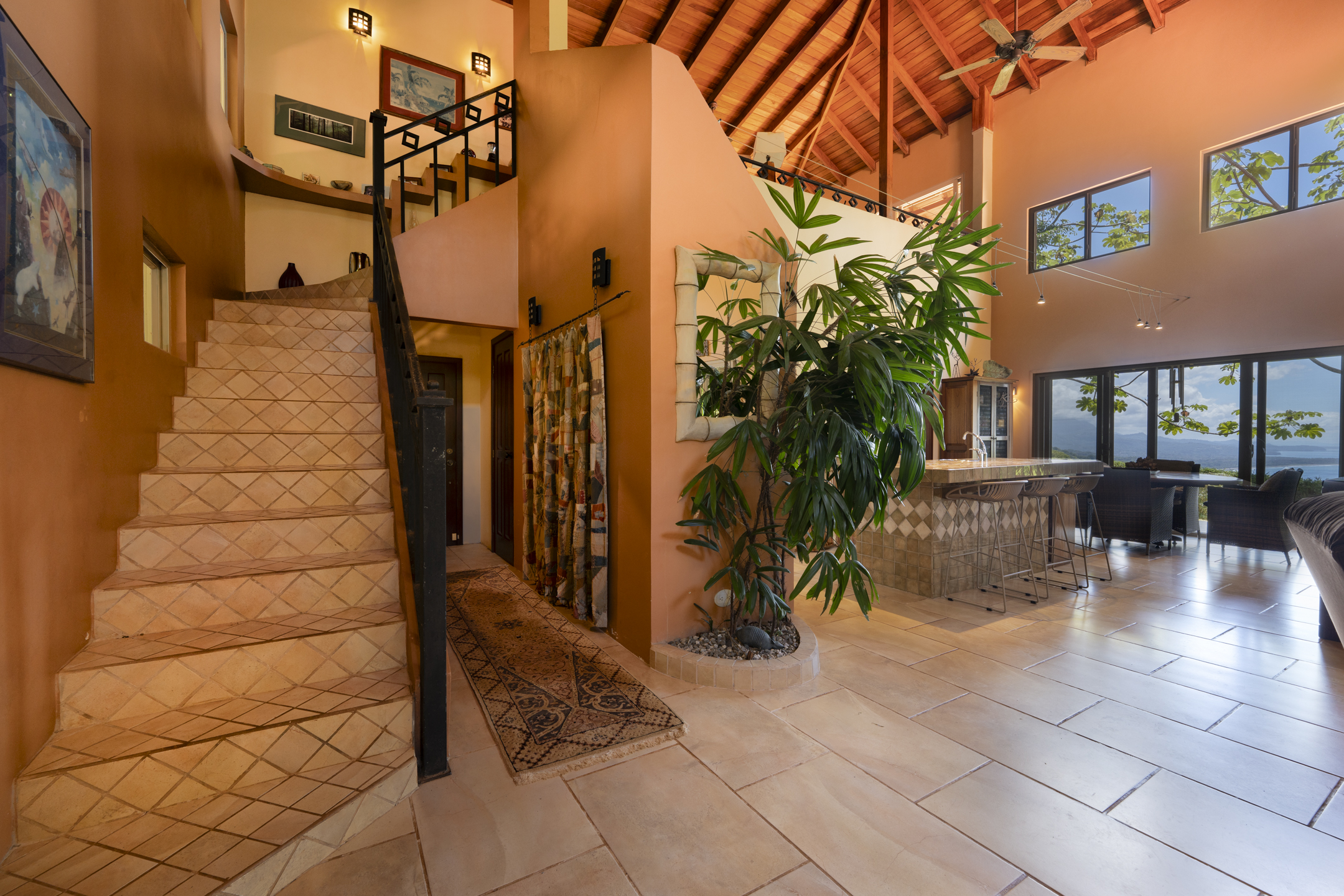 The first is the sunset view, where the Pacific horizon transforms each evening into a canvas of amber, gold, and rose. From the pool terrace and main living spaces, the sun sinks slowly into the ocean while cool breezes rise through the valley below.