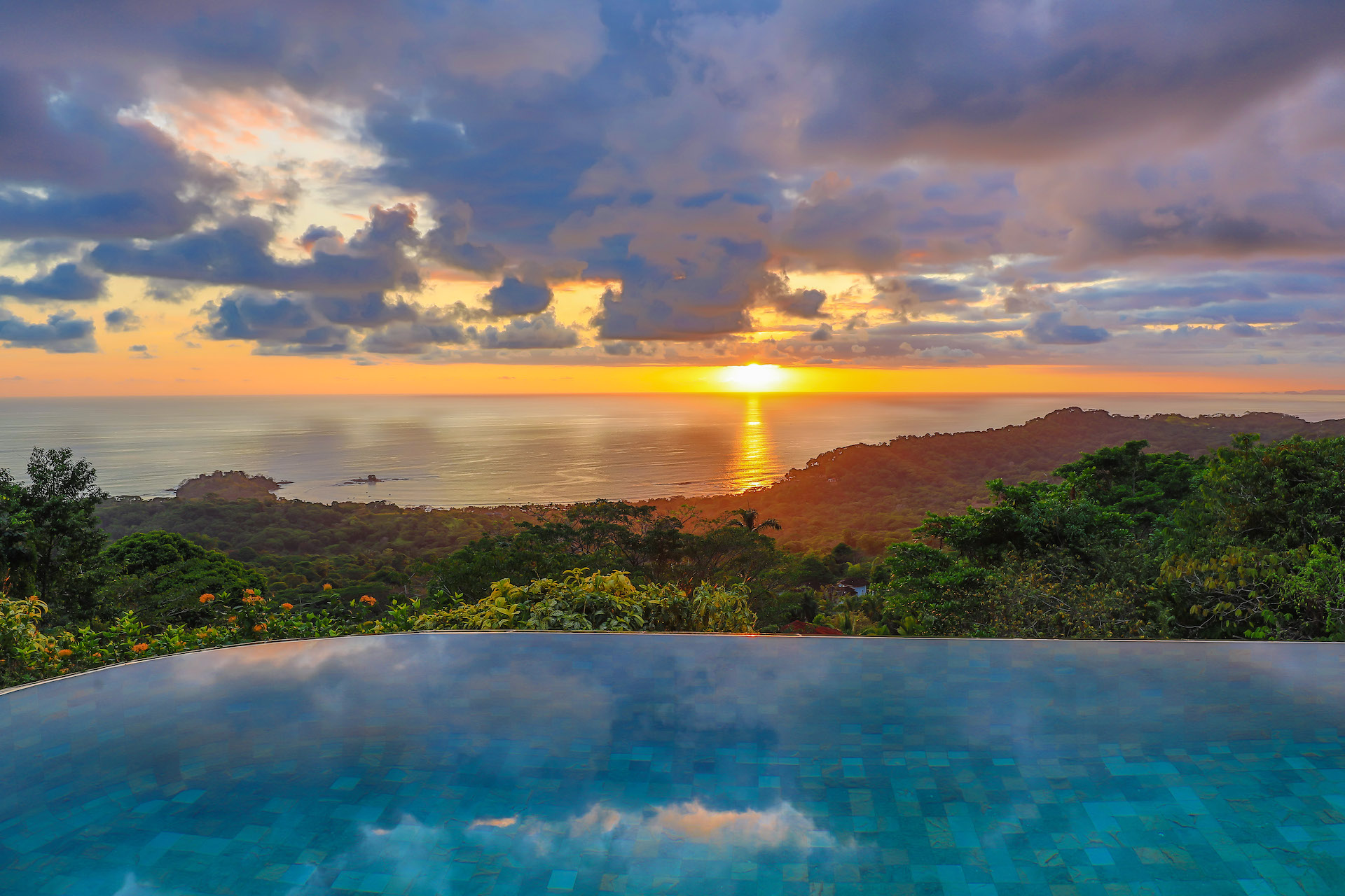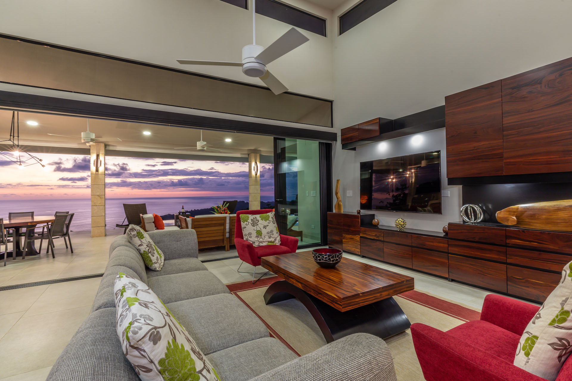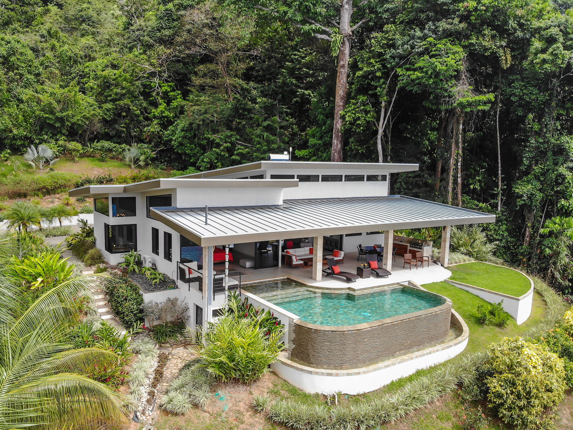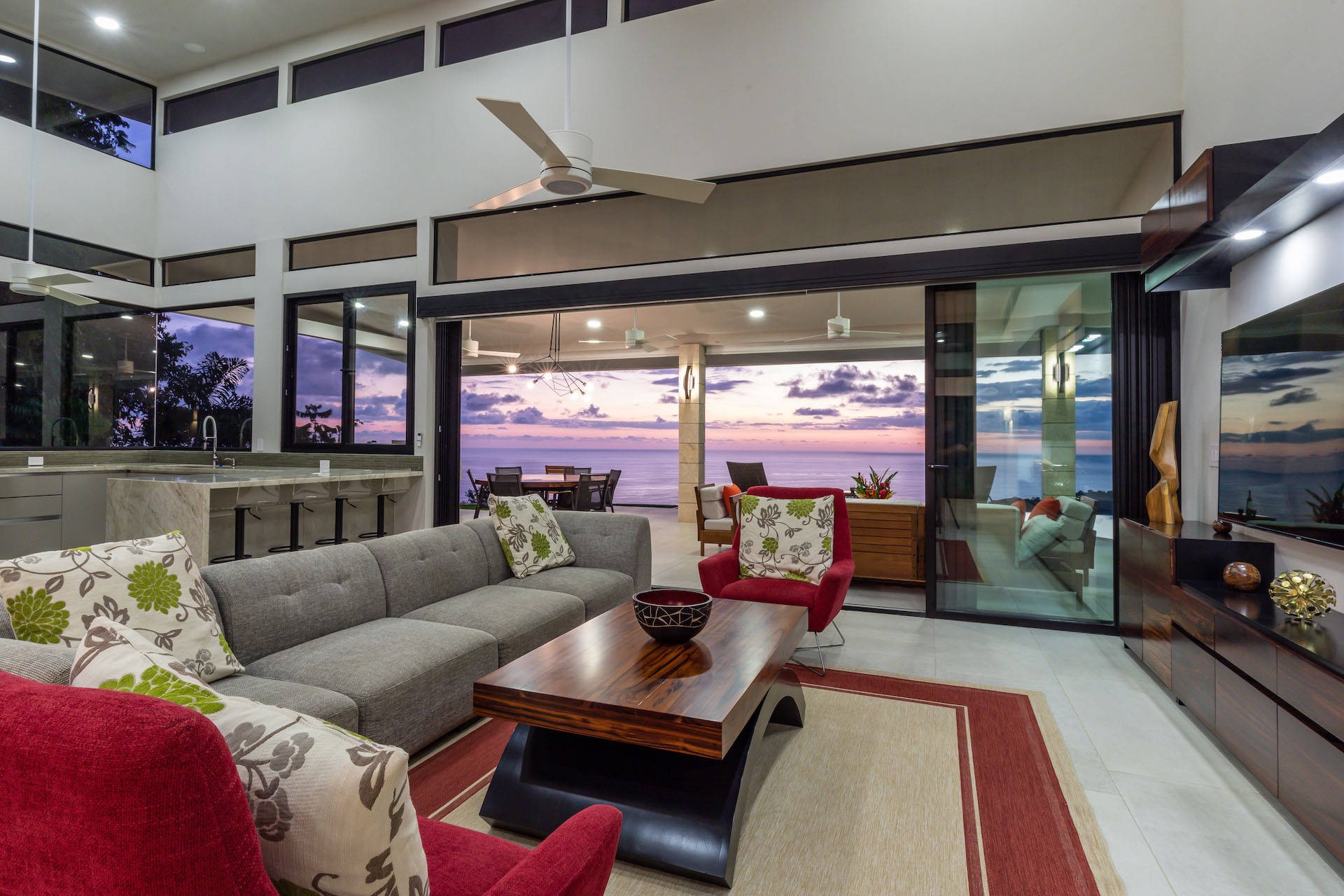 This property is a stunning luxury estate that sits at the top of Marina Vista 2 in Dominicalito, Costa Rica. One of the few ocean view properties that have sunsets dropping into the Pacific 365 days of the year, plus... you\'ll be entertained by the abundant wildlife in the primary jungle wrapping the house. There is an electronic gate at the entrance of the development and another personal electronic gate for the property which is at the end of the road; the property puts a premium on privacy. The land measures 6.57 acres (2.66 hectares) and includes guardian ceiba trees standing nearly 200 feet tall.\n\nThe 3,200 sq. ft. contemporary-modern residence features 3 large bedrooms and 3.5 bathrooms, all with high-end finishes. The ocean view master suite is spacious and stunning. A king bed, air conditioning (although you won't need it at 1,400 ft. elevation), and large sliding glass doors are just a few elements that will enrich your living experience. The master bath could be the most luxurious room in the home... enjoy a large walk-in closet, ocean view rain shower, plus dual stone basins and a custom stone bathtub all imported from Indonesia.\n\nThe second and third bedrooms (north and south of the entry) are en suite, and the south bedroom has a walk-out to a small jungle view patio. The wildlife is very active here, and you will enjoy daily sightings of white-faced and howler monkeys, toucans, and parrots among many other bird and animal species. All bedrooms are equipped with air conditioning, closets, and high-end finishes. In the great room, there is an extra half-bath with a gorgeous marble sink.\n\nThe modern kitchen has imported Italian cabinets, quality stainless steel fixtures, and Frigidaire Professional appliances. Whether leisurely washing dishes while taking in the ocean view, watching the kids in the swimming pool, or entertaining guests in the great room, the kitchen design is bright and open. The home comes fully furnished with a variety of custom hardwood pieces, including--Cristobal, Nazareno, Teca, Ojoche, and more.\n\nMost of your waking life in Costa Rica spent outside. An expansive, ocean-view patio spans the entire length of the house. The outdoor dining area has a large round table with 6 chairs, a stainless grill, and stainless steel sink all trimmed in coralina. In the middle, you have a second living room area with a long couch, chairs, and tables. On the master side of the patio, there are two couches perfect for reading or a nap. Just a few steps away, you reach the infinity swimming pool with stunning natural stone tiles that spill into an endless horizon. There is a sloped beach for those wanting to relax and a wider section for those wanting some exercise. The breeze blows up from the ocean by day, and down from the mountain by night... the temperatures are close to ideal.\n\nIf you are returning muddily from hiking, you can enter through the laundry/mud-room and save time from cleaning the pristine floors. In fact, there is a gorgeous private trail on the property that leads to a giant Ceiba tree and beyond. The property has filtered water provided by a legal, documented well and holding tanks. There is the perfect spot to add an ocean view casita or just enjoy the immaculate gardens, with its many fruit trees, as it is.\n\nSitting at the top of quiet, secure development, this home is your luxury escape in the jungle.