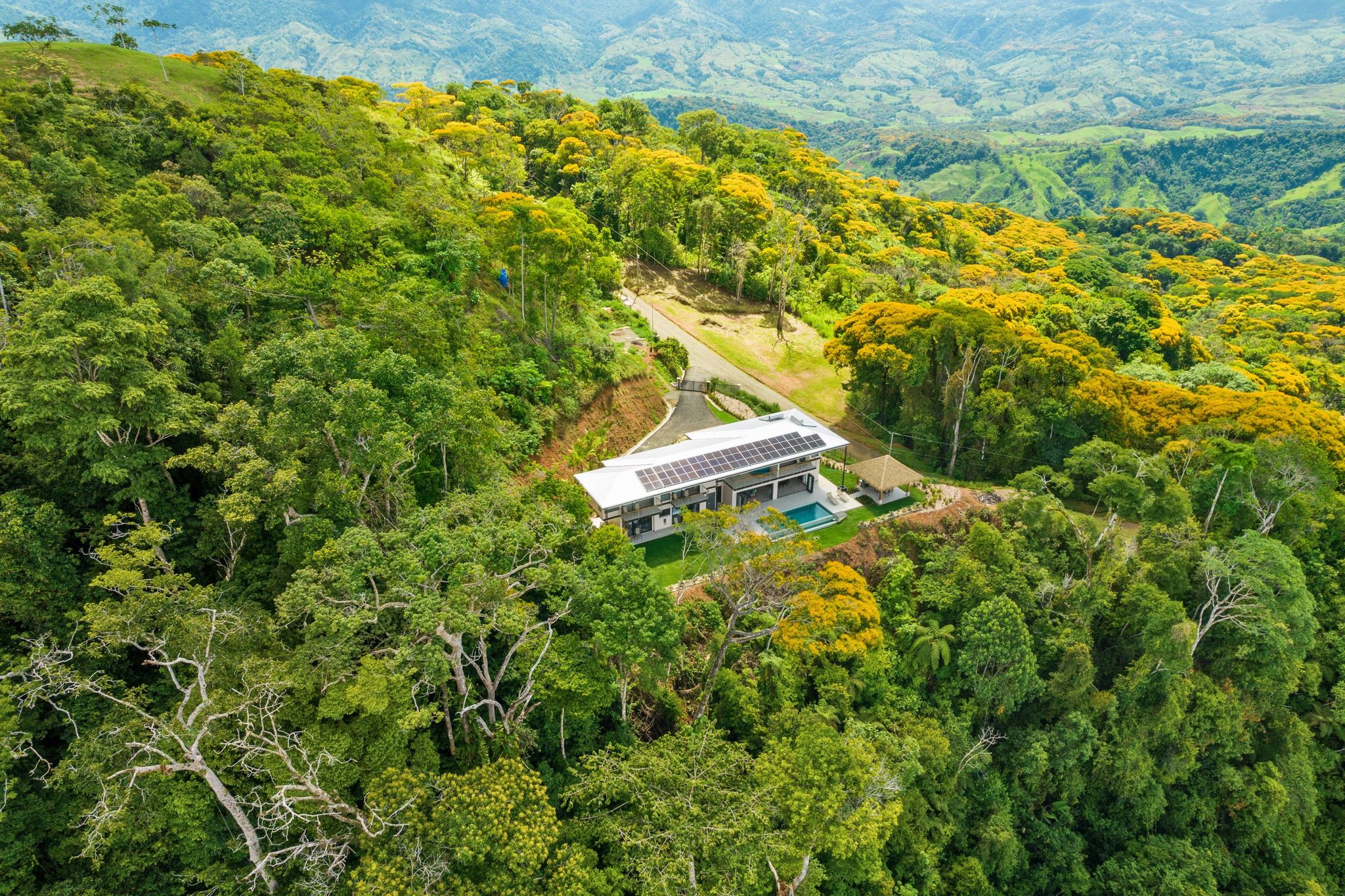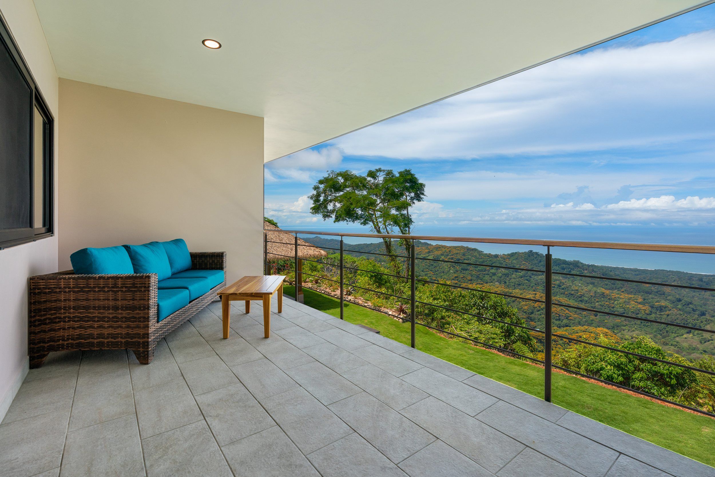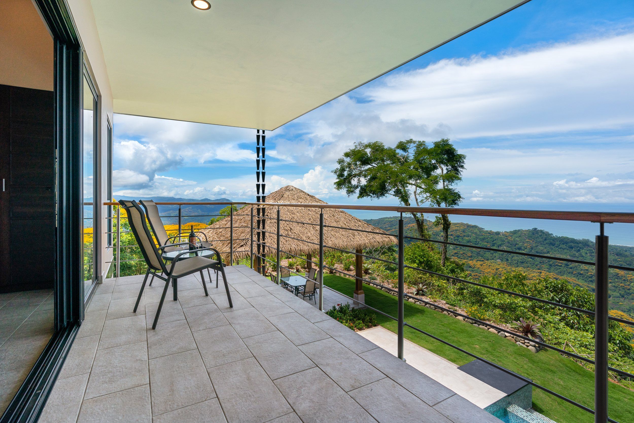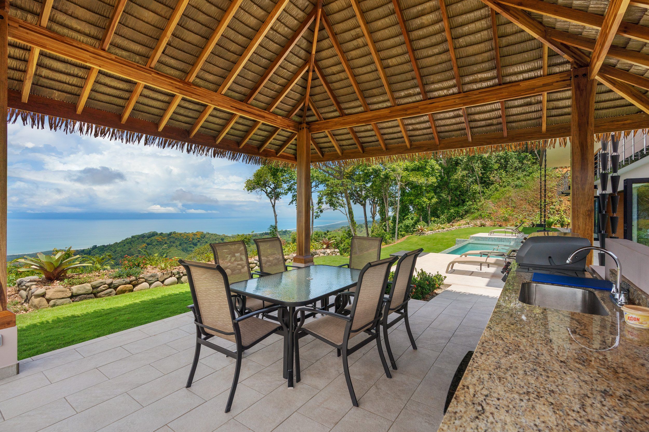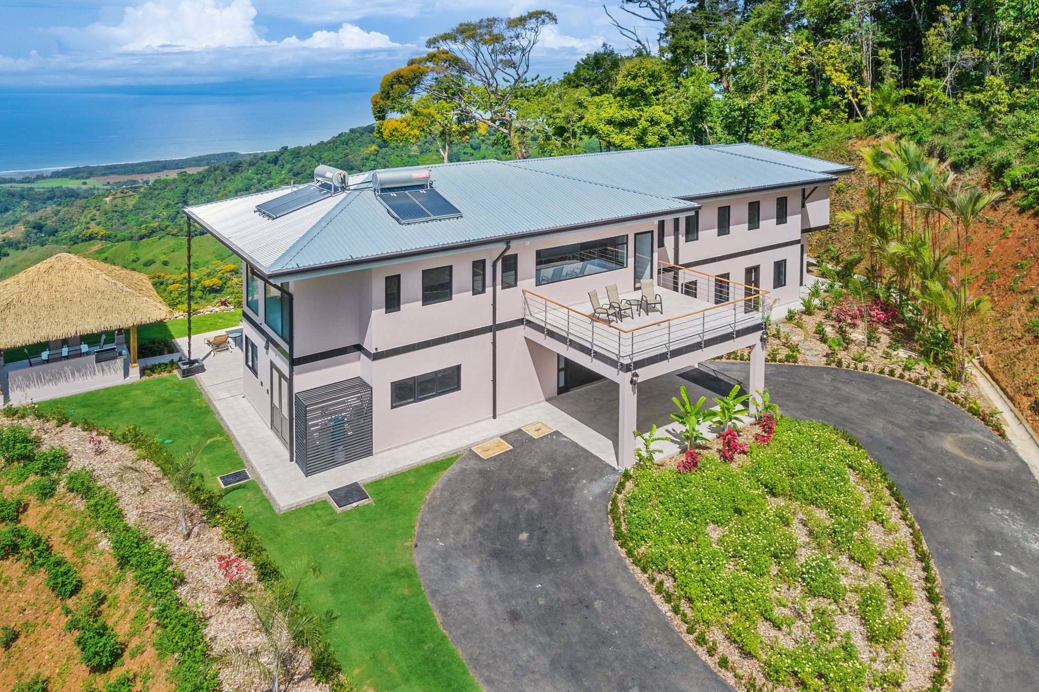 Brand new 5 bedroom and 4.5 bath luxury home perched on the mountain top of Lagunas near beach town of Dominical. Absolutely stunning ocean, coastline, mountain, and valley views in every direction. The home was recently completed this year and ready for a new owner to enjoy as their own private estate or rent out as the ultimate vacation rental!\n\nArrive through the electronic gates and drive up the paved private driveway with covered parking right at the front door. Then walk in to the expansive living room, dining room, and kitchen with sliding glass rear wall opening completely to the infinity pool and outdoor covered rancho with BBQ area. Downstairs there a half bath for guests that also has access from the pool area. Down the long hallways are two bedrooms with a full bath in between.\n\nUpstairs there is a secondary living room/den with wet bar. Also two balconies one on the mountain and valley side for sunrises and the ocean side for sunsets. The principal bedroom has its own private balcony and enormous ensuite bathroom with ocean view shower and soaking tub. Two more bedrooms with full baths and their own private balconies complete the upstairs.\n\nThe entire house has Laurel wood ceilings, porcelain tile, and granite counter tops throughout. Not often there is a 5 bedroom home on the market! And this home stands out for its occupancy potential, outstanding panoramic views, elevation for cooler breezes and temps day and night, and location 15 minutes to Dominical.