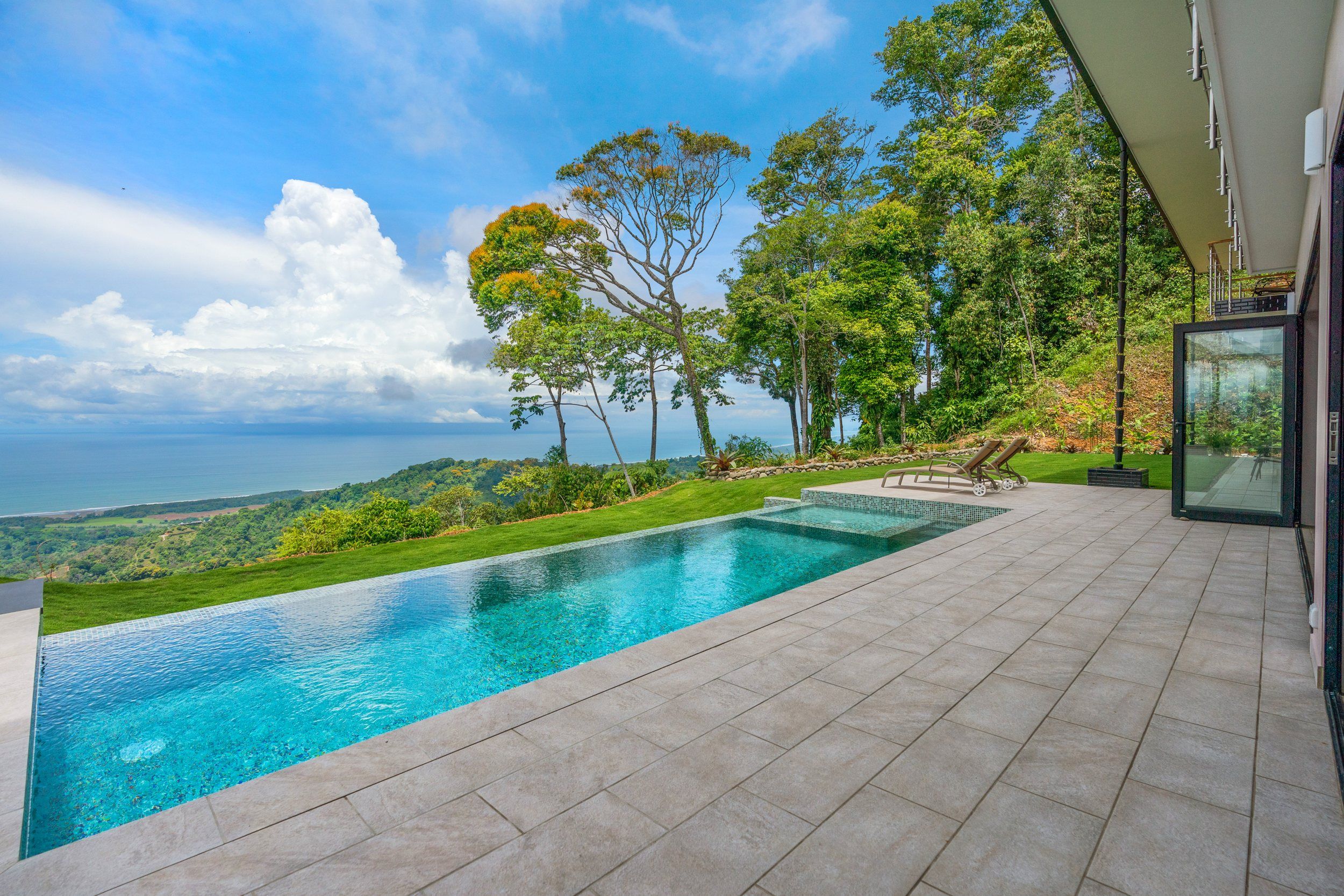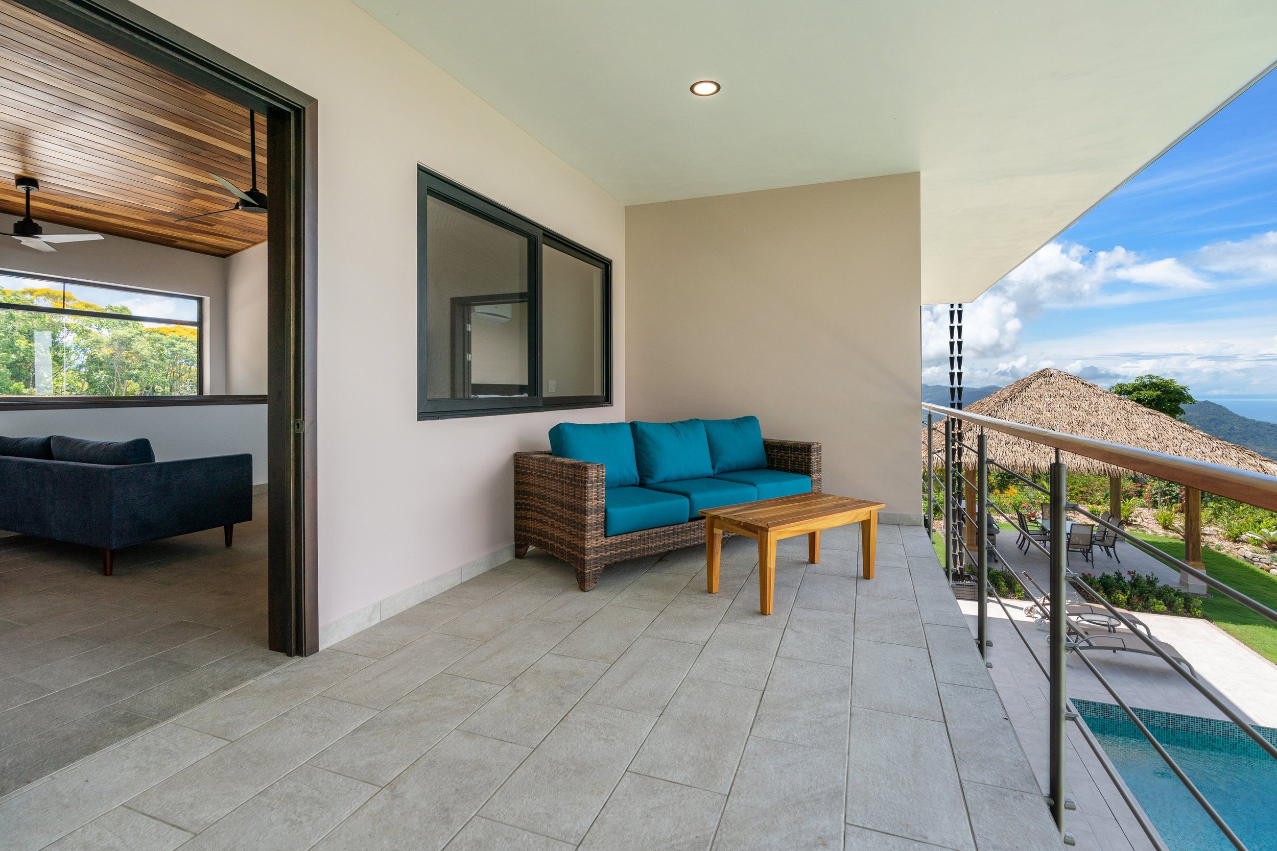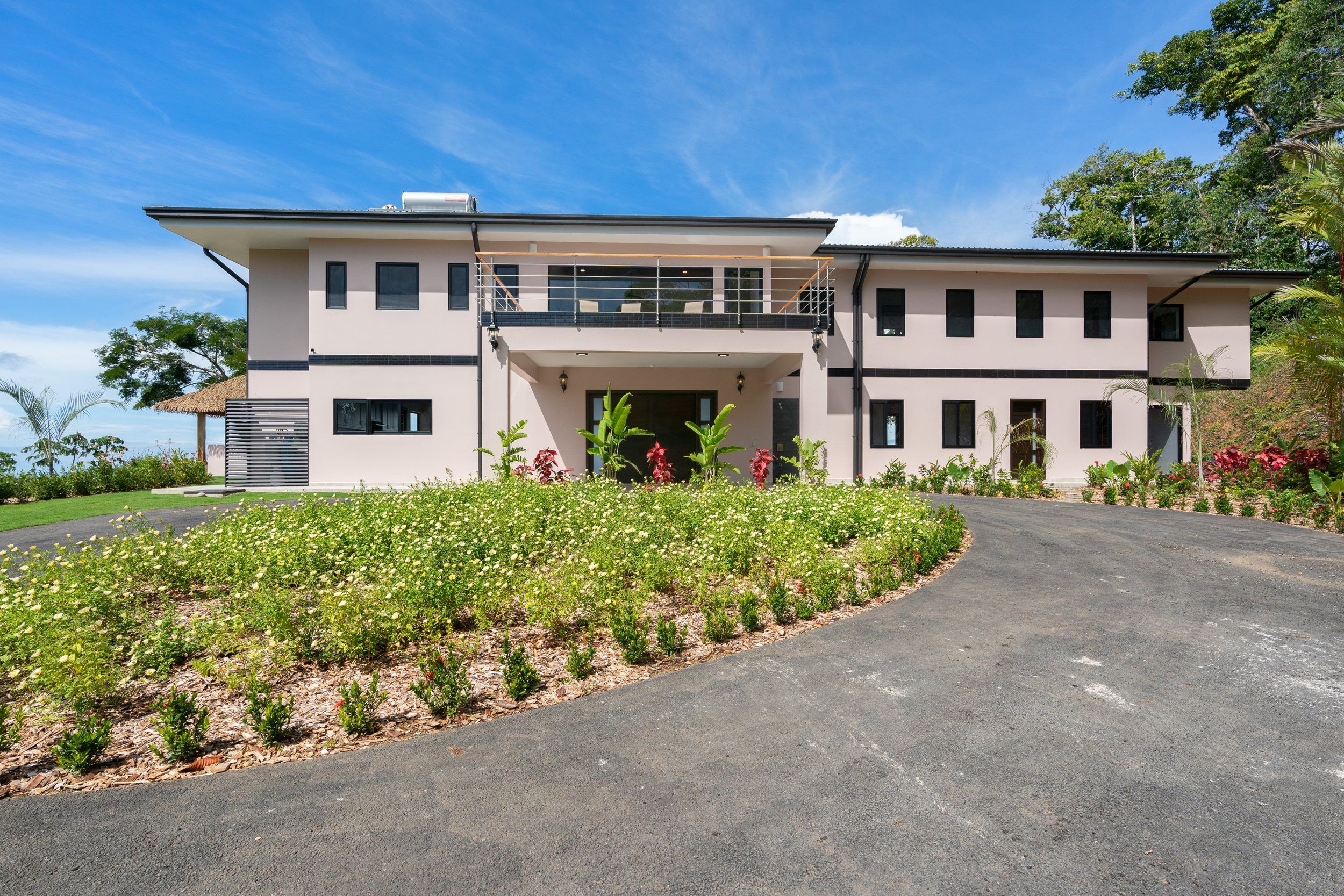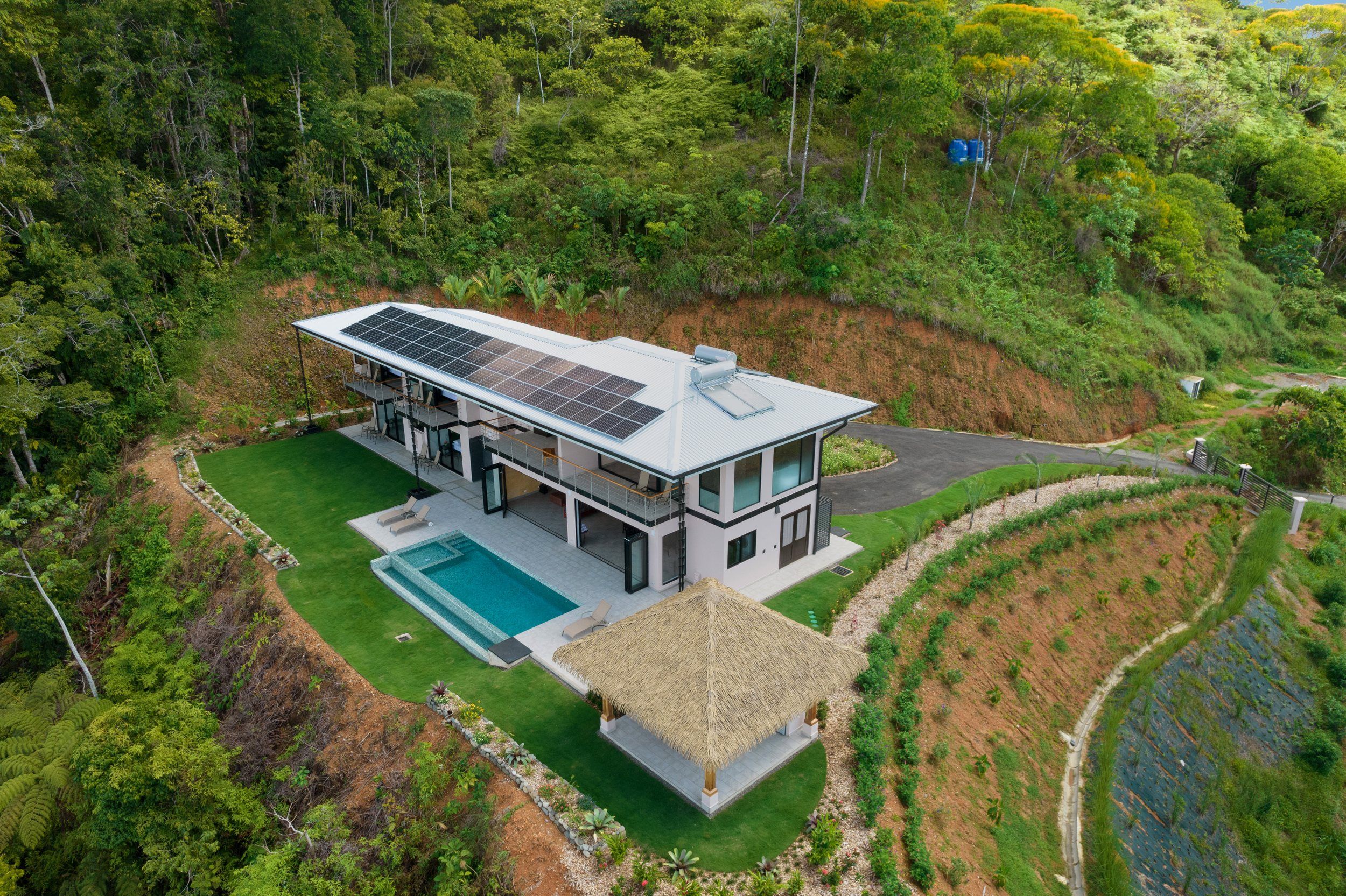 Brand new 5 bedroom and 4.5 bath luxury home perched on the mountain top of Lagunas near beach town of Dominical. Absolutely stunning ocean, coastline, mountain, and valley views in every direction. The home was recently completed this year and ready for a new owner to enjoy as their own private estate or rent out as the ultimate vacation rental!\n\nArrive through the electronic gates and drive up the paved private driveway with covered parking right at the front door. Then walk in to the expansive living room, dining room, and kitchen with sliding glass rear wall opening completely to the infinity pool and outdoor covered rancho with BBQ area. Downstairs there a half bath for guests that also has access from the pool area. Down the long hallways are two bedrooms with a full bath in between.\n\nUpstairs there is a secondary living room/den with wet bar. Also two balconies one on the mountain and valley side for sunrises and the ocean side for sunsets. The principal bedroom has its own private balcony and enormous ensuite bathroom with ocean view shower and soaking tub. Two more bedrooms with full baths and their own private balconies complete the upstairs.\n\nThe entire house has Laurel wood ceilings, porcelain tile, and granite counter tops throughout. Not often there is a 5 bedroom home on the market! And this home stands out for its occupancy potential, outstanding panoramic views, elevation for cooler breezes and temps day and night, and location 15 minutes to Dominical.