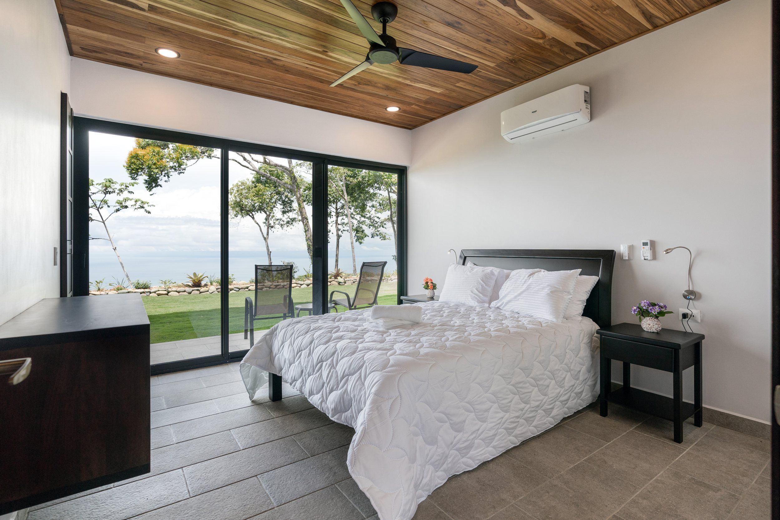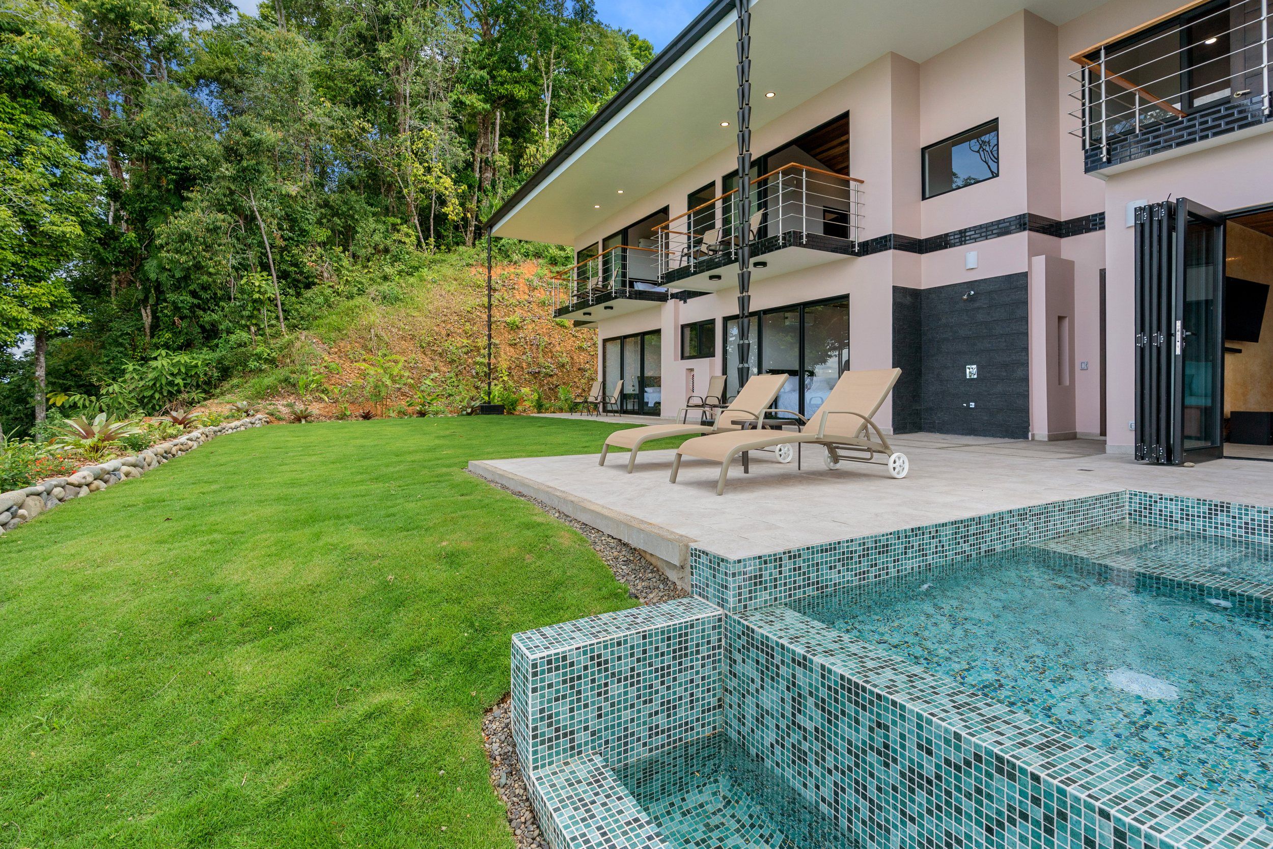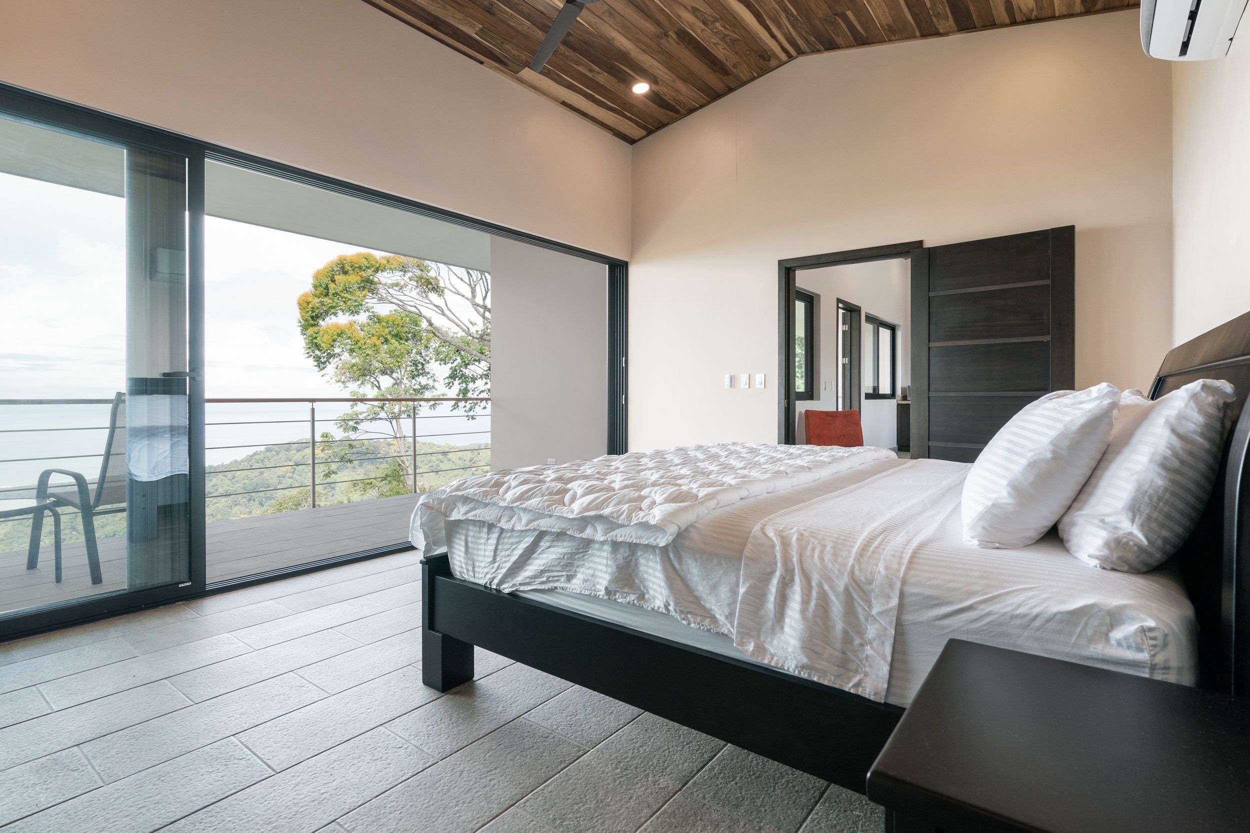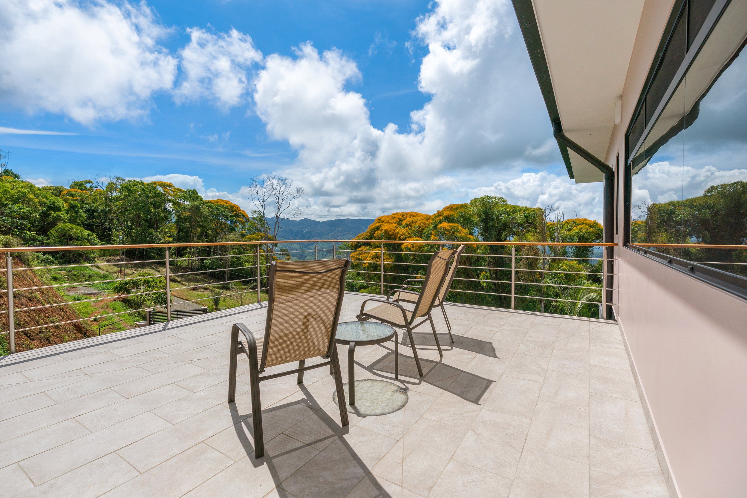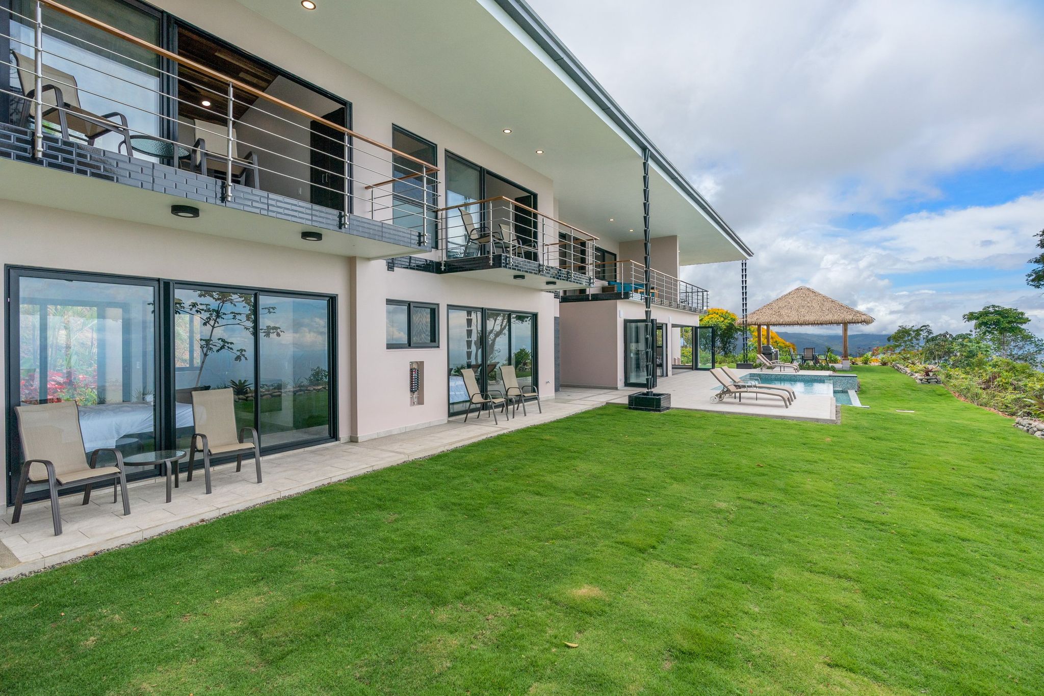 Brand new 5 bedroom and 4.5 bath luxury home perched on the mountain top of Lagunas near beach town of Dominical. Absolutely stunning ocean, coastline, mountain, and valley views in every direction. The home was recently completed this year and ready for a new owner to enjoy as their own private estate or rent out as the ultimate vacation rental!\n\nArrive through the electronic gates and drive up the paved private driveway with covered parking right at the front door. Then walk in to the expansive living room, dining room, and kitchen with sliding glass rear wall opening completely to the infinity pool and outdoor covered rancho with BBQ area. Downstairs there a half bath for guests that also has access from the pool area. Down the long hallways are two bedrooms with a full bath in between.\n\nUpstairs there is a secondary living room/den with wet bar. Also two balconies one on the mountain and valley side for sunrises and the ocean side for sunsets. The principal bedroom has its own private balcony and enormous ensuite bathroom with ocean view shower and soaking tub. Two more bedrooms with full baths and their own private balconies complete the upstairs.\n\nThe entire house has Laurel wood ceilings, porcelain tile, and granite counter tops throughout. Not often there is a 5 bedroom home on the market! And this home stands out for its occupancy potential, outstanding panoramic views, elevation for cooler breezes and temps day and night, and location 15 minutes to Dominical.