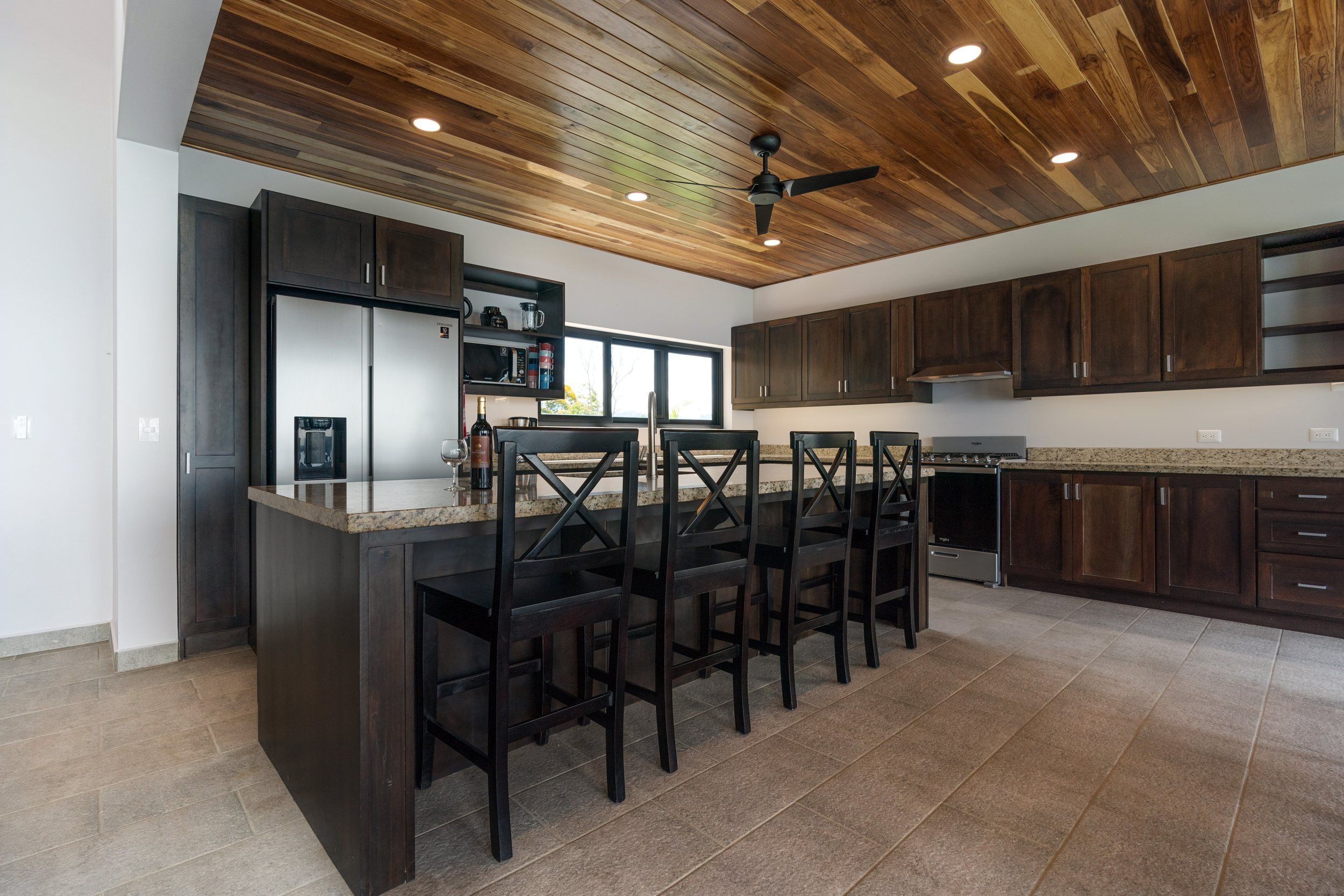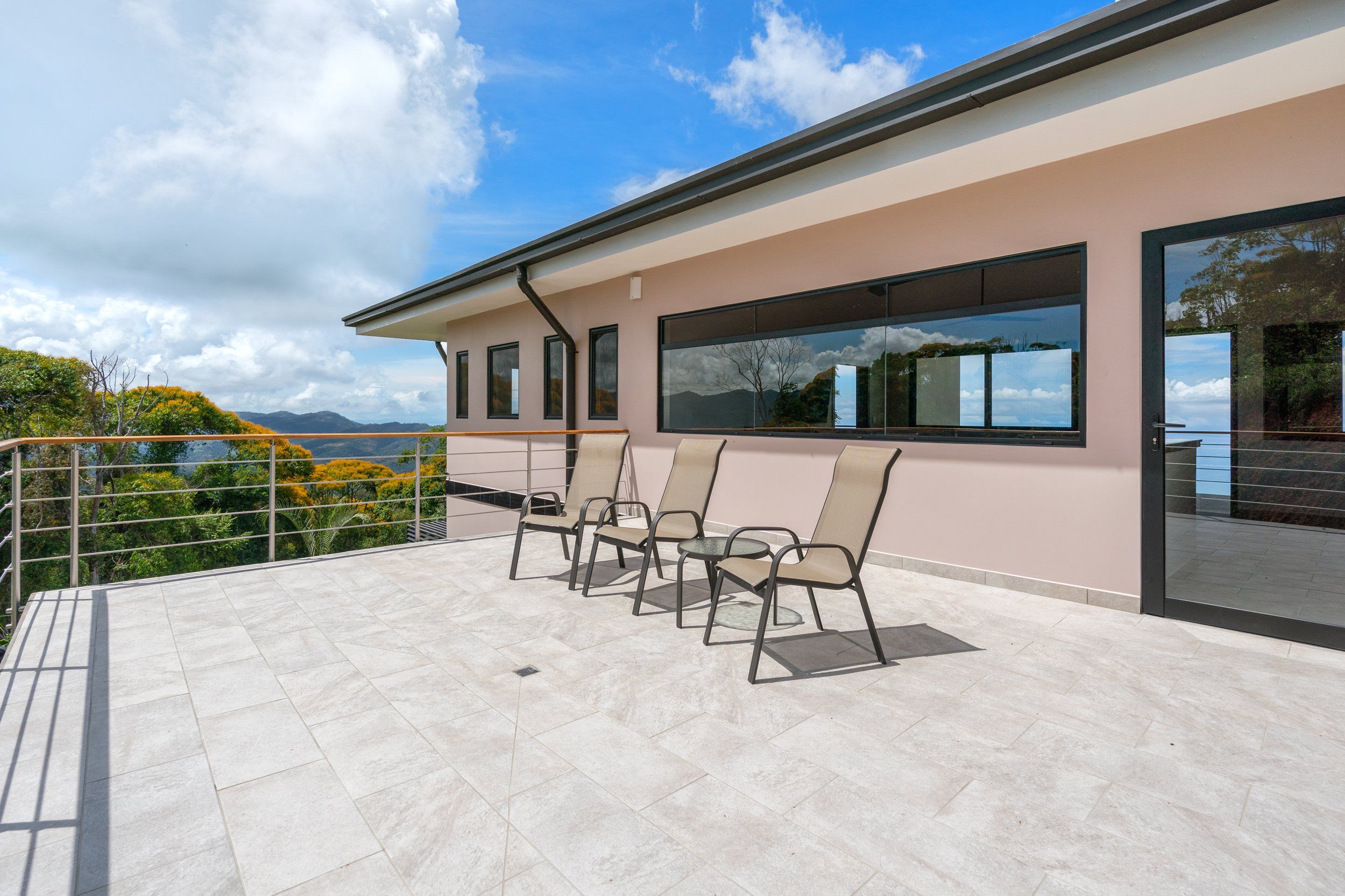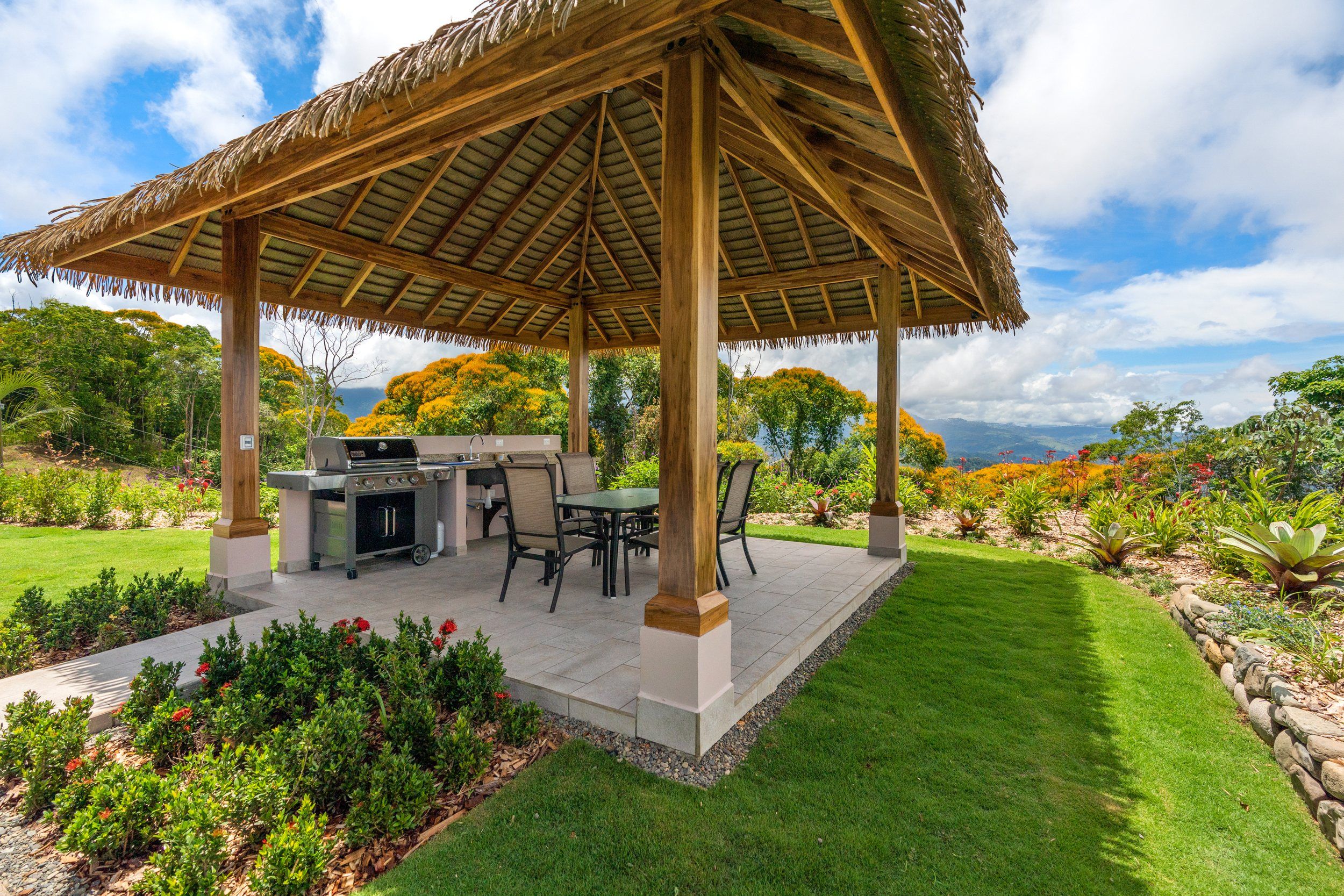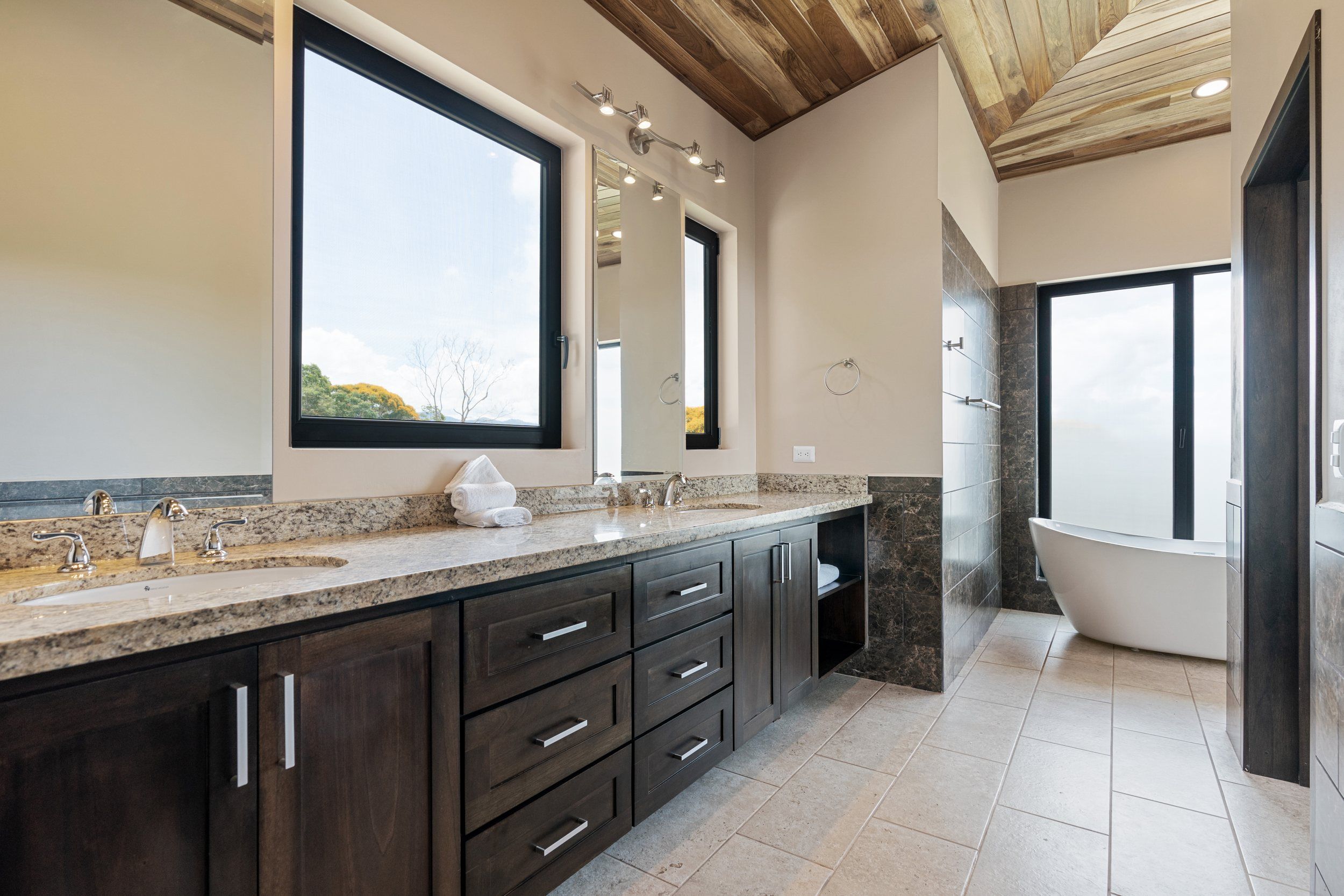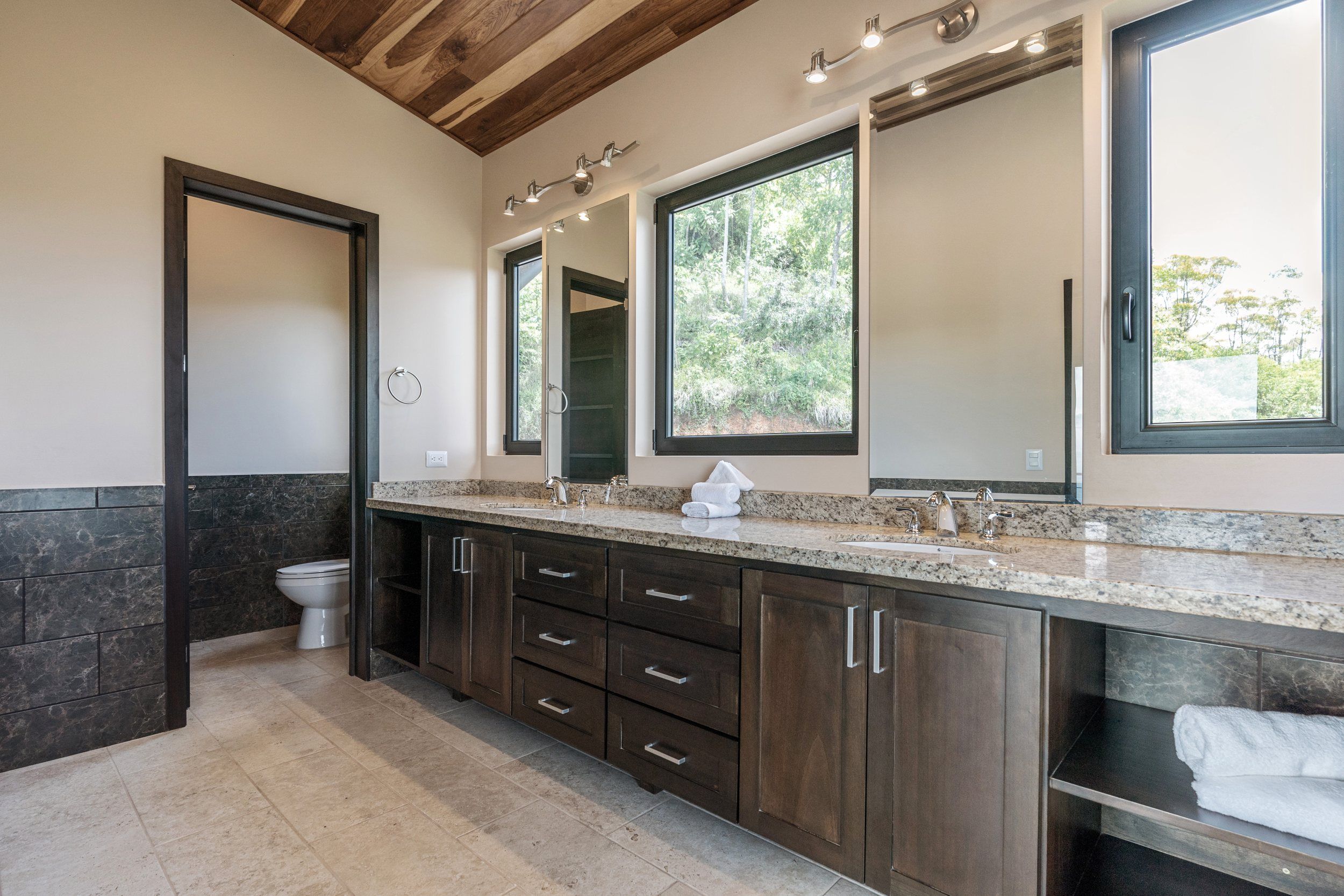 Brand new 5 bedroom and 4.5 bath luxury home perched on the mountain top of Lagunas near beach town of Dominical. Absolutely stunning ocean, coastline, mountain, and valley views in every direction. The home was recently completed this year and ready for a new owner to enjoy as their own private estate or rent out as the ultimate vacation rental!\n\nArrive through the electronic gates and drive up the paved private driveway with covered parking right at the front door. Then walk in to the expansive living room, dining room, and kitchen with sliding glass rear wall opening completely to the infinity pool and outdoor covered rancho with BBQ area. Downstairs there a half bath for guests that also has access from the pool area. Down the long hallways are two bedrooms with a full bath in between.\n\nUpstairs there is a secondary living room/den with wet bar. Also two balconies one on the mountain and valley side for sunrises and the ocean side for sunsets. The principal bedroom has its own private balcony and enormous ensuite bathroom with ocean view shower and soaking tub. Two more bedrooms with full baths and their own private balconies complete the upstairs.\n\nThe entire house has Laurel wood ceilings, porcelain tile, and granite counter tops throughout. Not often there is a 5 bedroom home on the market! And this home stands out for its occupancy potential, outstanding panoramic views, elevation for cooler breezes and temps day and night, and location 15 minutes to Dominical.