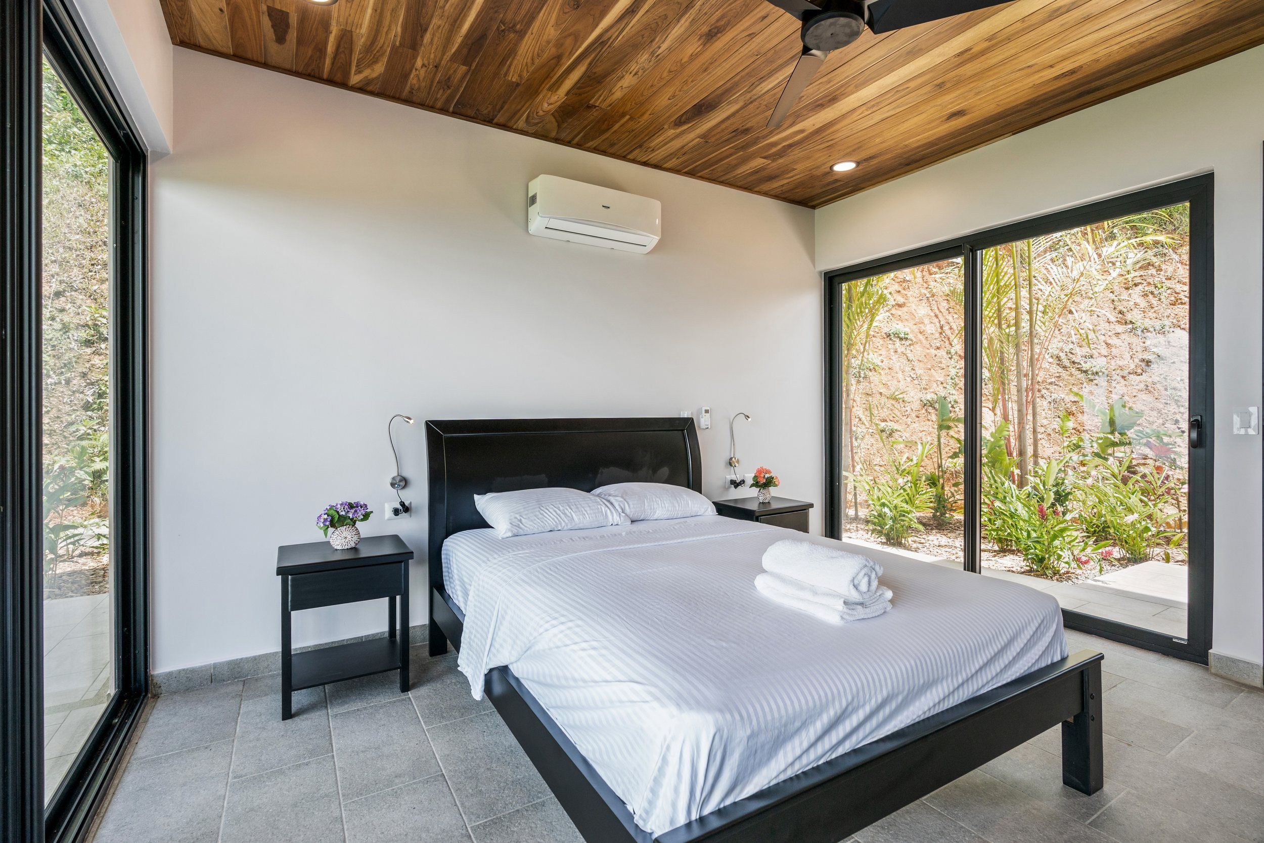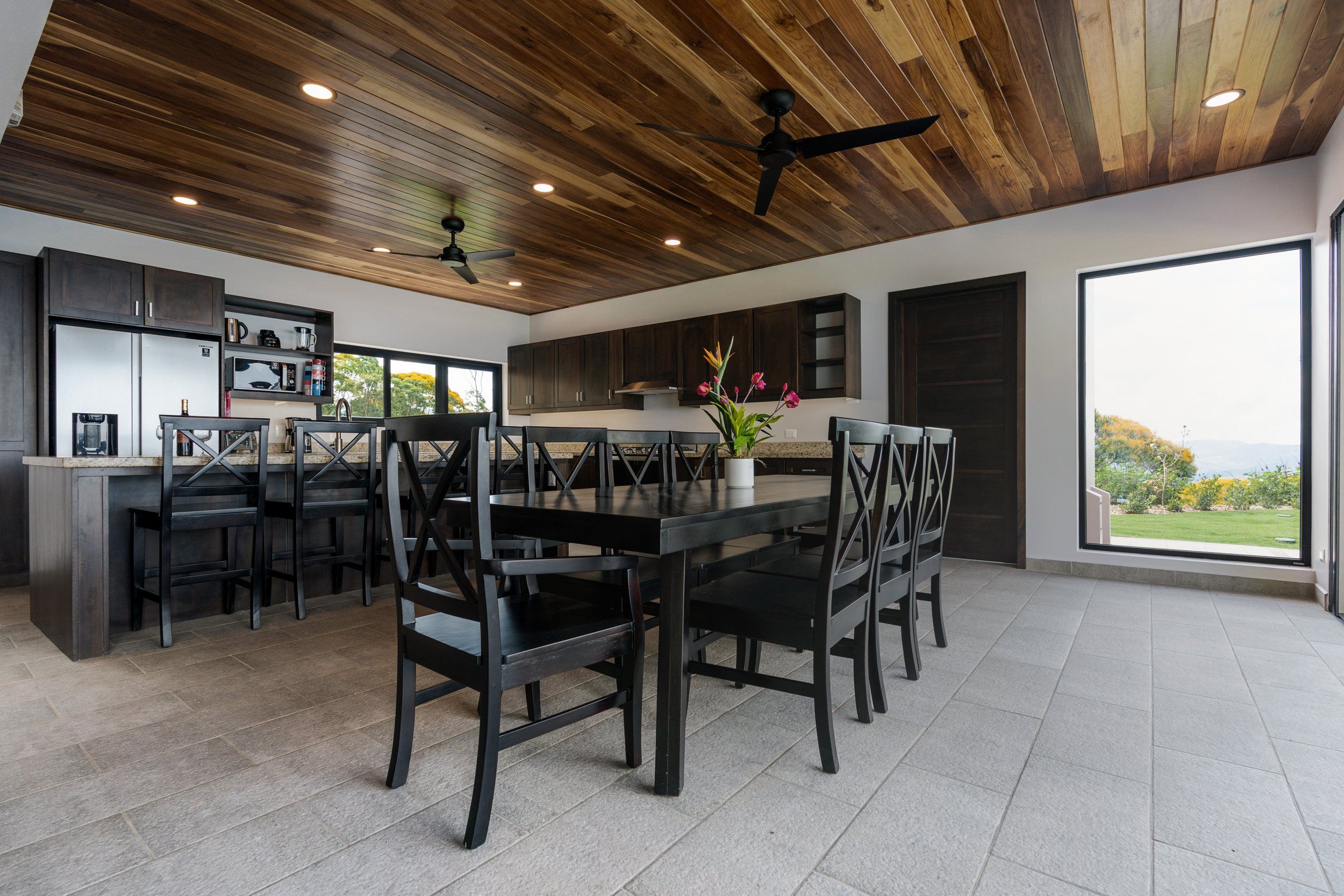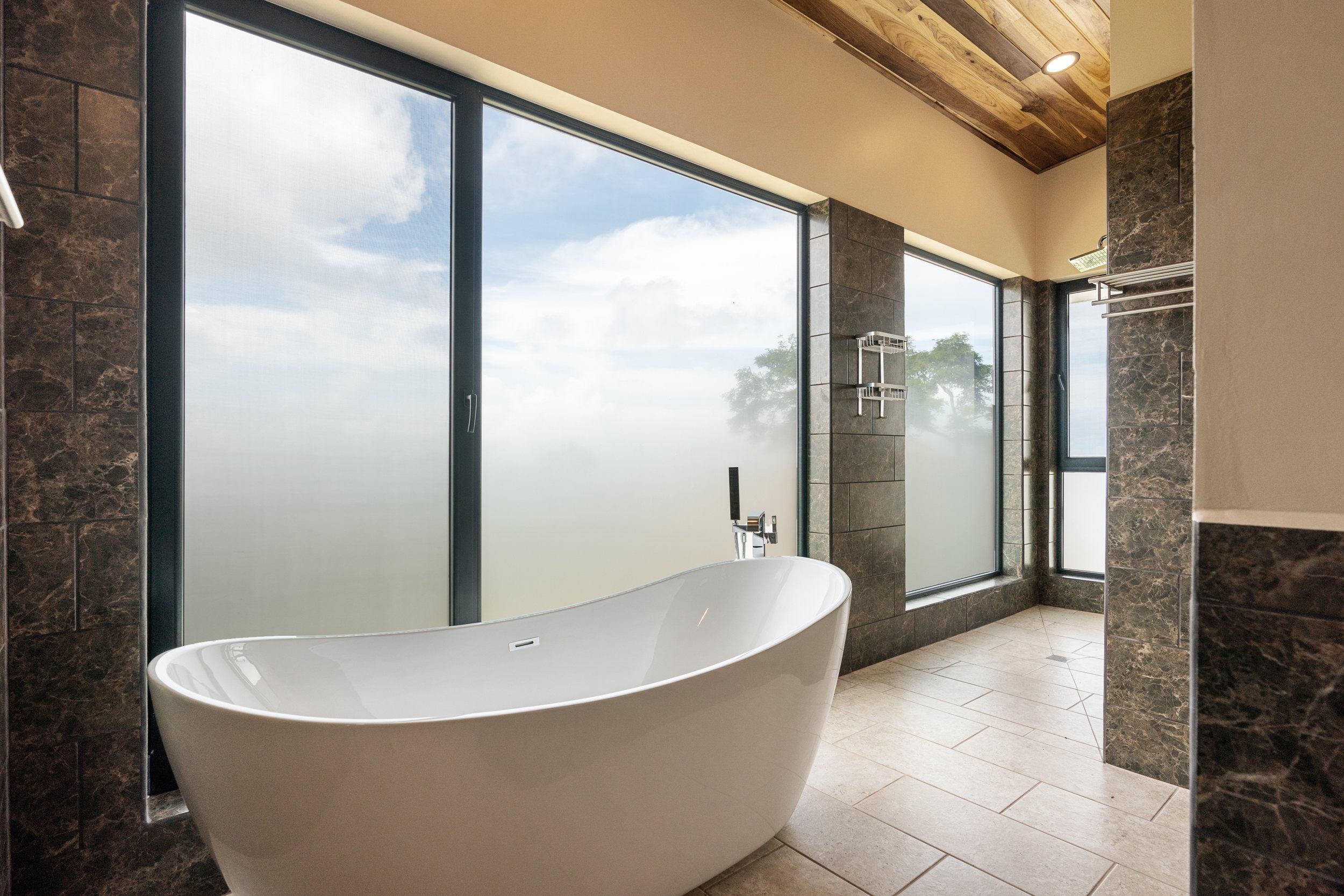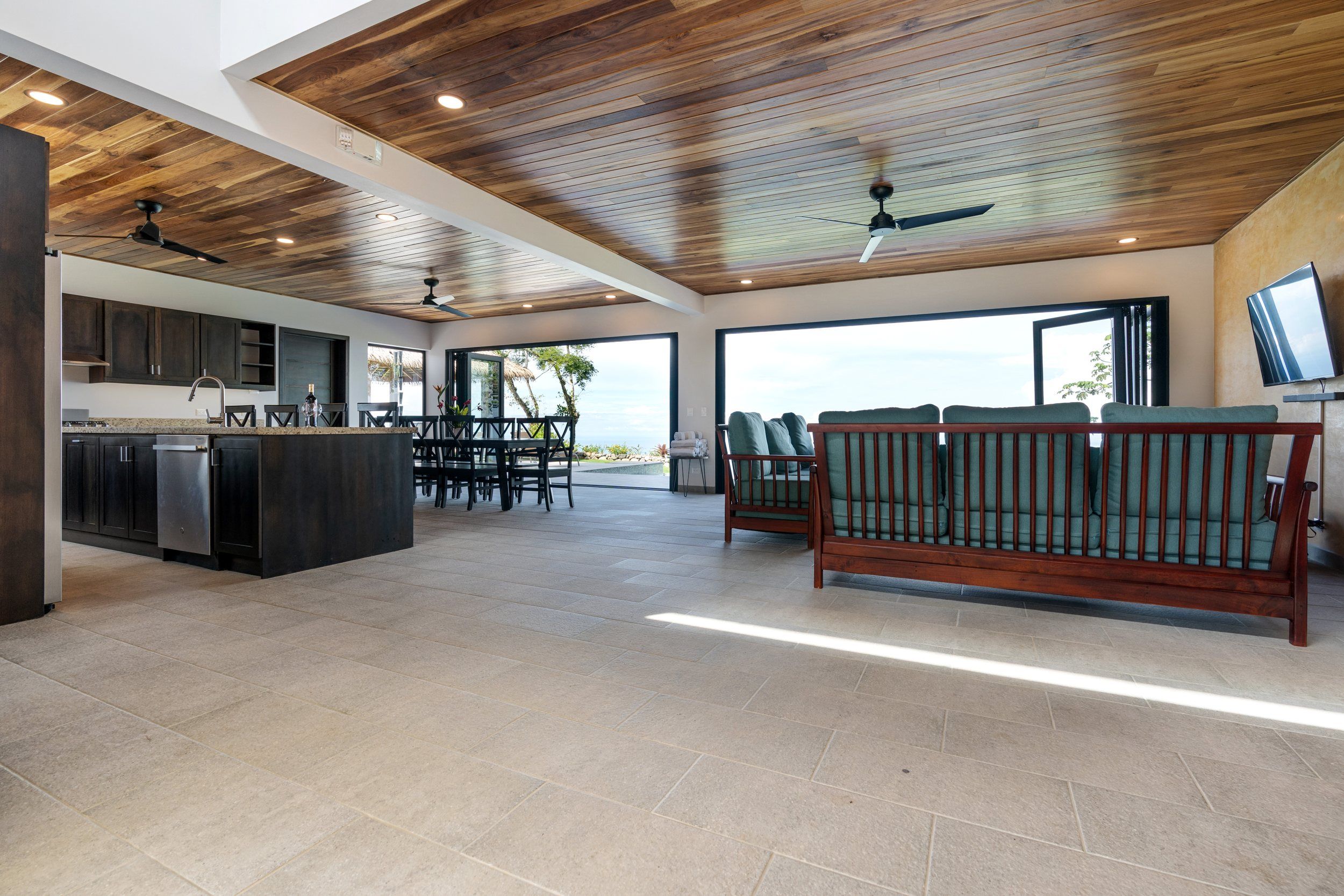 Brand new 5 bedroom and 4.5 bath luxury home perched on the mountain top of Lagunas near beach town of Dominical. Absolutely stunning ocean, coastline, mountain, and valley views in every direction. The home was recently completed this year and ready for a new owner to enjoy as their own private estate or rent out as the ultimate vacation rental!\n\nArrive through the electronic gates and drive up the paved private driveway with covered parking right at the front door. Then walk in to the expansive living room, dining room, and kitchen with sliding glass rear wall opening completely to the infinity pool and outdoor covered rancho with BBQ area. Downstairs there a half bath for guests that also has access from the pool area. Down the long hallways are two bedrooms with a full bath in between.\n\nUpstairs there is a secondary living room/den with wet bar. Also two balconies one on the mountain and valley side for sunrises and the ocean side for sunsets. The principal bedroom has its own private balcony and enormous ensuite bathroom with ocean view shower and soaking tub. Two more bedrooms with full baths and their own private balconies complete the upstairs.\n\nThe entire house has Laurel wood ceilings, porcelain tile, and granite counter tops throughout. Not often there is a 5 bedroom home on the market! And this home stands out for its occupancy potential, outstanding panoramic views, elevation for cooler breezes and temps day and night, and location 15 minutes to Dominical.