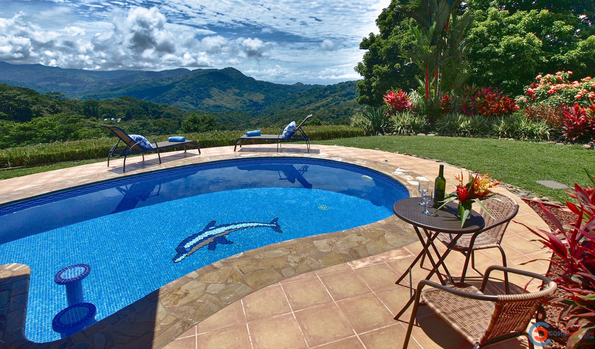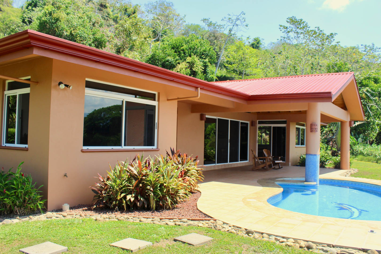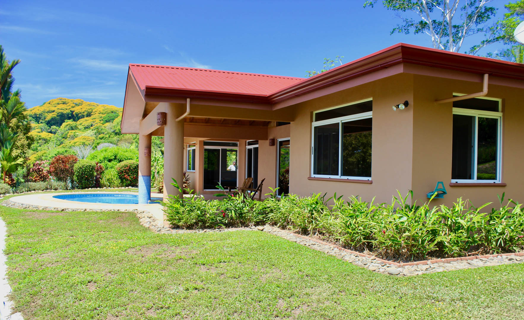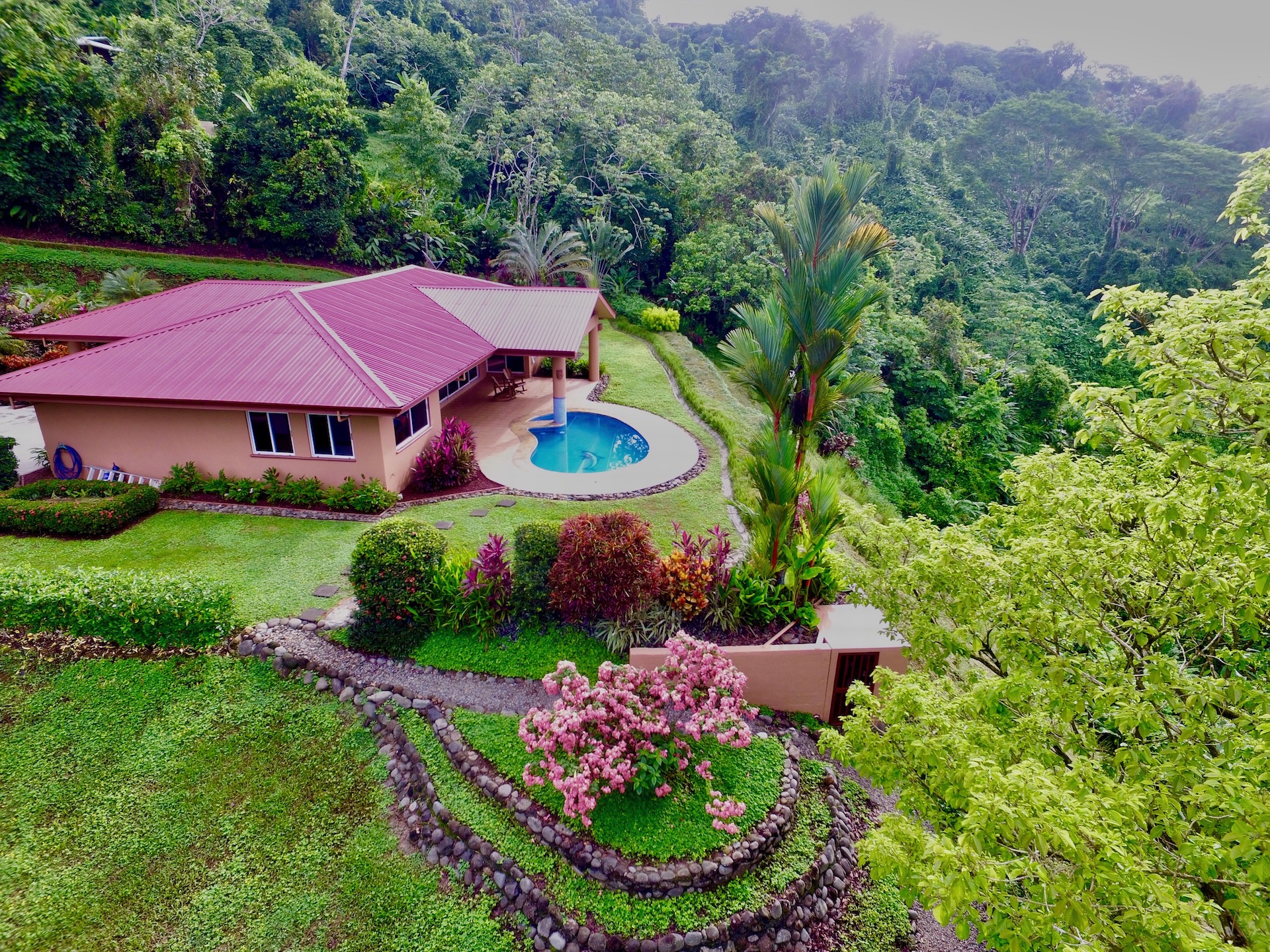 Spectacular ocean-view pool home on 5 acres with several additional building sites located in the desirable & upscale neighborhood of Lagunas in the mountains above Dominical. The property site sits at an elevation of 1,200 feet with year-round cool mountain breezes and fantastic views of the Pacific Ocean, the Baru River Valley and the Osa Peninsula. The house was custom-built to US standards in \'07 and consists of 3 bedrooms, 3 full bathrooms, 2,500 sq ft, concrete block construction, single-hung windows, vaulted custom wood malena ceilings, concrete driveway with remote-controlled security gate, swimming pool, huge covered carport & rear patio. Kitchen has granite counter tops with full back splash, custom teak cabinets, detached island bar finished in teak with bar stools & cocktail sink, gas oven/range, full-size side-by-side refrigerator, microwave, double stainless sink with disposal, fully equipped, and separate laundry room with full-size washer & dryer. The single-story split floor plan is both unique & desirable for Costa Rica with each bedroom having a full-size bathroom & shower, walk-in closets, ceiling fans & sliding glass doors opening up onto the expansive pool deck. The layout can comfortably accommodate 3 couples/families as a vacation rental with each having their own living space & privacy. The 5-acre site is meticulously landscaped with many colorful gardens & mature fruit trees including a covered vivero producing a variety of vegetables, herbs & fruit. There is abundant wildlife on the property including monkeys, sloths, toucans, scarlett macaws, toucans, white-tailed deer, pizotes, wild boar & many other species of birds & reptiles. Lagunas is an organized community that offers the best roads, treated water system and security in the southern zone. Great central location only 10 minutes to the town & beaches of Dominical, 10 minutes to Hacienda Baru National Park, 30 minutes to Quepos/Manual Antonio National Park and 25 minutes to the town & services of San Isidro/Perez Zeledon. There are many outdoor activities available in the immediate area including zip lines, white water rafting, ATV tours, fishing, surfing, kayaking, hiking, waterfalls & much more. Please contact us for a showing!\n\nPhotos on Flickr please click the link below \nhttps://www.flickr.com/photos/dominicalrealty/sets/72157656186979299