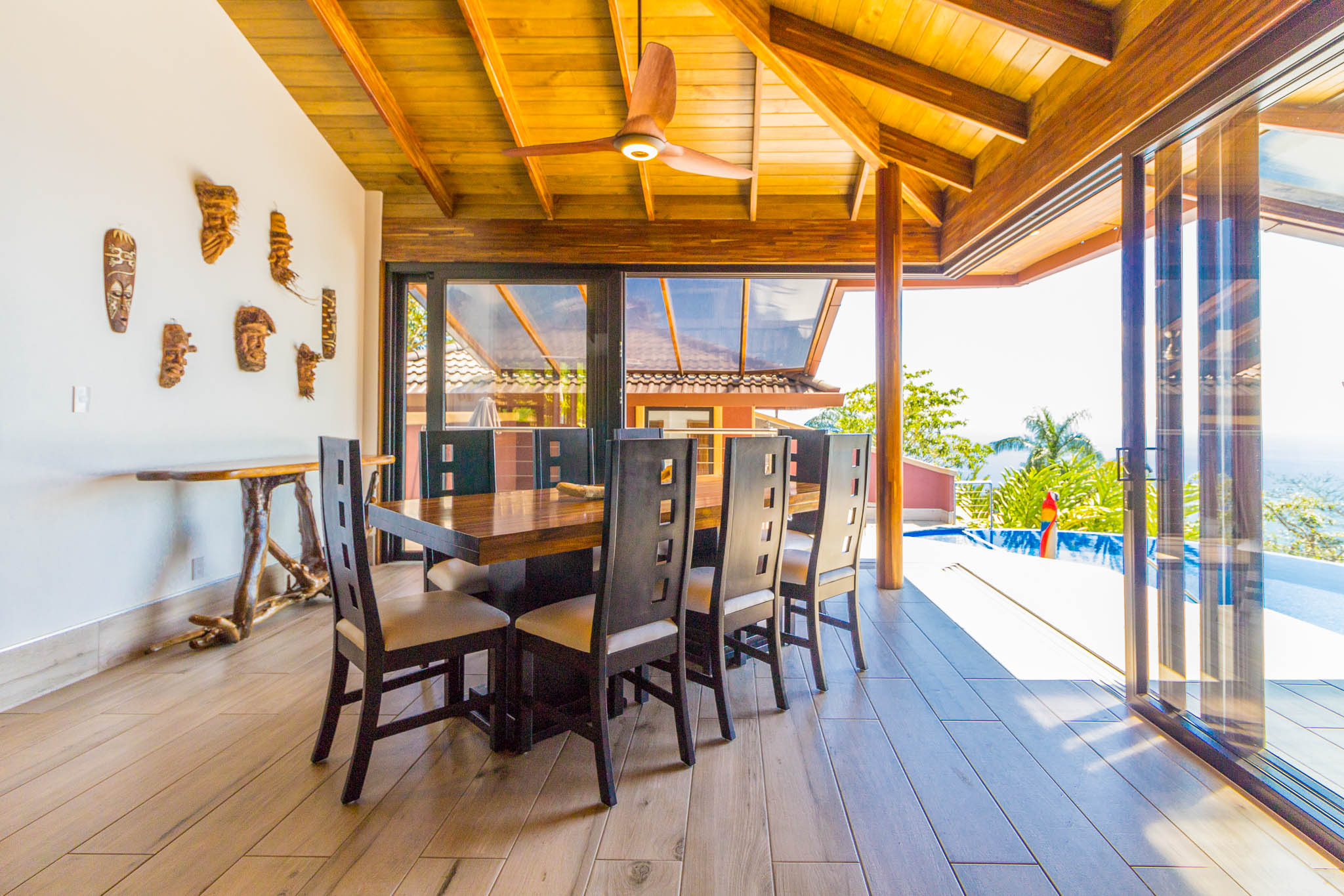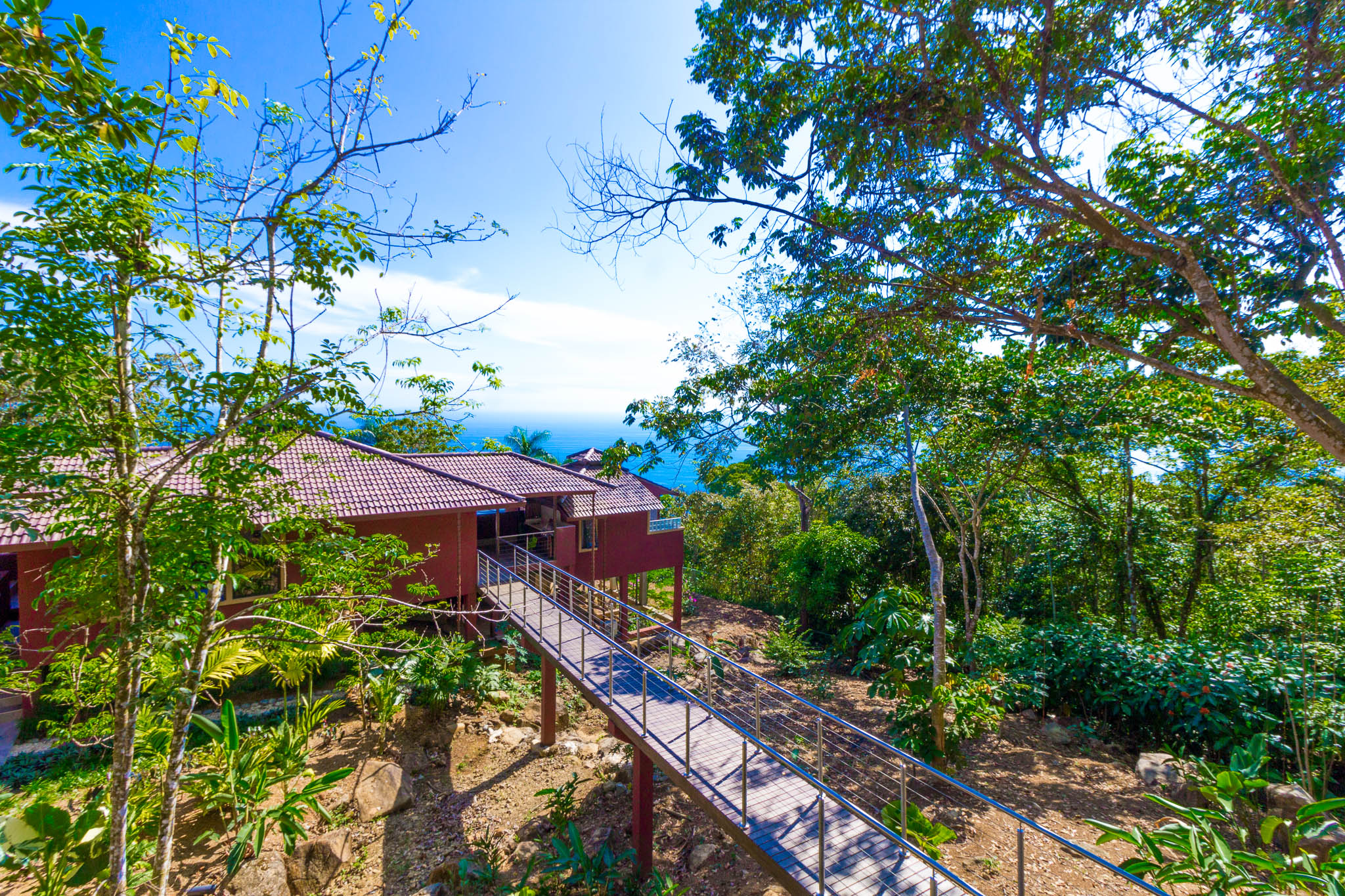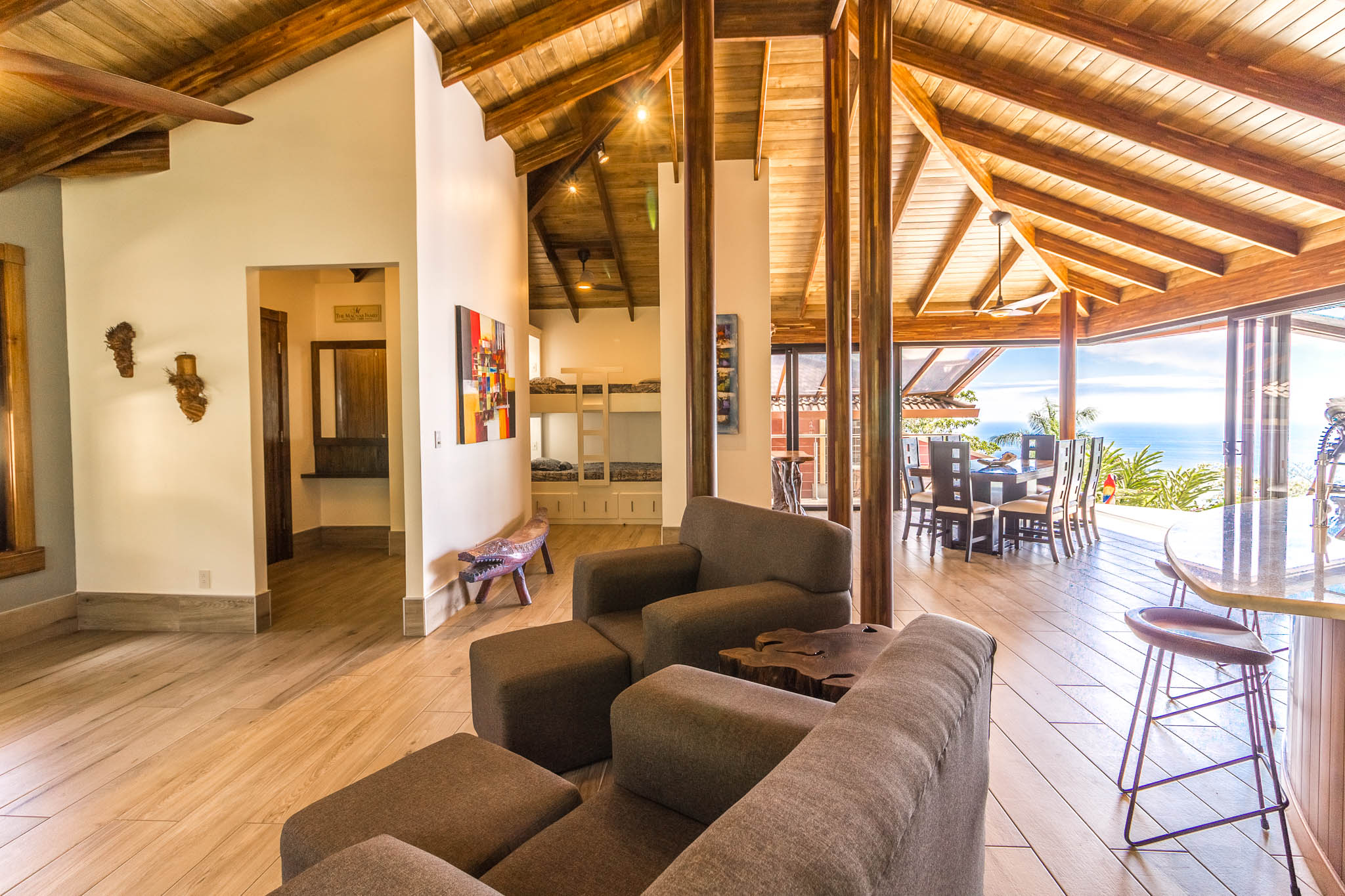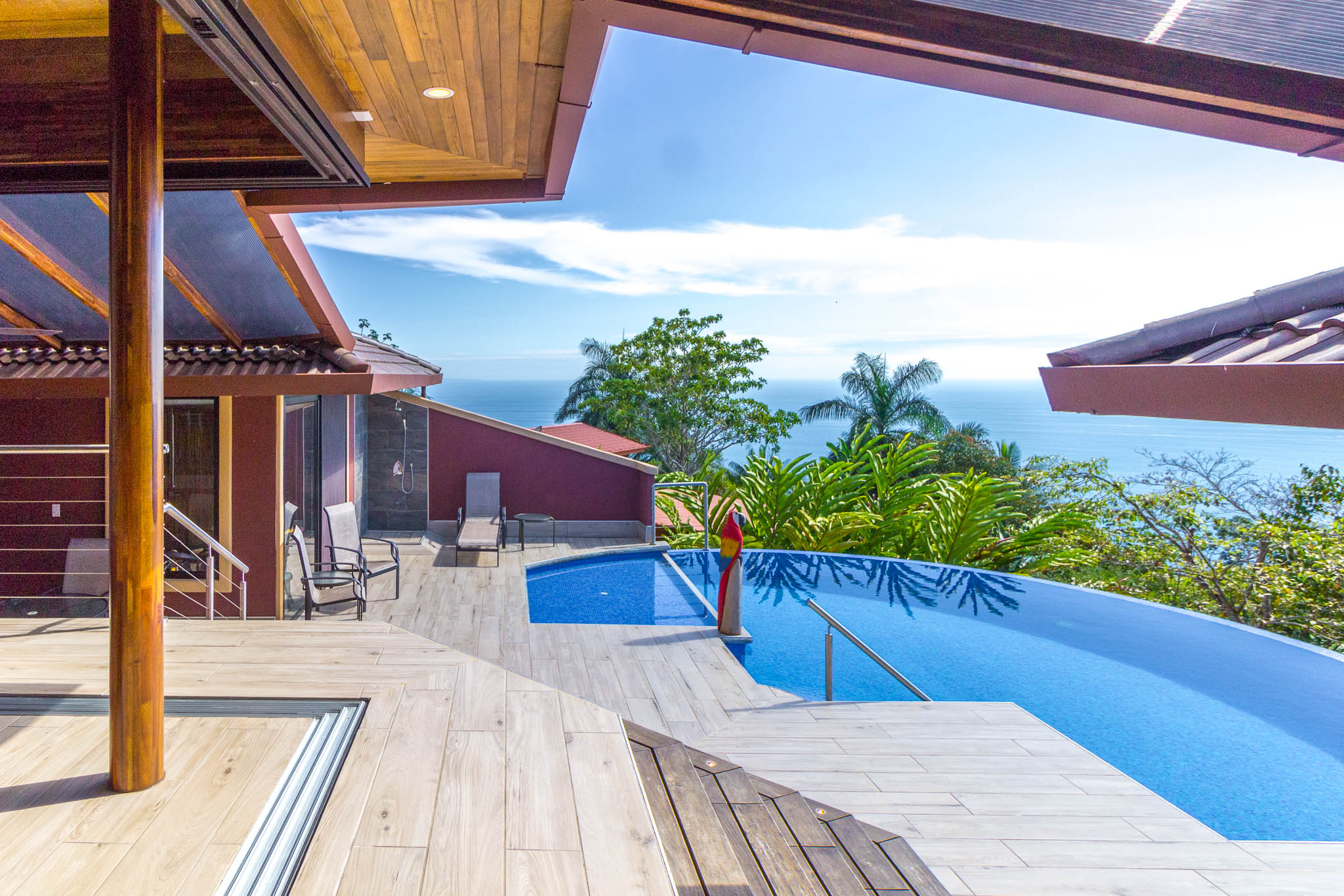 Enjoy unbelievable sunsets from the large infinity pool every day!\n\nThe unique design, painstakingly designed by a North American builder, includes a main open-concept living/kitchen/dining area, with a separate nook with bunk beds that kids are sure to love! The gourmet kitchen has high-end stainless-steel appliances, including a five-burner gas stove and cooktop, dishwasher, microwave, and refrigerator. A beautiful custom-made wooden dining table seats eight and has a prime view of the ocean and sunsets! The patio doors off the dining area open wide to let the indoor living space flow seamlessly into the outdoor living space, with a seating area, a full outdoor kitchen, and, of course, the amazing saltwater pool! \n\nThere are three full individual bedroom suites off the main area, each with beautiful floor-to-ceiling glass walls so that you can enjoy the view no matter which room you\'re in! The comfortable, spacious bedrooms are each their own individual cabina with ensuite bathrooms, including gorgeous, private outdoor showers, marble countertops, and ceramic basin sinks. The master bathroom also includes a luxurious soaking bathtub. Two bedrooms are just off the main area of the house and are just steps to the pool, while the third bedroom is across a charming walk bridge on a more private part of the property. \n\nThe attention to detail and design in this house is amazing. There is beautiful custom woodwork throughout the house, with teak stairs and walkways and acacia cabinetry, furniture, and beams throughout the house, with purple heart wood accents. The accordion screens and telescoping patio doors offer maximum flow throughout the house. Inset lights on the stairs and walkways give a soft glow at night. The fully fenced, .6-acre property is beautifully landscaped, and monkeys, toucans, and sloths regularly visit the property! The property has high-speed Internet, abundant storage, a dry room, and is conveniently located just a few minutes from the main highway in the prestigious Escaleras neighborhood. Close to Dominical and Uvita, everything you need is just minutes away, while you get to enjoy the peace and tranquility of this beautiful home! It is an oasis, but with all the modern conveniences you desire!