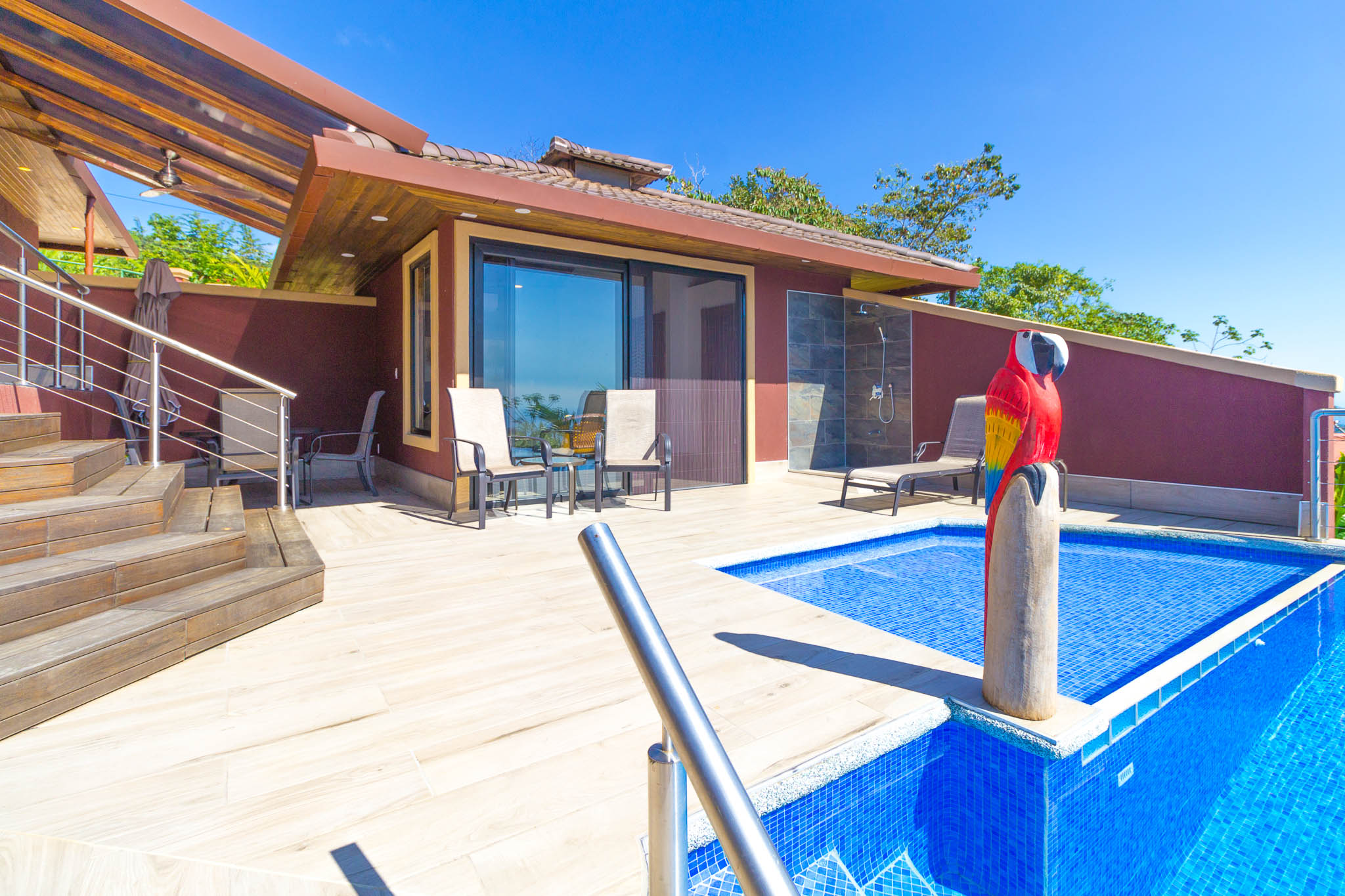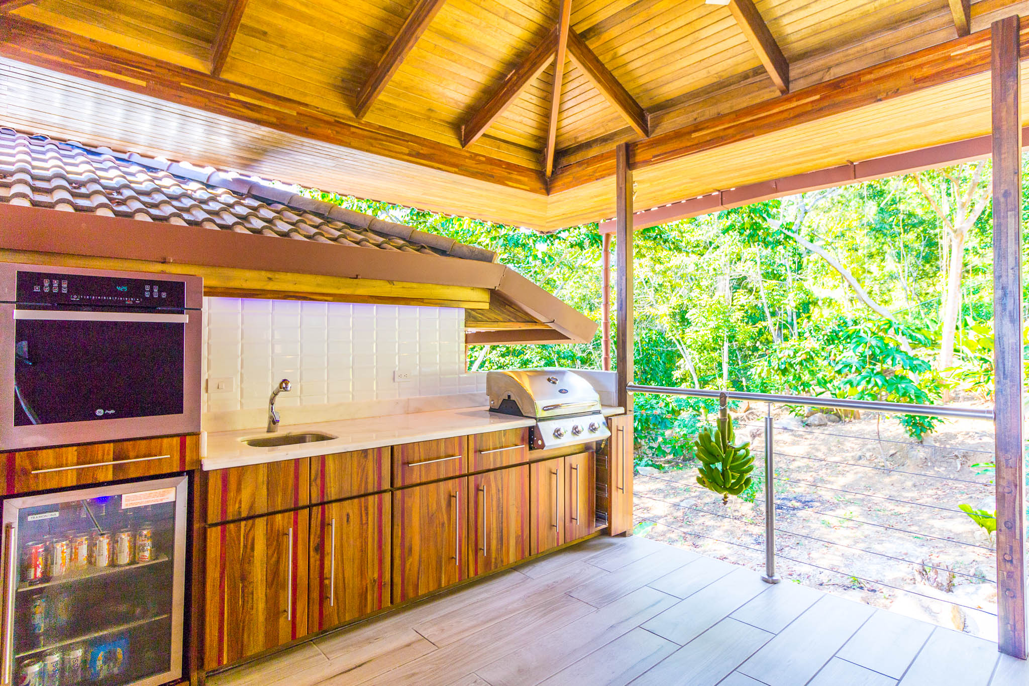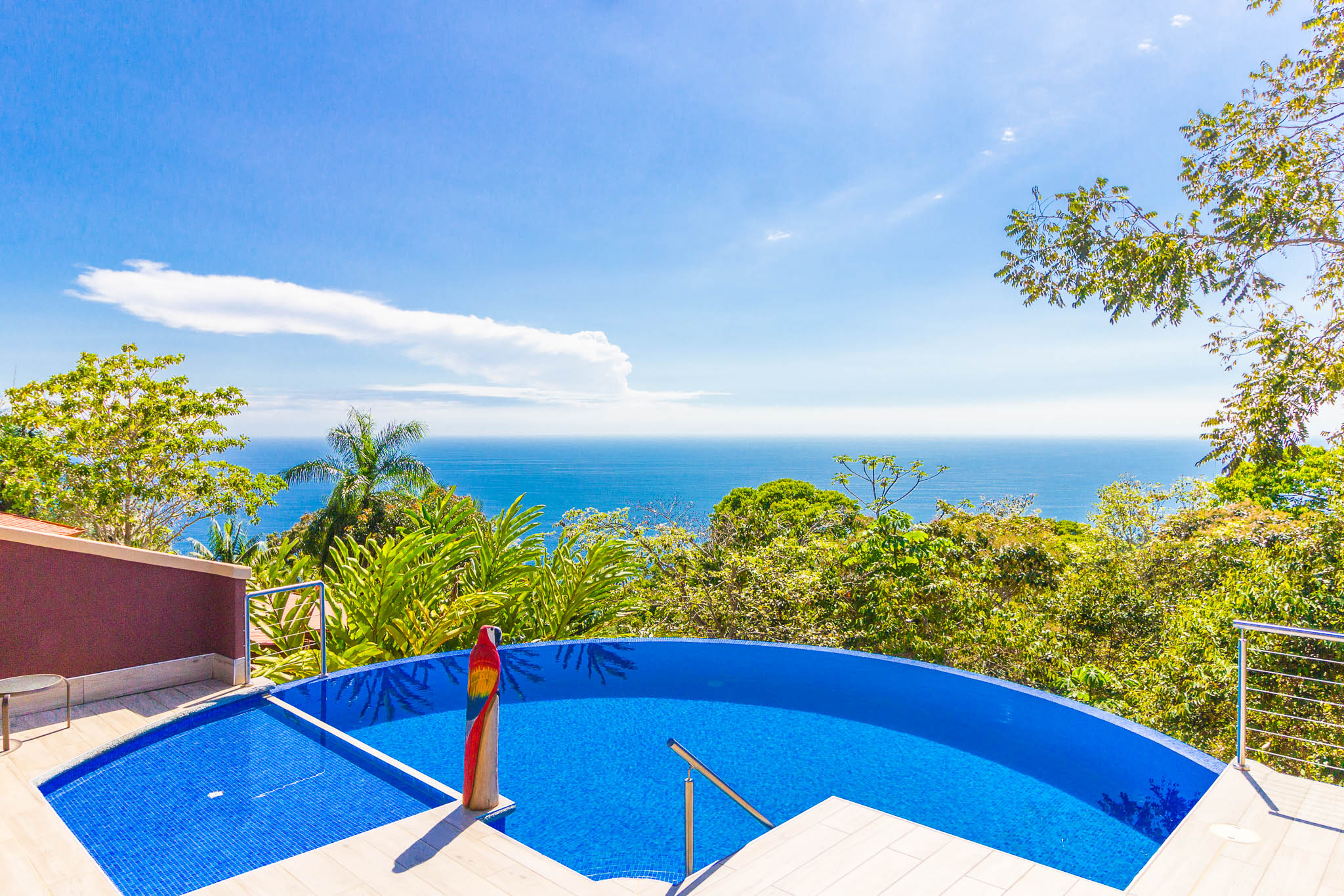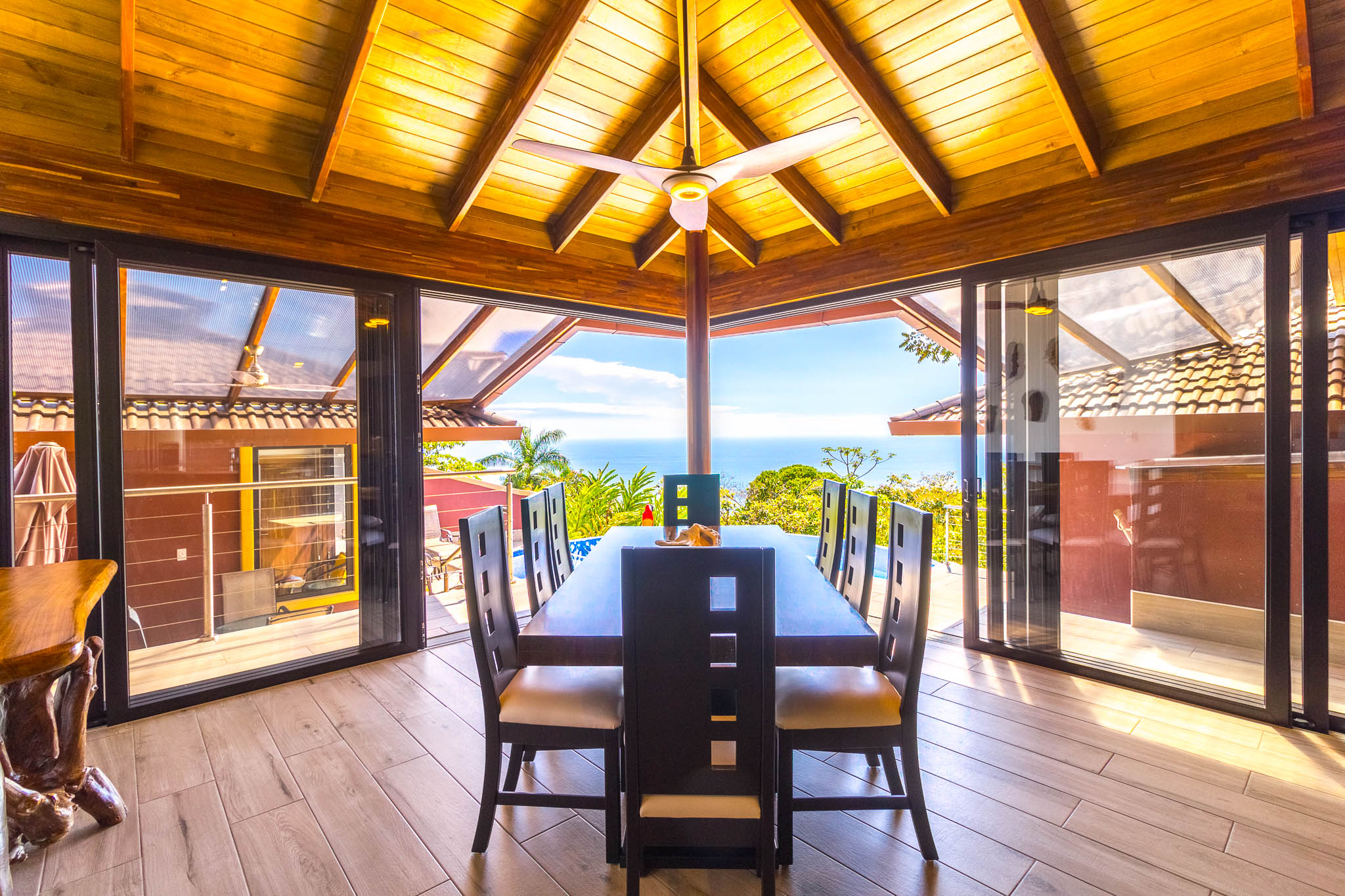 Enjoy unbelievable sunsets from the large infinity pool every day!\n\nThe unique design, painstakingly designed by a North American builder, includes a main open-concept living/kitchen/dining area, with a separate nook with bunk beds that kids are sure to love! The gourmet kitchen has high-end stainless-steel appliances, including a five-burner gas stove and cooktop, dishwasher, microwave, and refrigerator. A beautiful custom-made wooden dining table seats eight and has a prime view of the ocean and sunsets! The patio doors off the dining area open wide to let the indoor living space flow seamlessly into the outdoor living space, with a seating area, a full outdoor kitchen, and, of course, the amazing saltwater pool! \n\nThere are three full individual bedroom suites off the main area, each with beautiful floor-to-ceiling glass walls so that you can enjoy the view no matter which room you\'re in! The comfortable, spacious bedrooms are each their own individual cabina with ensuite bathrooms, including gorgeous, private outdoor showers, marble countertops, and ceramic basin sinks. The master bathroom also includes a luxurious soaking bathtub. Two bedrooms are just off the main area of the house and are just steps to the pool, while the third bedroom is across a charming walk bridge on a more private part of the property. \n\nThe attention to detail and design in this house is amazing. There is beautiful custom woodwork throughout the house, with teak stairs and walkways and acacia cabinetry, furniture, and beams throughout the house, with purple heart wood accents. The accordion screens and telescoping patio doors offer maximum flow throughout the house. Inset lights on the stairs and walkways give a soft glow at night. The fully fenced, .6-acre property is beautifully landscaped, and monkeys, toucans, and sloths regularly visit the property! The property has high-speed Internet, abundant storage, a dry room, and is conveniently located just a few minutes from the main highway in the prestigious Escaleras neighborhood. Close to Dominical and Uvita, everything you need is just minutes away, while you get to enjoy the peace and tranquility of this beautiful home! It is an oasis, but with all the modern conveniences you desire!