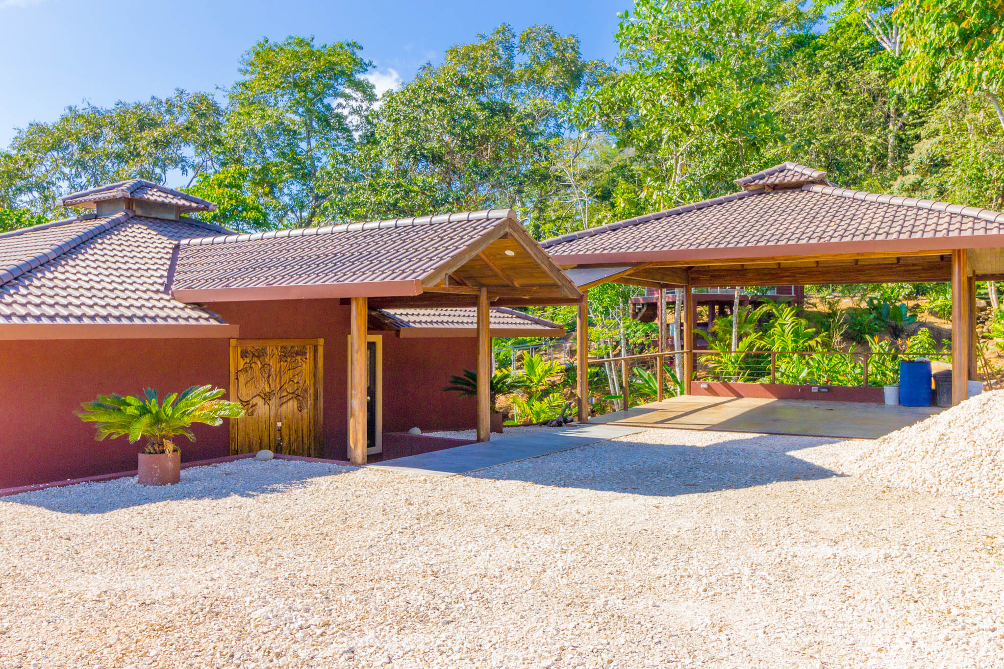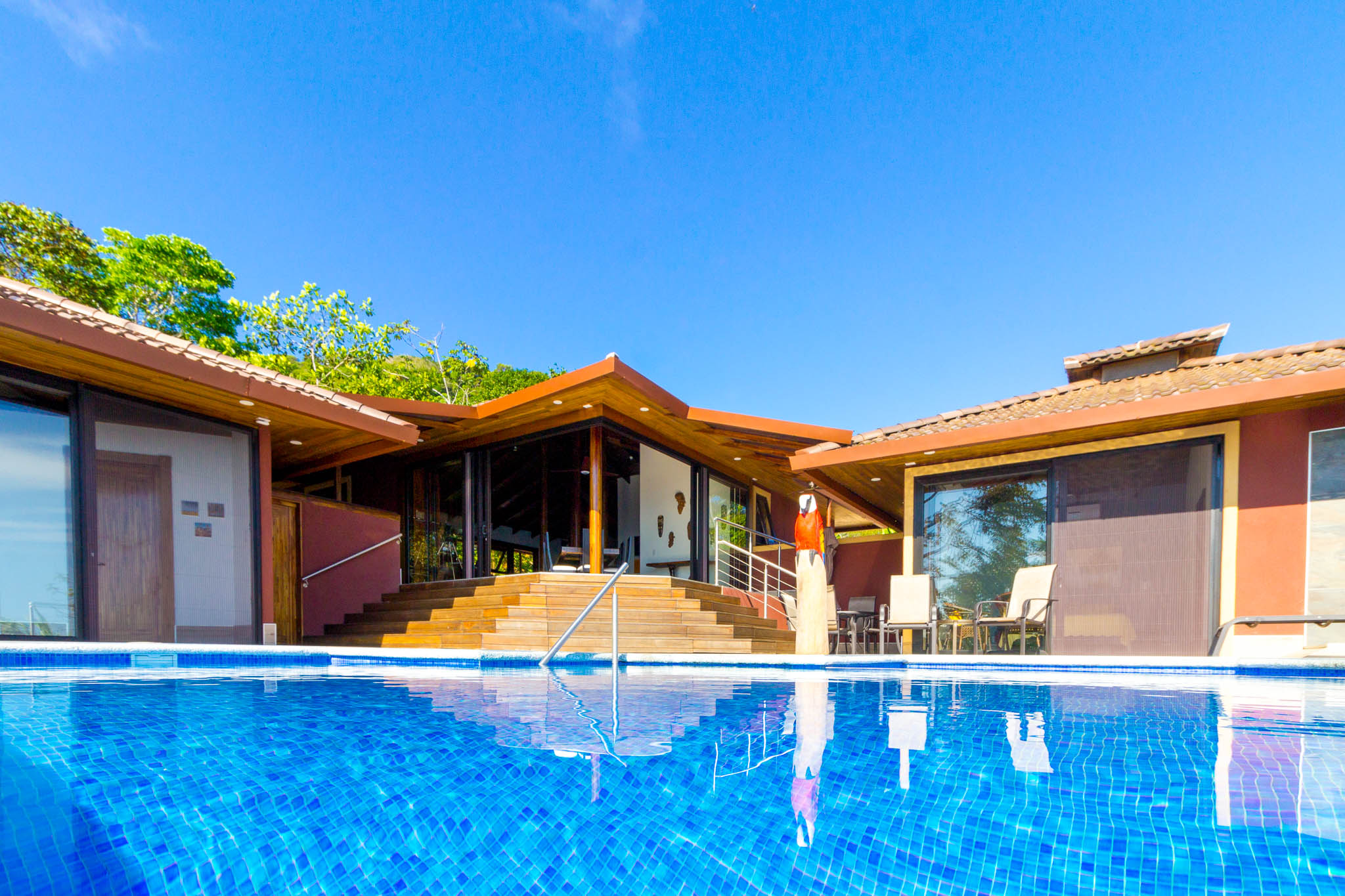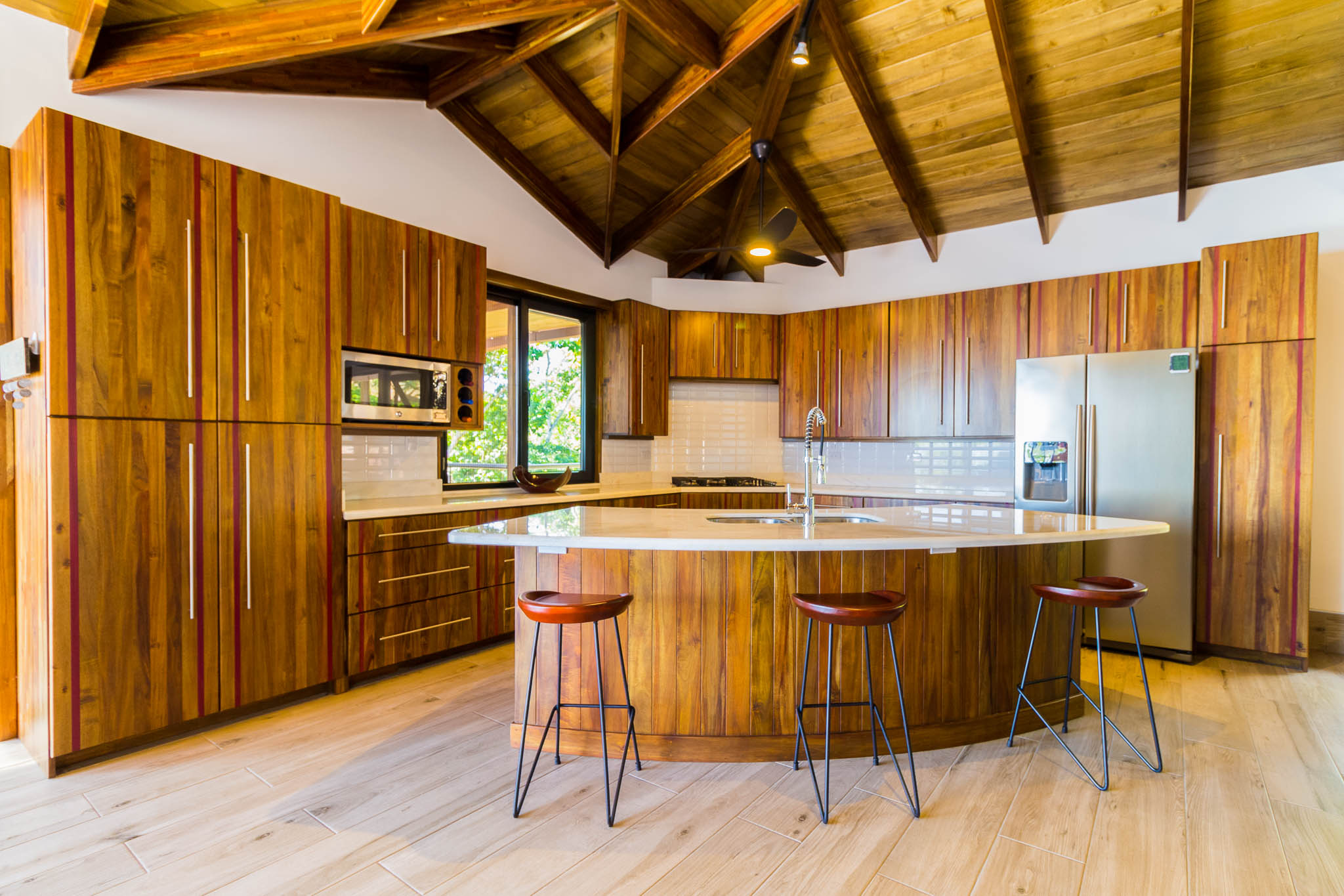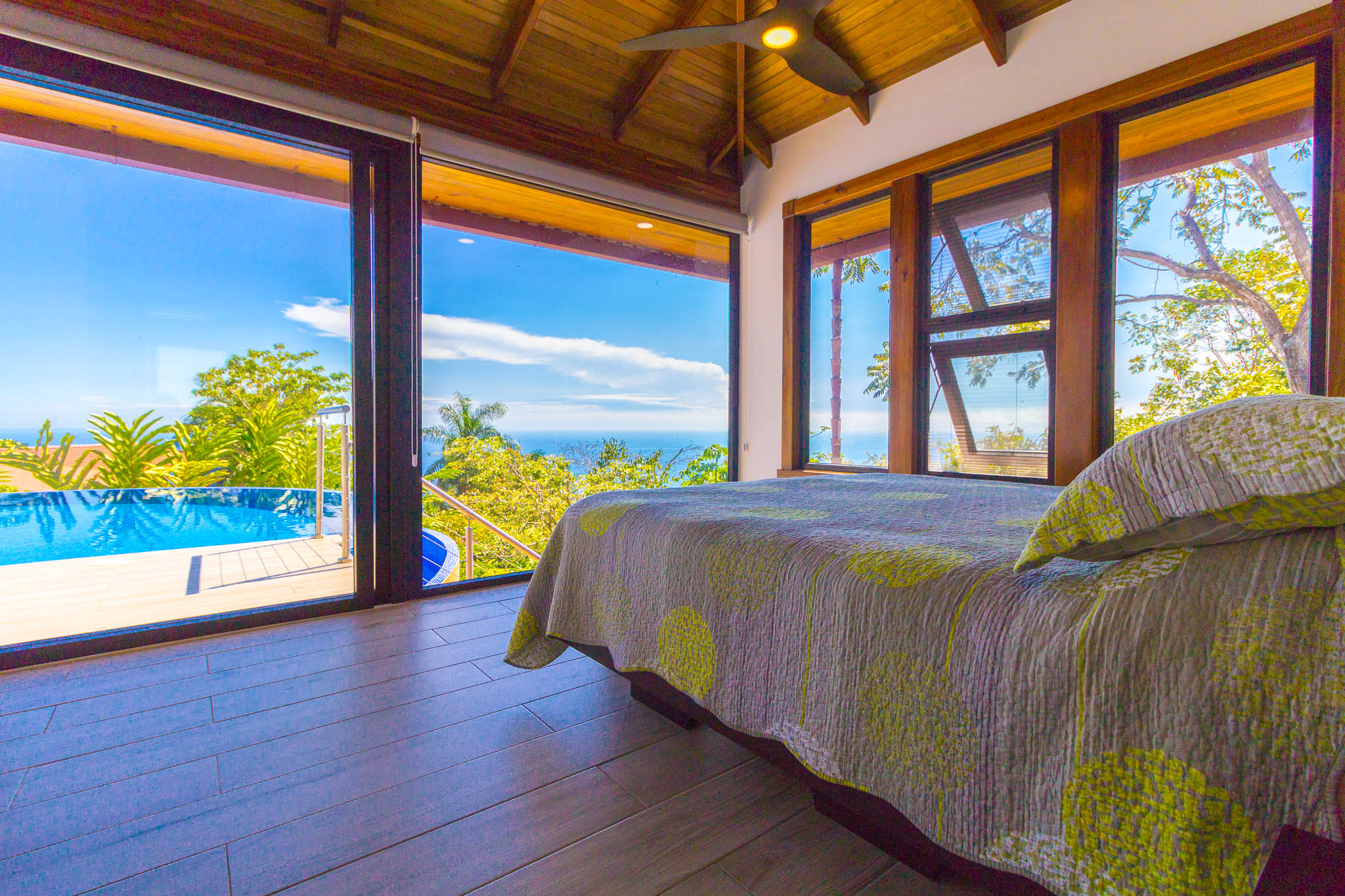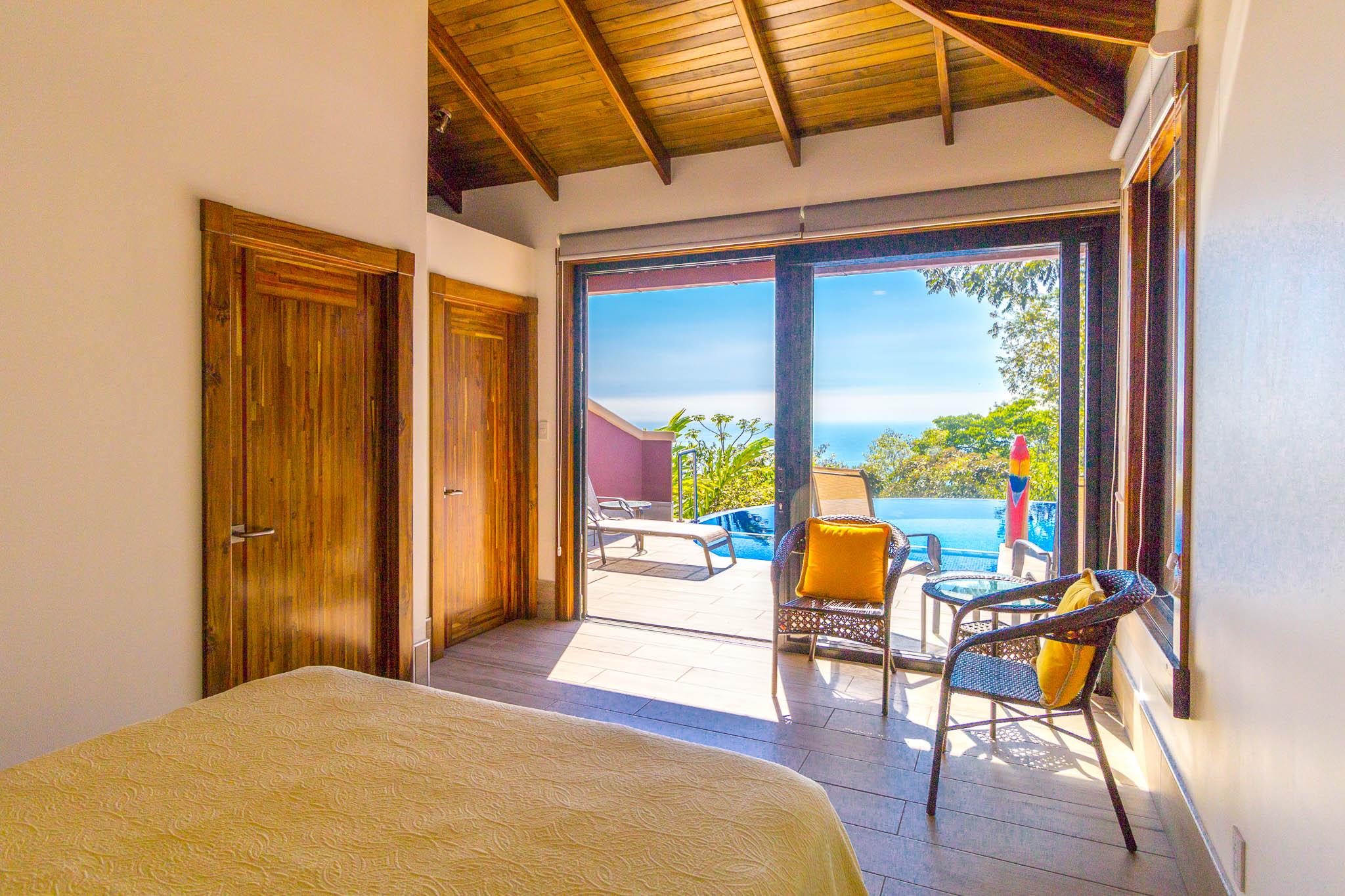 Enjoy unbelievable sunsets from the large infinity pool every day!\n\nThe unique design, painstakingly designed by a North American builder, includes a main open-concept living/kitchen/dining area, with a separate nook with bunk beds that kids are sure to love! The gourmet kitchen has high-end stainless-steel appliances, including a five-burner gas stove and cooktop, dishwasher, microwave, and refrigerator. A beautiful custom-made wooden dining table seats eight and has a prime view of the ocean and sunsets! The patio doors off the dining area open wide to let the indoor living space flow seamlessly into the outdoor living space, with a seating area, a full outdoor kitchen, and, of course, the amazing saltwater pool! \n\nThere are three full individual bedroom suites off the main area, each with beautiful floor-to-ceiling glass walls so that you can enjoy the view no matter which room you\'re in! The comfortable, spacious bedrooms are each their own individual cabina with ensuite bathrooms, including gorgeous, private outdoor showers, marble countertops, and ceramic basin sinks. The master bathroom also includes a luxurious soaking bathtub. Two bedrooms are just off the main area of the house and are just steps to the pool, while the third bedroom is across a charming walk bridge on a more private part of the property. \n\nThe attention to detail and design in this house is amazing. There is beautiful custom woodwork throughout the house, with teak stairs and walkways and acacia cabinetry, furniture, and beams throughout the house, with purple heart wood accents. The accordion screens and telescoping patio doors offer maximum flow throughout the house. Inset lights on the stairs and walkways give a soft glow at night. The fully fenced, .6-acre property is beautifully landscaped, and monkeys, toucans, and sloths regularly visit the property! The property has high-speed Internet, abundant storage, a dry room, and is conveniently located just a few minutes from the main highway in the prestigious Escaleras neighborhood. Close to Dominical and Uvita, everything you need is just minutes away, while you get to enjoy the peace and tranquility of this beautiful home! It is an oasis, but with all the modern conveniences you desire!