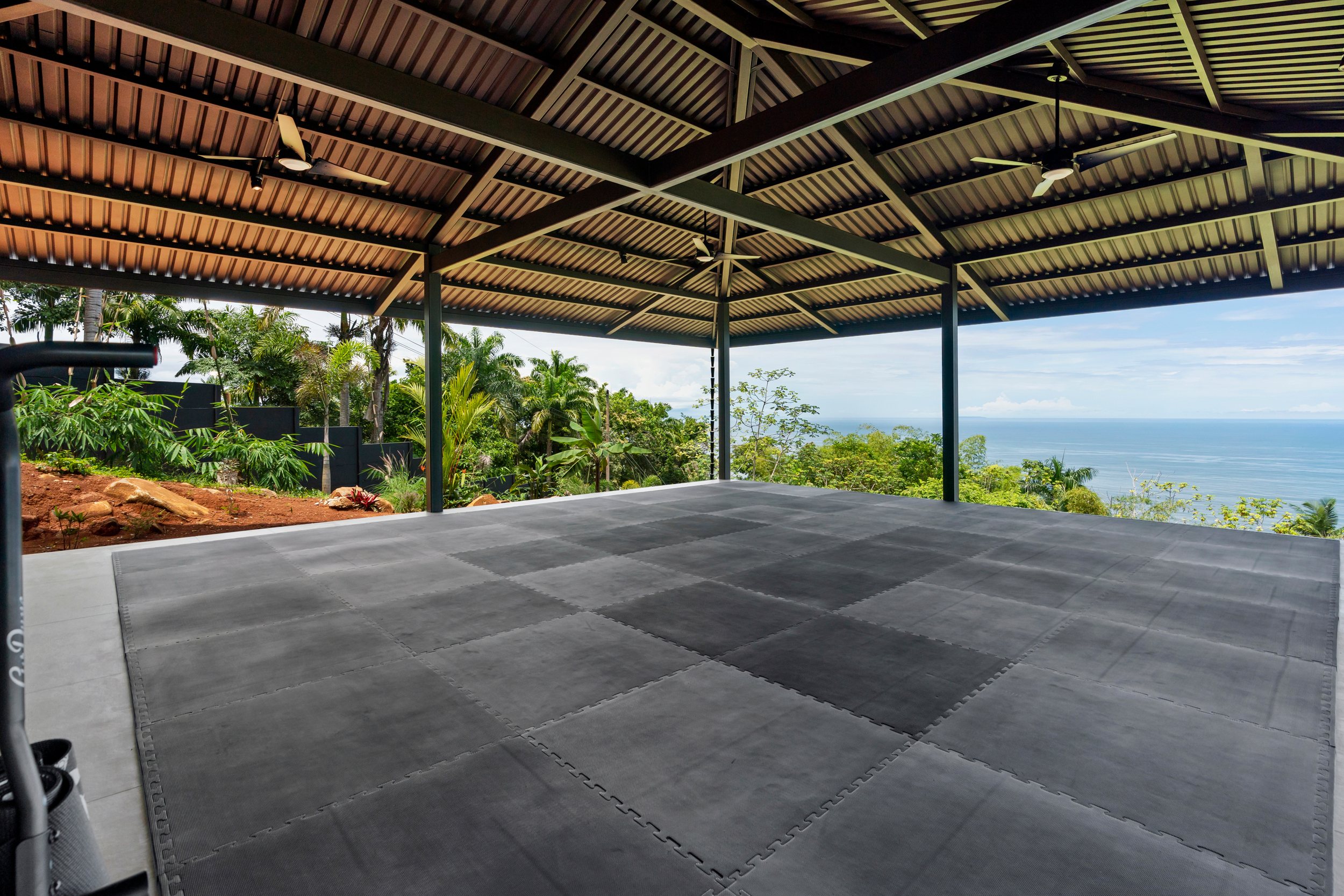 The Gym/Yoga Space Completed in 2022 as a large open pavilion with exercise rubber floor matting makes this the perfect gym and/or yoga space. The structure has a half bathroom and would be easy to make that a full bath by adding the shower and closing in part of the structure to make an additional stand-alone rental villa.