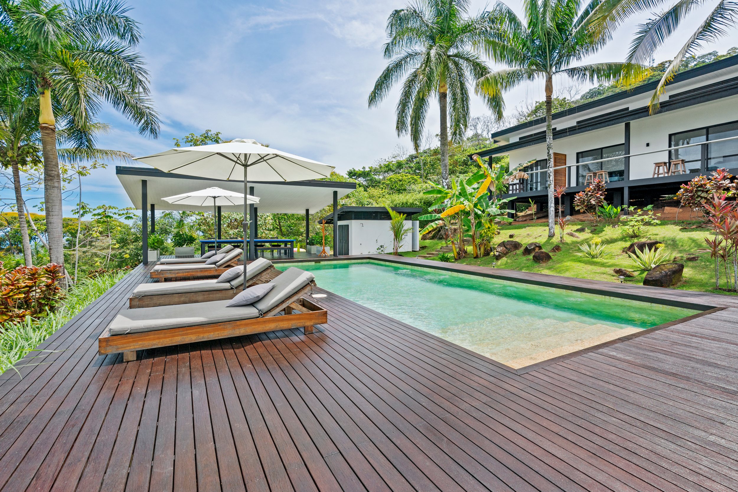 The Pool Area Beautiful pool and large spacious Ipe hardwood deck which was recently sanded and stained. Brand new rancho in the same style as the Villas. Plenty of room for BBQ grill with dining area or gathering place for family, friends, and guests. If one decided to make this a commercial property then the resort style pool area is ready to go!!
