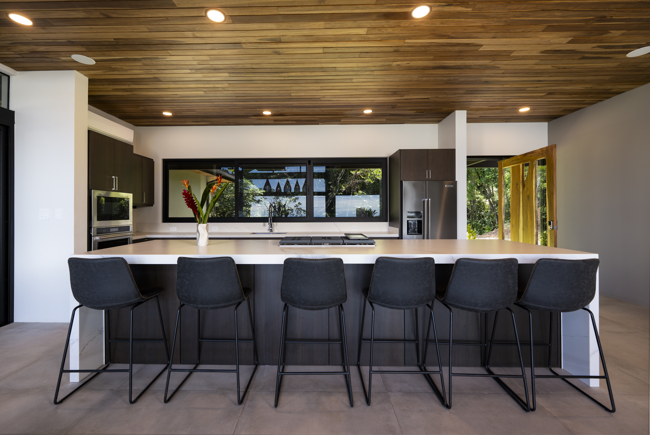 From every angle, you see either the rainforest canopy, the Pacific Ocean, or both. Whether it's sunrise casting light through the trees or the afternoon sun setting over the horizon, the view is constant and always changing. The custom kitchen features clean, modern cabinetry, high-end appliances, and an oversized island perfect for gathering. But it's the seamless transition to the outdoors that makes everyday living here feel special. Step out onto the sprawling teak deck, and the hand-tiled infinity-edge pool stretches before you, appearing to pour directly into the ocean beyond.