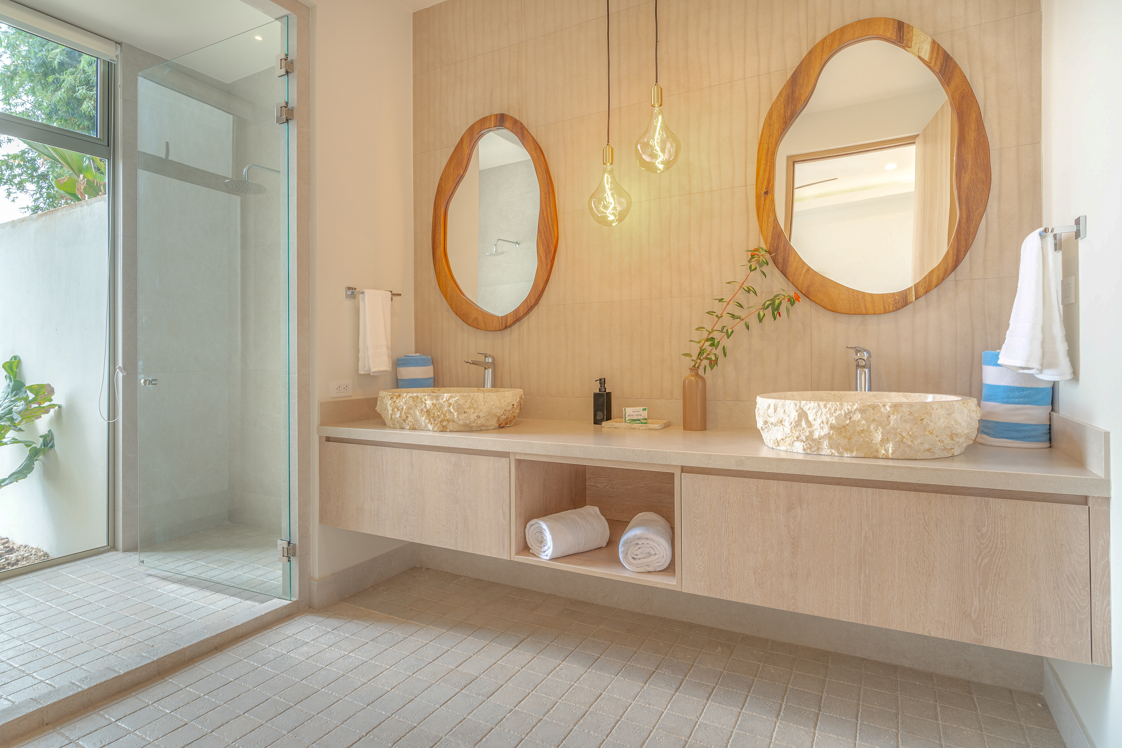 A separate three bedroom guest home sits on its own private pocket of land. It works beautifully as a rental or as extra space for retreats and gatherings. The outdoor shower is a signature experience. It faces a forested creek, so guests rinse under the sky with nothing but the sound of water below and jungle around them. Together, both homes create a seven bedroom compound that can serve as a luxury vacation rental, a wellness or yoga retreat center, or a long term family haven with abundant hosting space.