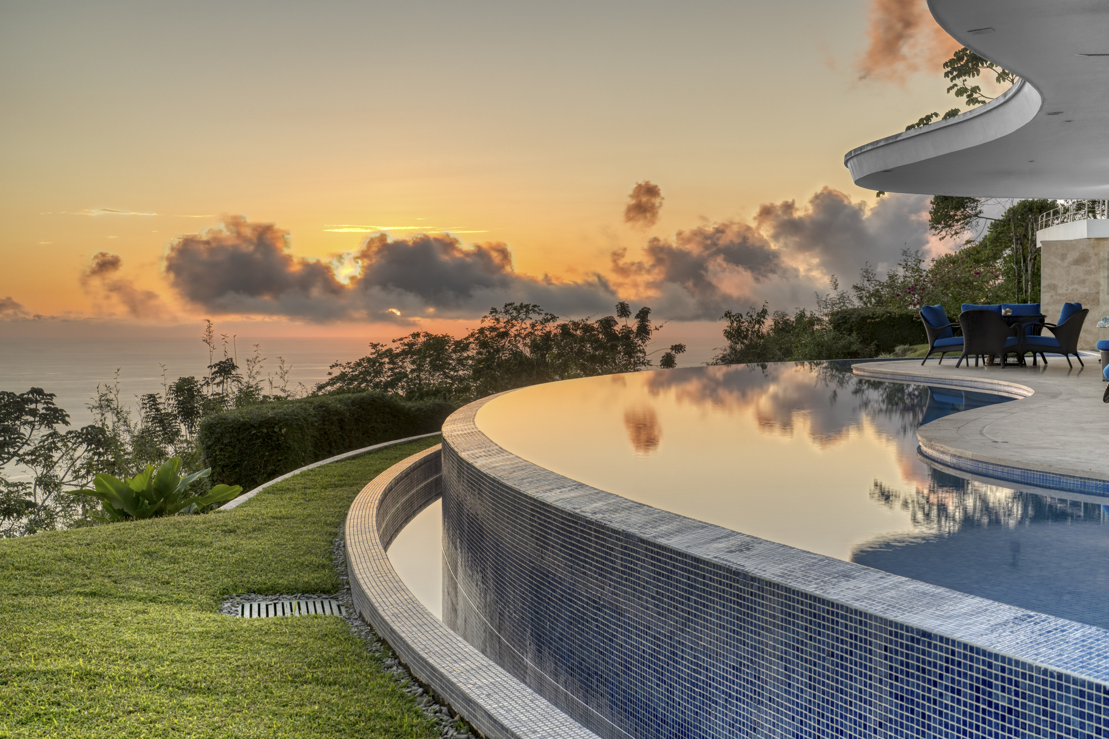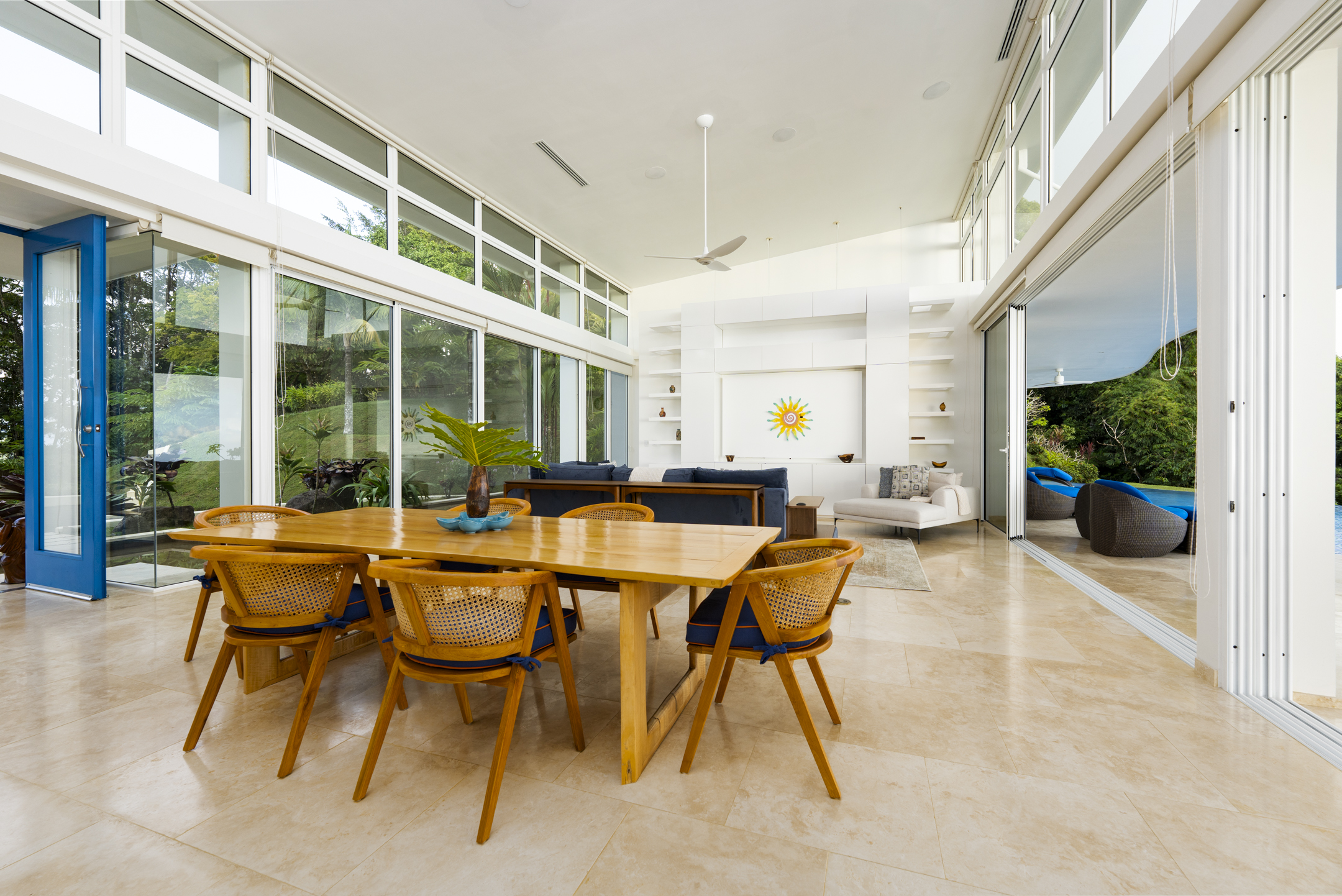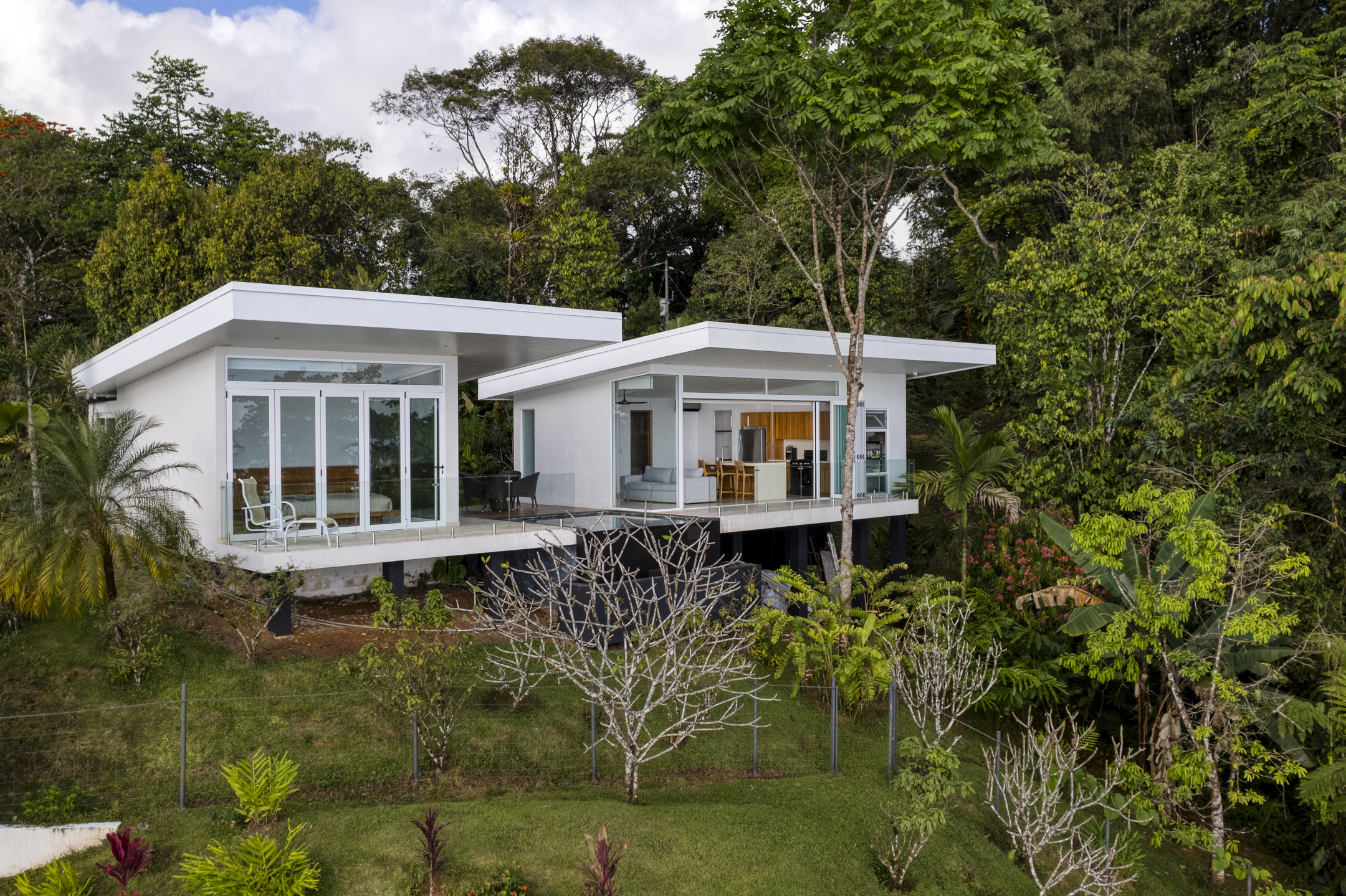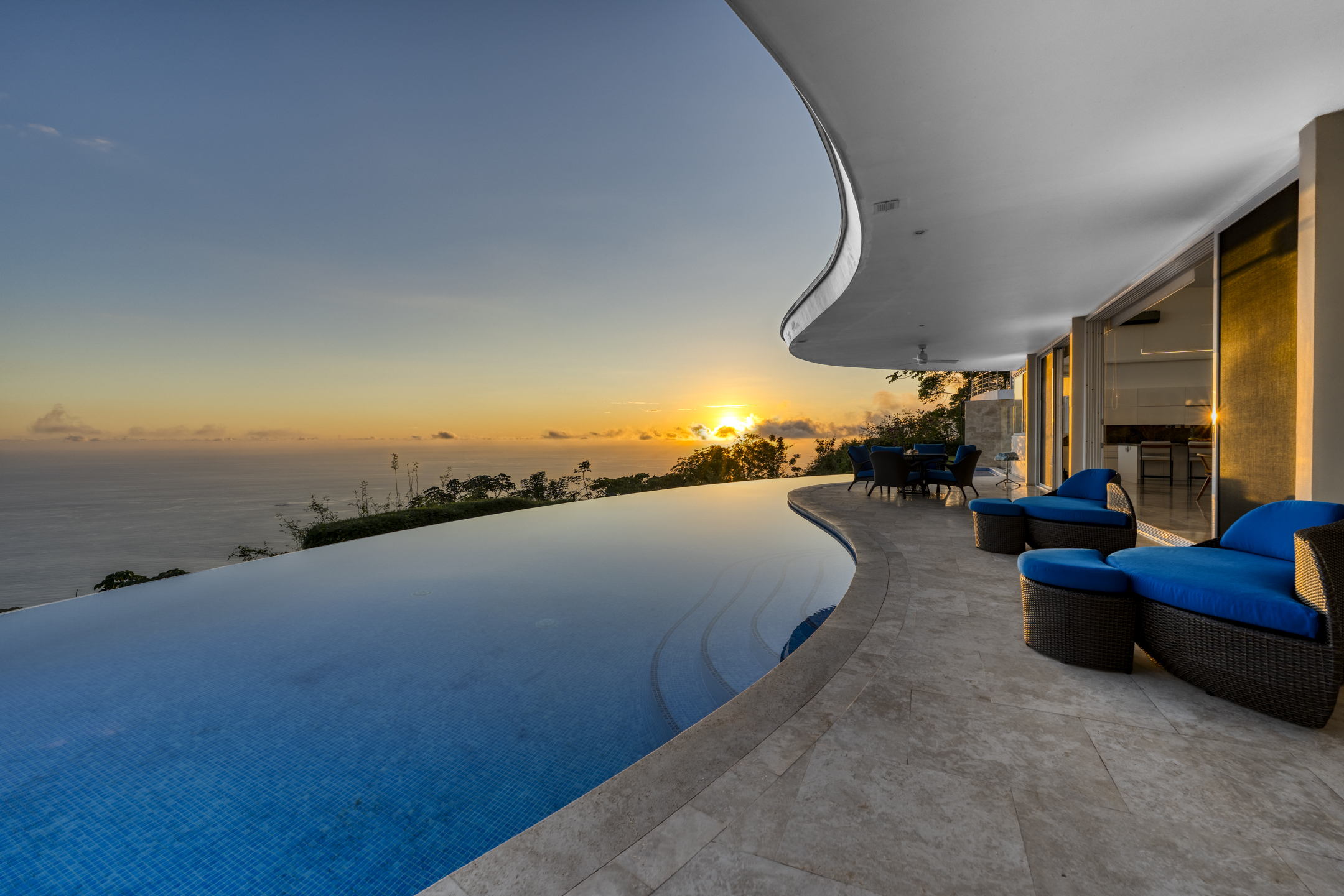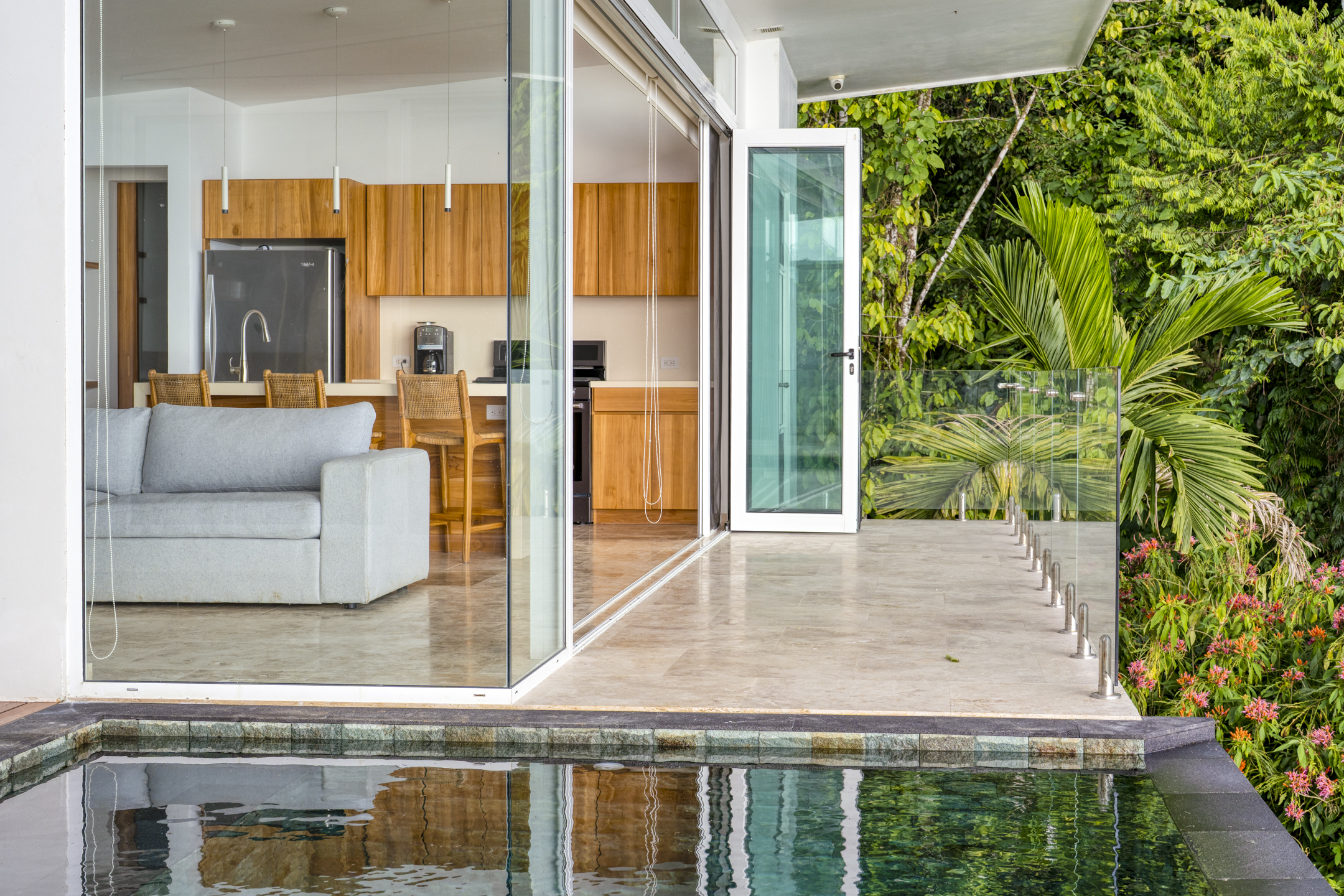 The heart of the home is its open-concept living and dining area, where architecture and nature work in perfect harmony. A chef-level kitchen with high-end appliances and refined finishes anchors the space, ideal for intimate dinners or larger gatherings. From here, the home flows seamlessly onto a grand covered terrace, where a curved infinity pool wraps around the structure as if floating above the jungle. It is a setting designed for long afternoons, sunset conversations, and evenings under the stars.