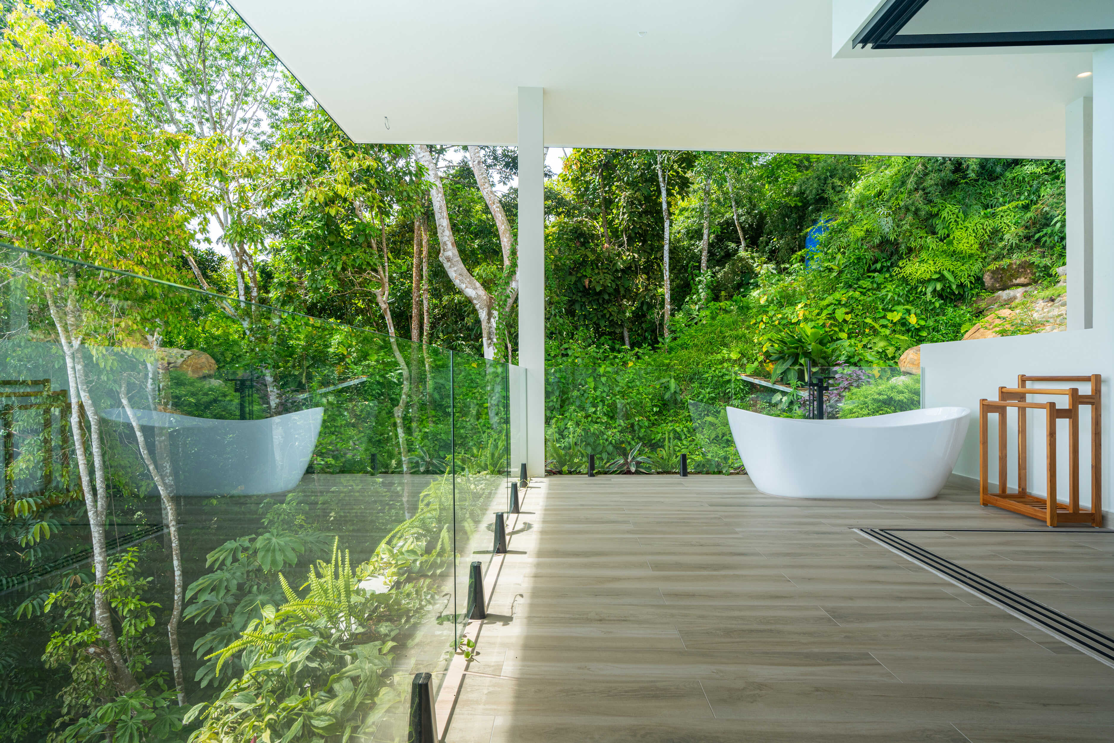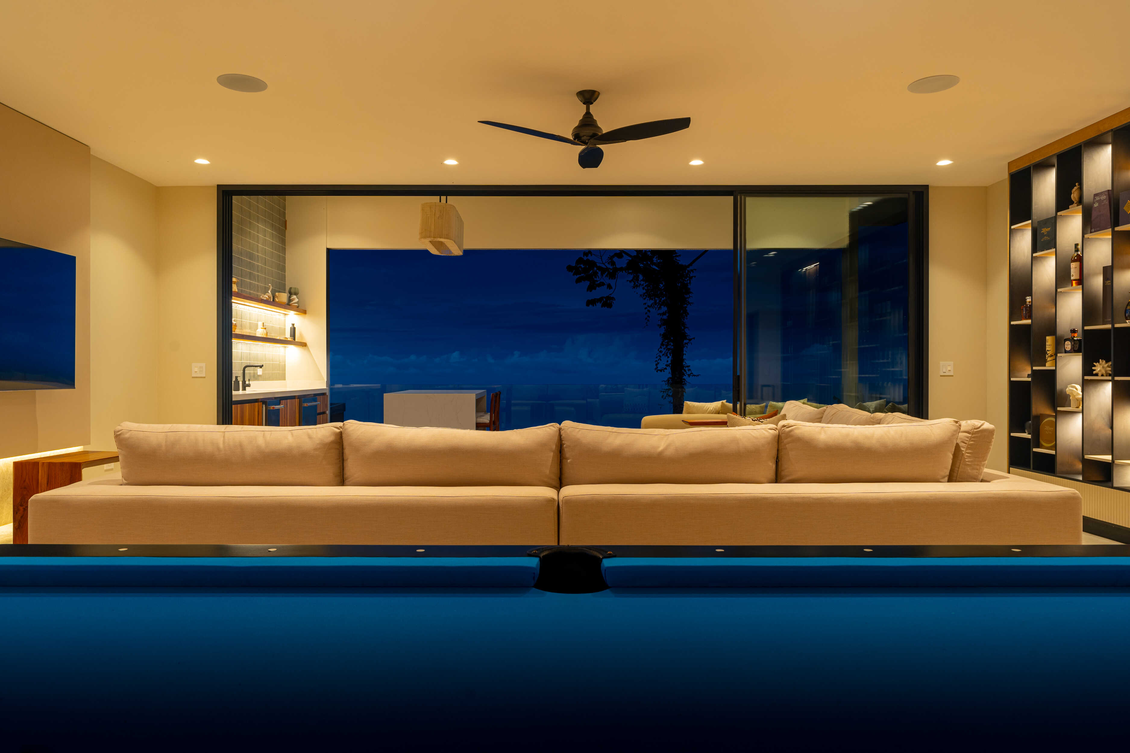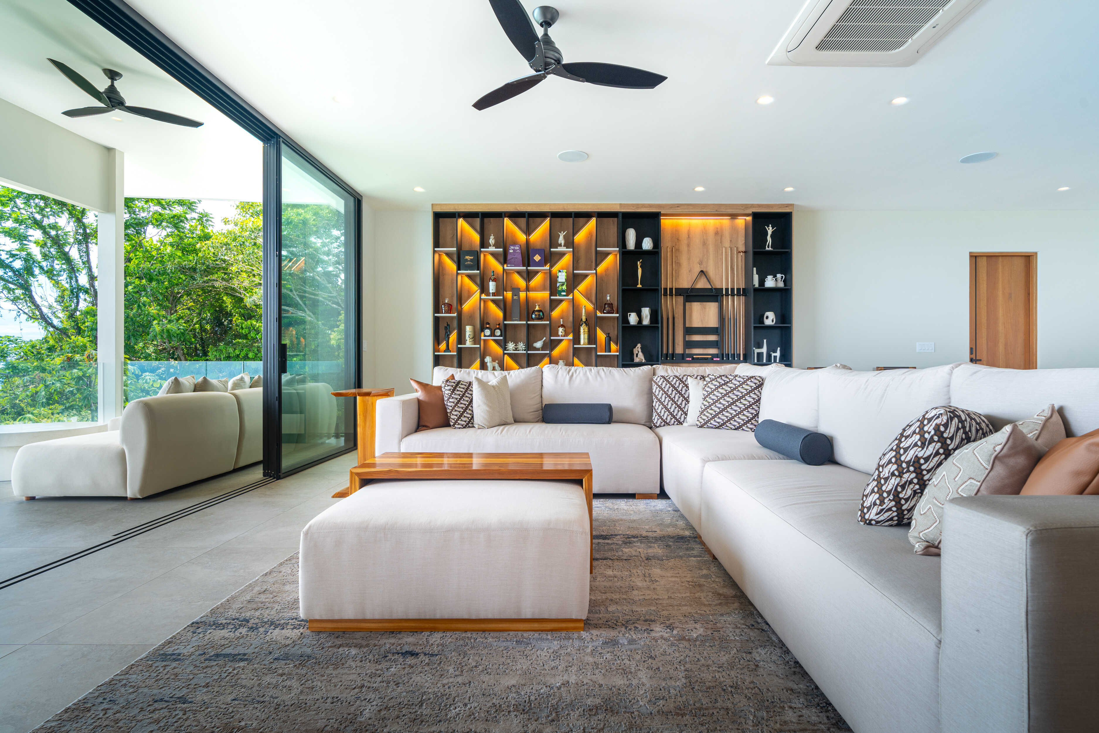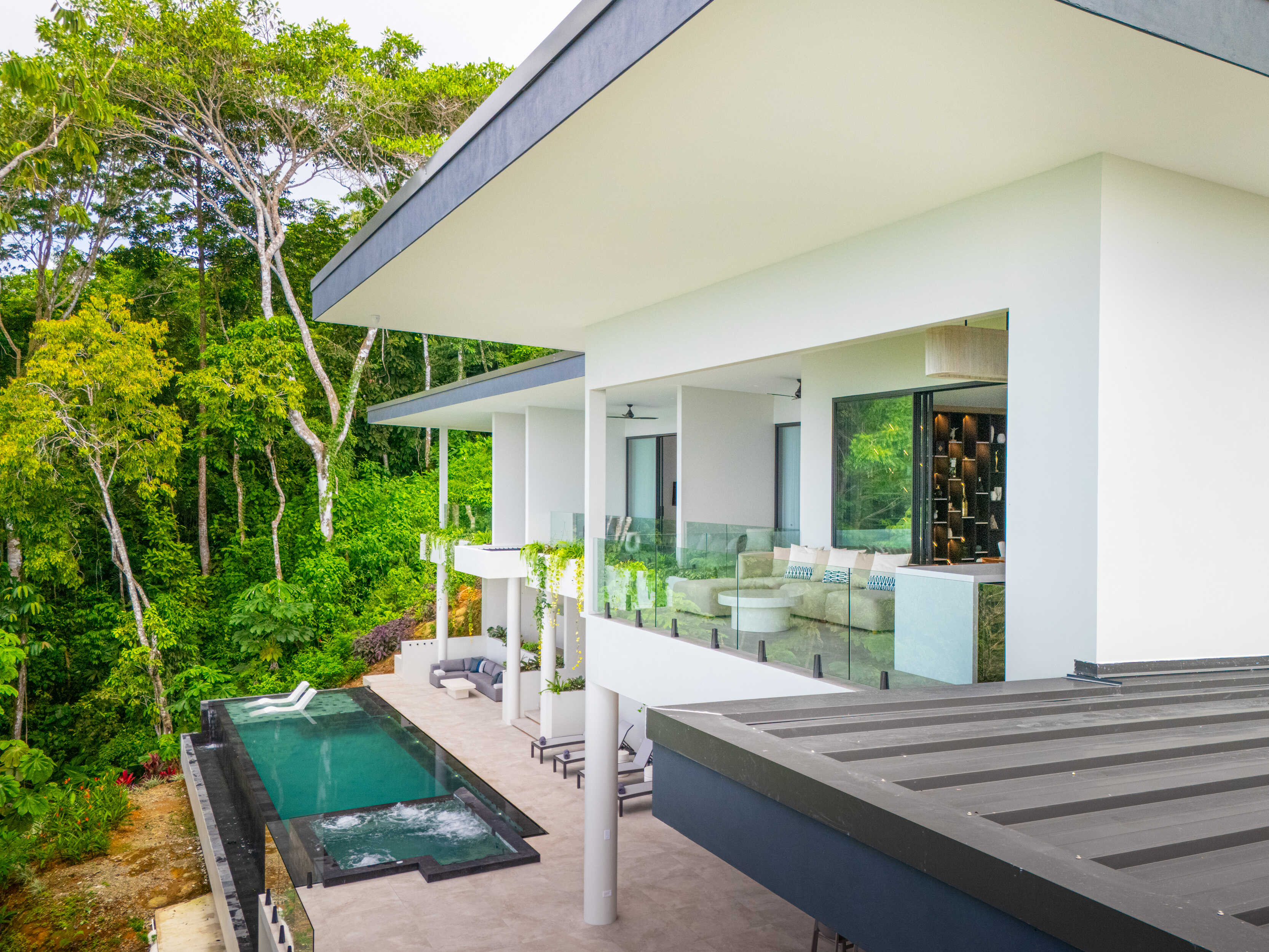 Every surface tells a story of excellence. Spanish anti-slip tile floors provide elegance and comfort underfoot. Electric custom shades move with quiet precision. At night, an LED lighting system transforms the home into a constellation of light, glowing softly against the rainforest backdrop.