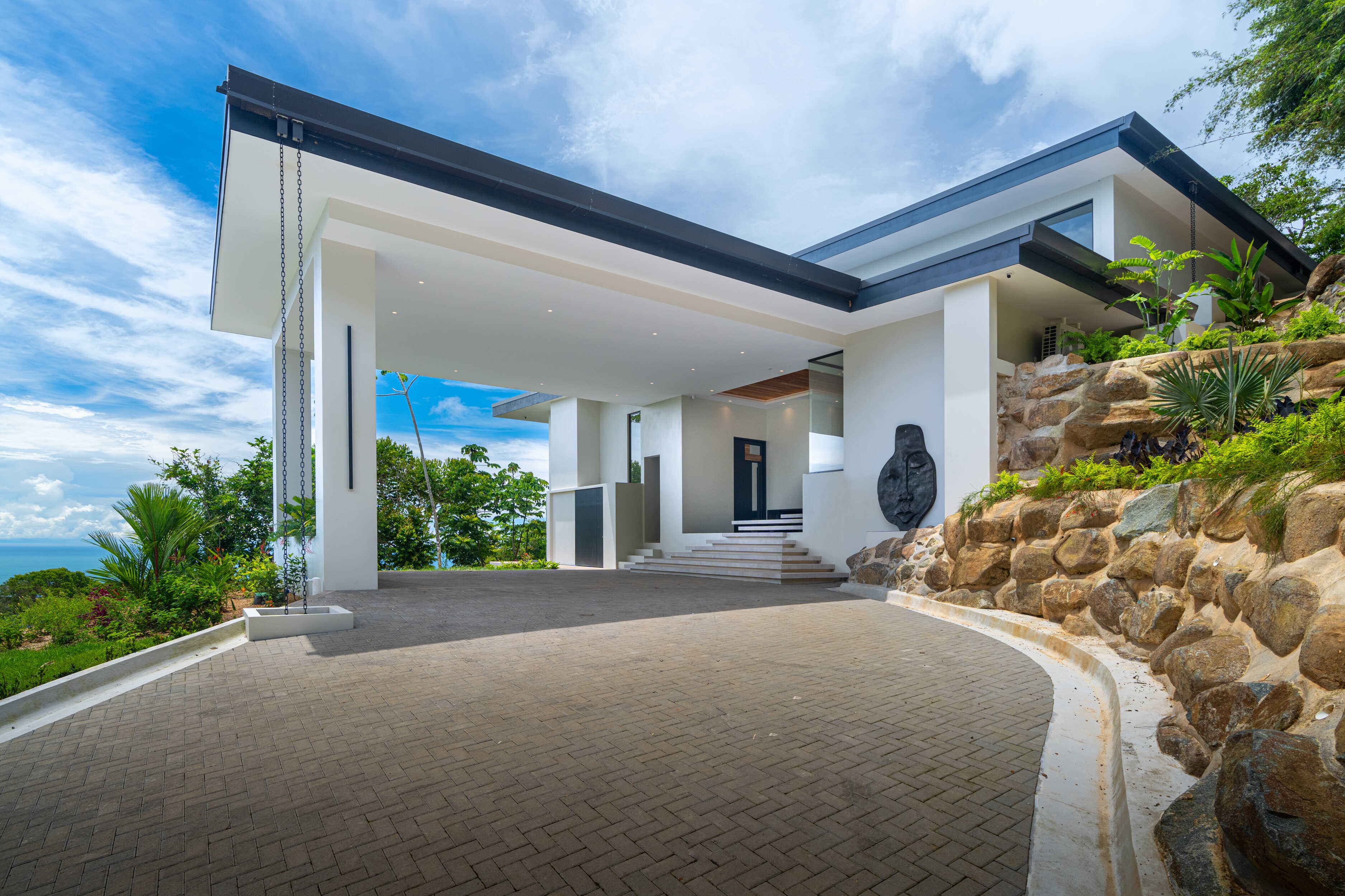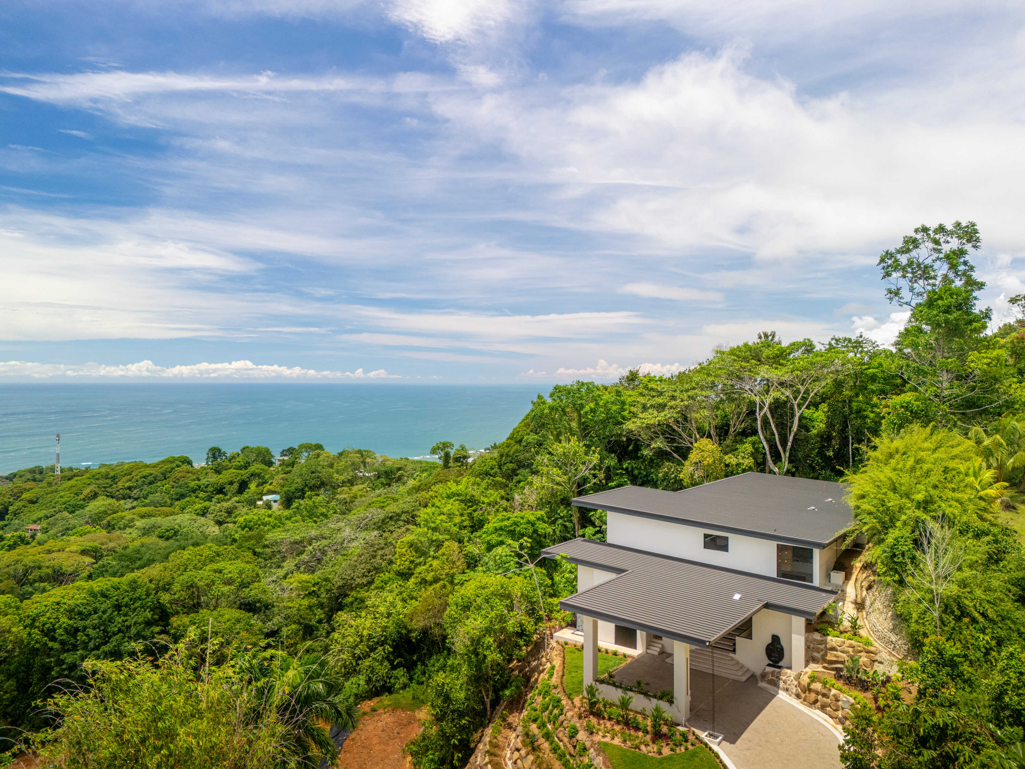 High above the Pacific, where the emerald ridges of Escaleras embrace the sea, stands Acqua Blu, a residence unlike any other in Costa Rica. Completed in 2025, this architectural masterpiece marries block, steel, stone, and glass in perfect harmony, a vision of modern elegance set within the raw beauty of the jungle.
