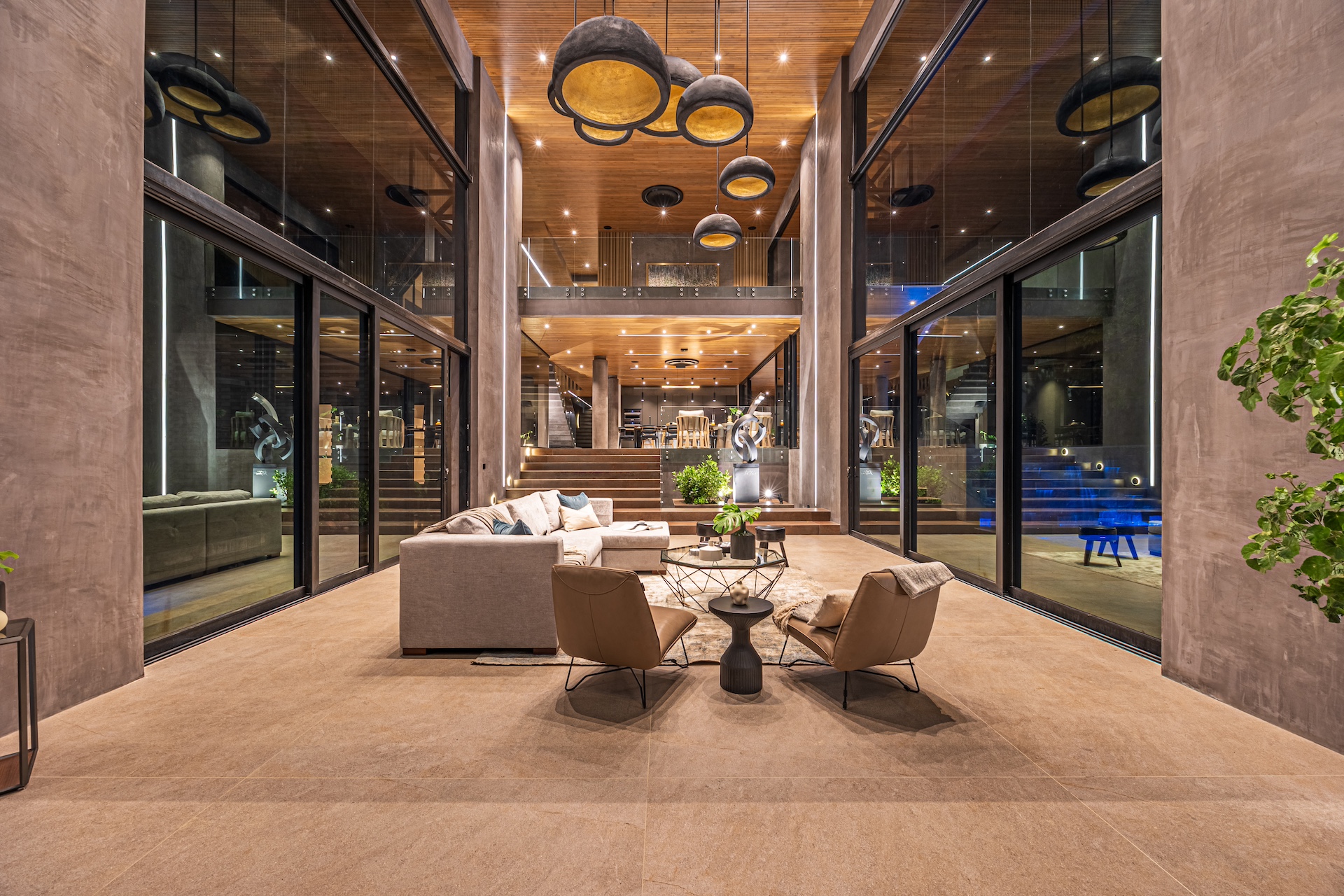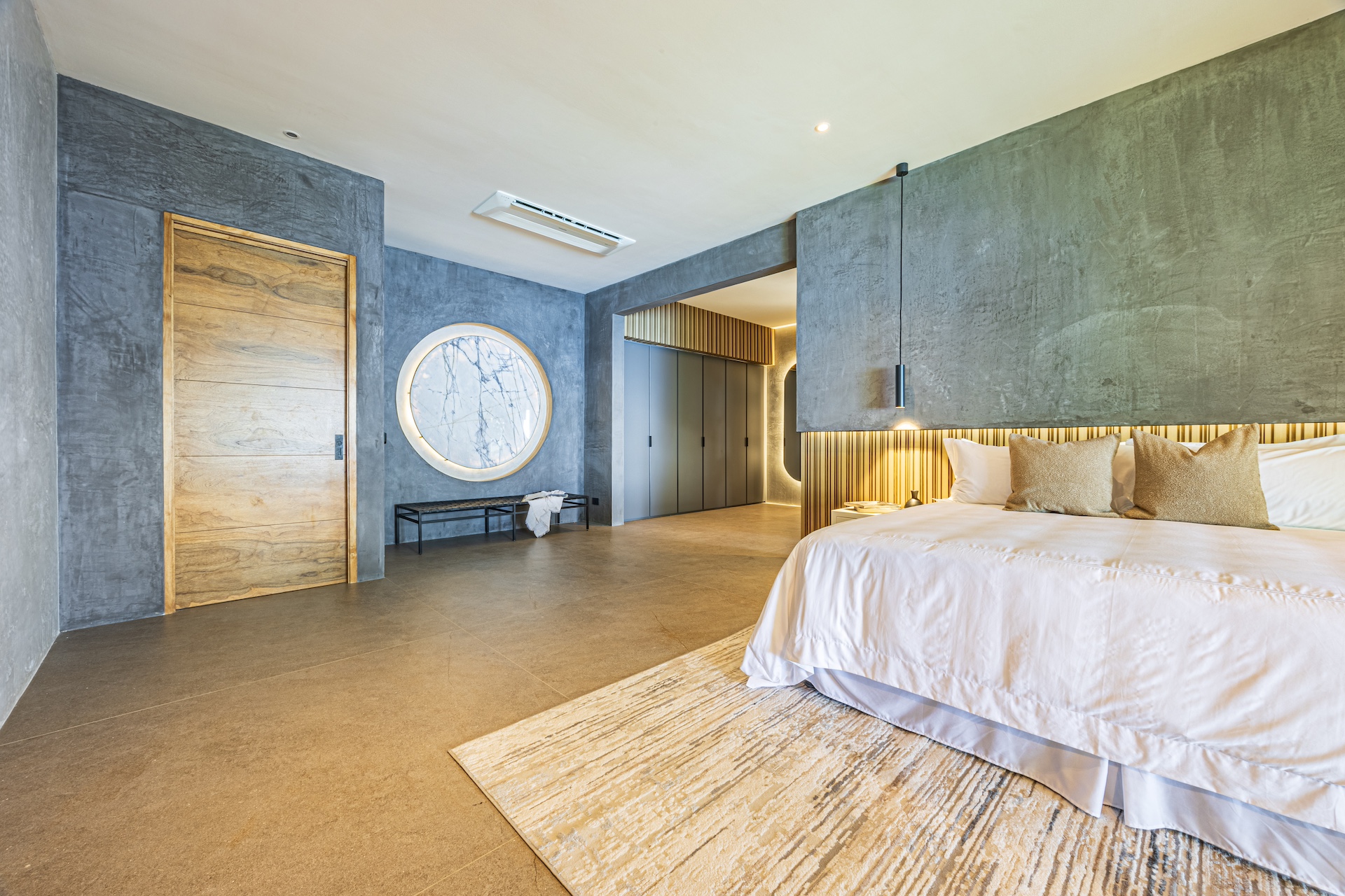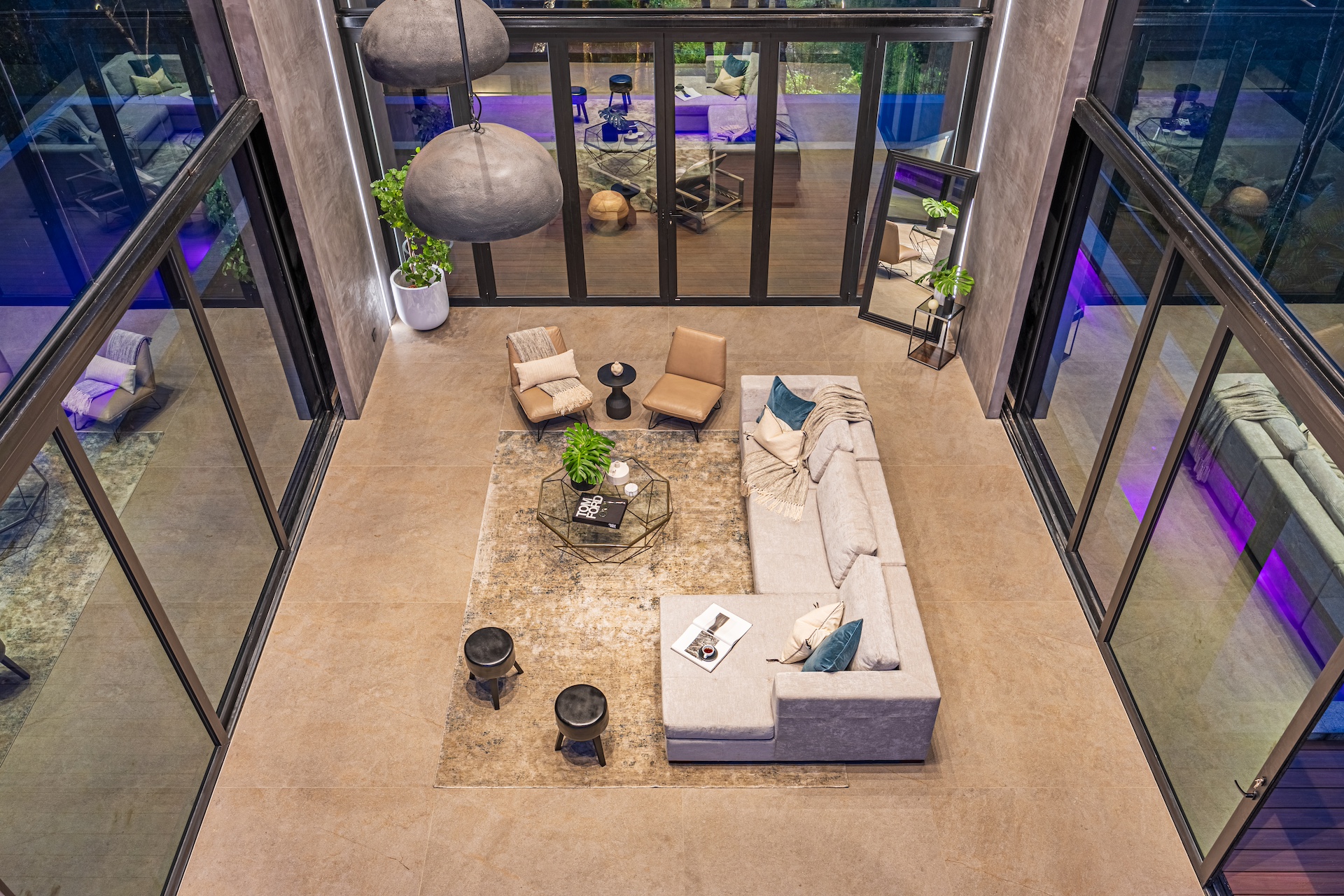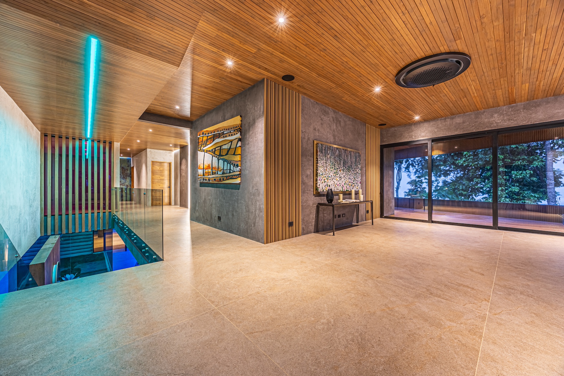 On the upper floor are 3 great bedrooms, all with ensuite bathrooms, adjoined by a large deck facing the ocean, ensuring ample space and enjoyment for family and guests. As the home is at an elevation of over 500 meters above sea-level, the view is dazzling. Also occupying the upper floor, is a gorgeous office with its own balcony, a generous gym and the second living room, adding variety to the social spaces available.
