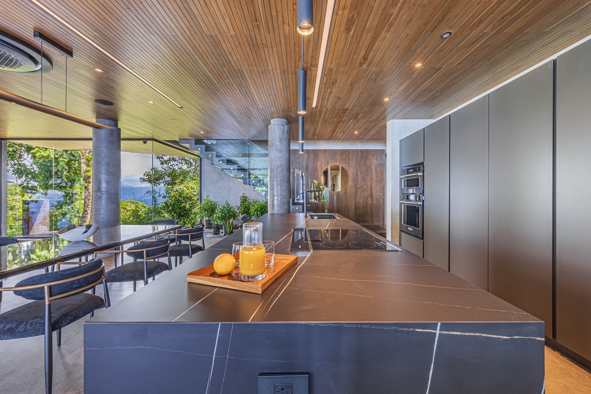 The principal kitchen and dining area, all open concept, is on the main floor - a mezzanine that looks out over the principal living room and pool to the jungle beyond. Once again, with open views on three sides, this kitchen is a dream come true for anyone who loves to cook or loves to have a chef to cook for them. It will be equipped with top-of-the-line appliances and amenities. Also found on the main level is a large bedroom with ensuite bath and personal deck, ideal for anyone with less mobility or simply uninterested in climbing steps to the bedrooms upstairs. Just past the main entrance is a separate housekeeper's quarters.