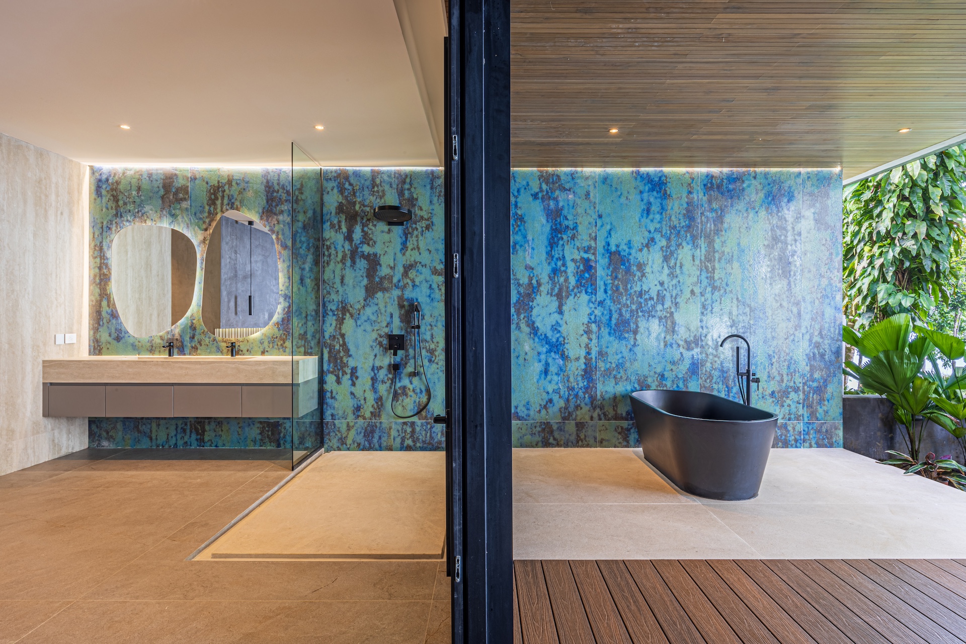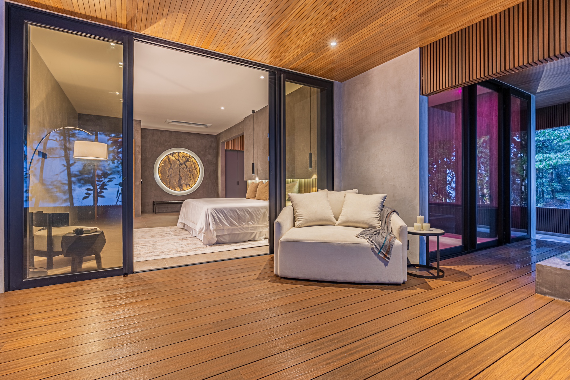 The grandest space is the primary living area with a cathedral ceiling of almost three stories encased in floor-to-ceiling windows conjuring the sensation of being seated within the canopy. This room is steps down from the main floor and leads out to a deck bordered by a Balinese-tiled wraparound pool effectively blurring the boundaries between inside and out.