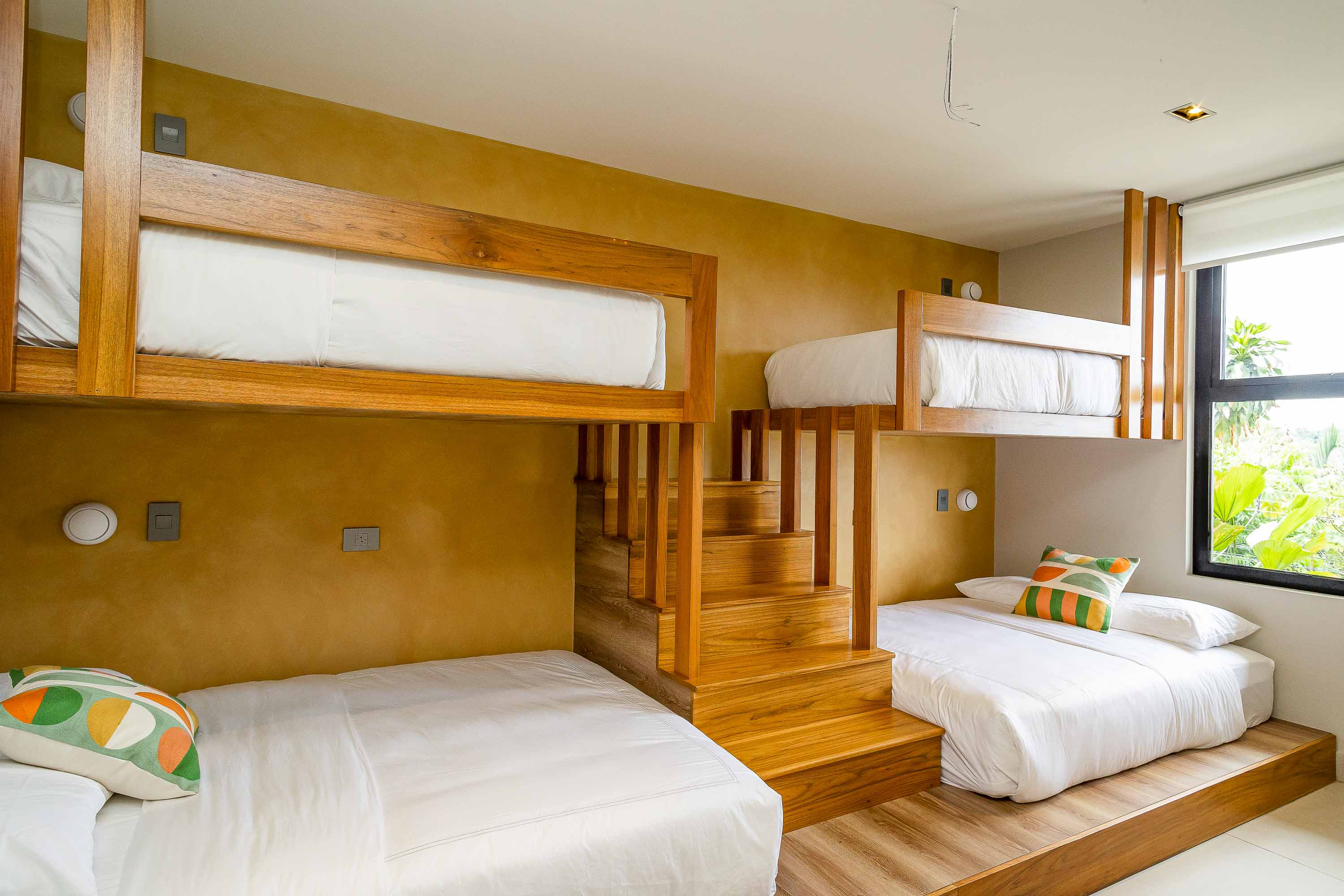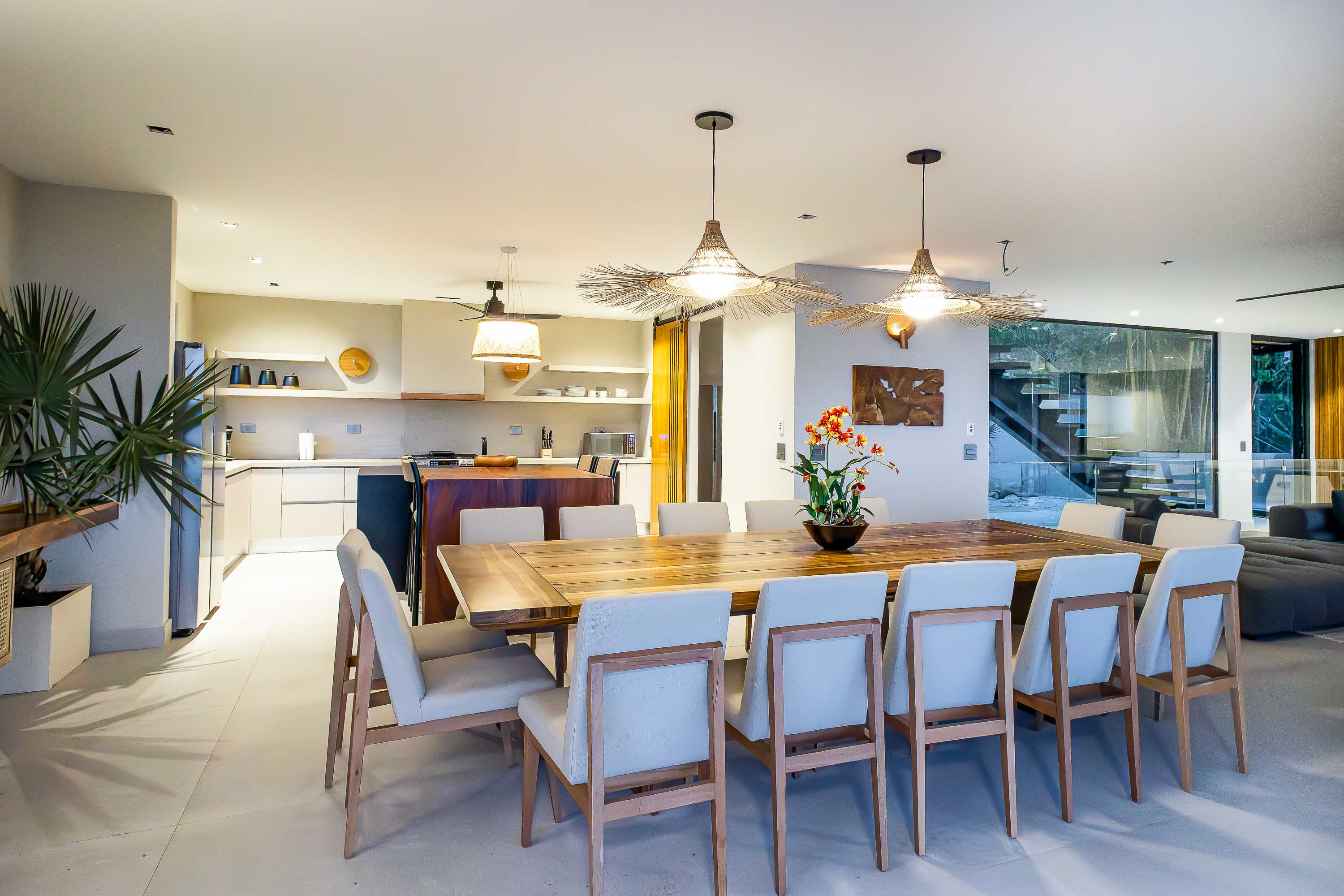 While the bedrooms are all private and designed to provide views from each space, the real showpiece of the home are the two top floors which host an enormous open floor plan kitchen, living and dining area for everyone to share, and the rooftop terrace and pool. The main common living, dining, and kitchen features floor to ceiling windows and a spacious atrium area, making you feel like you are suspended in the jungle canopy.