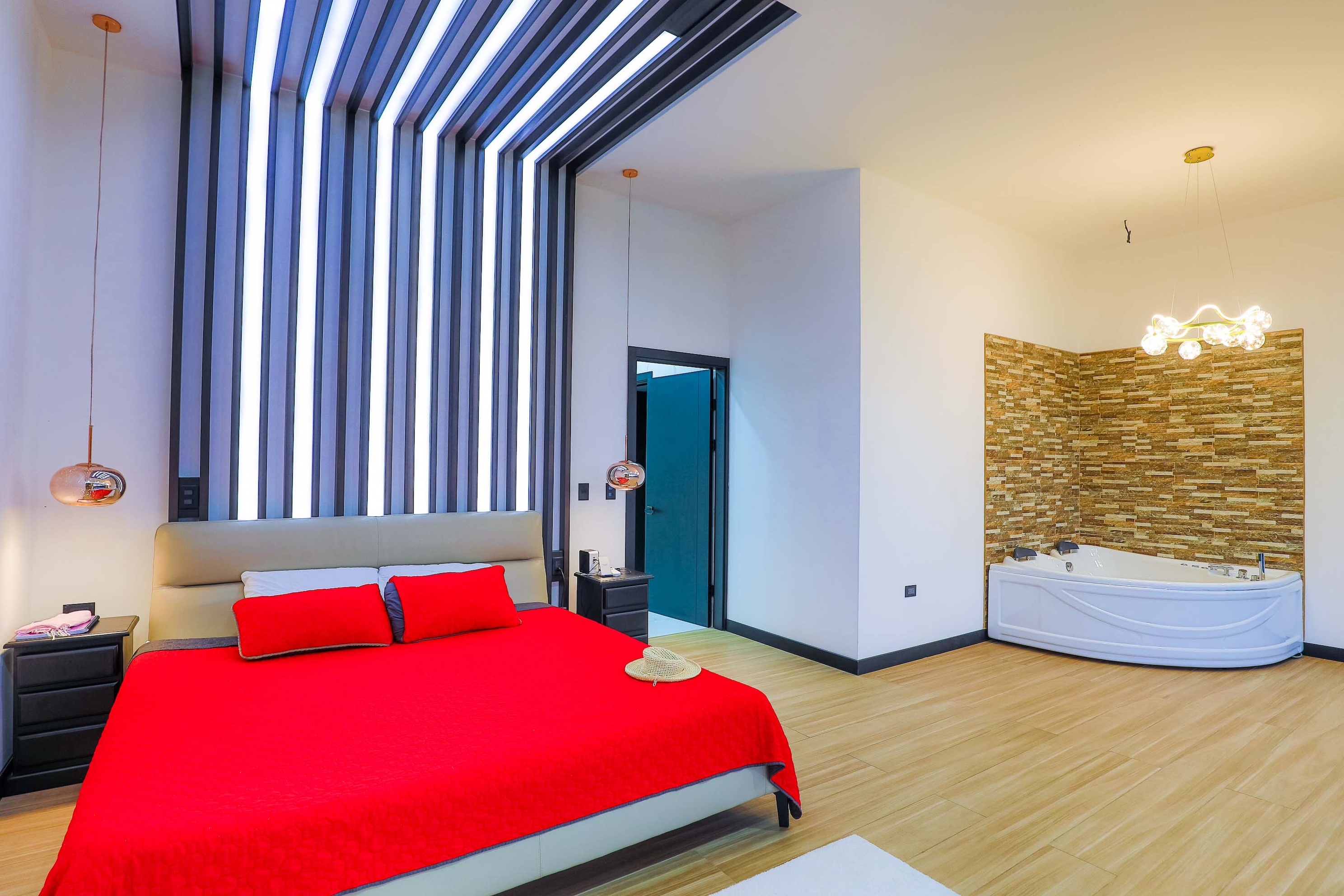 The upper level is dedicated entirely to the luxurious main suite, complete with a Jacuzzi, a large bathroom, and a dressing room. The ocean views from this private retreat are truly breathtaking.
