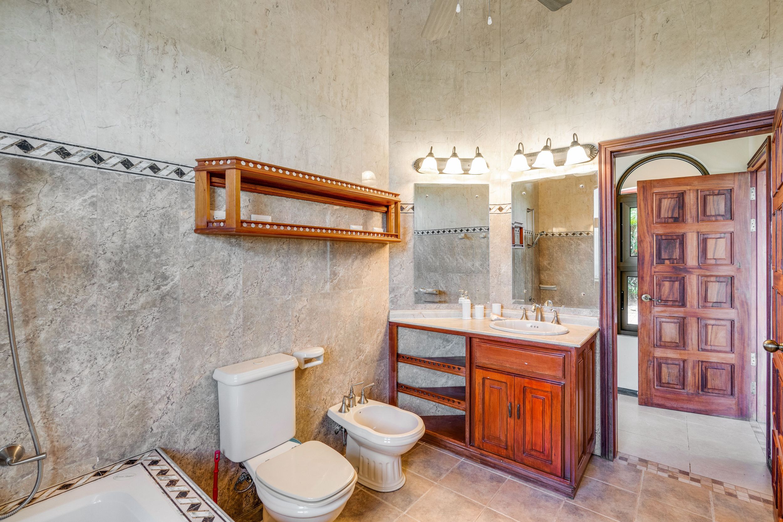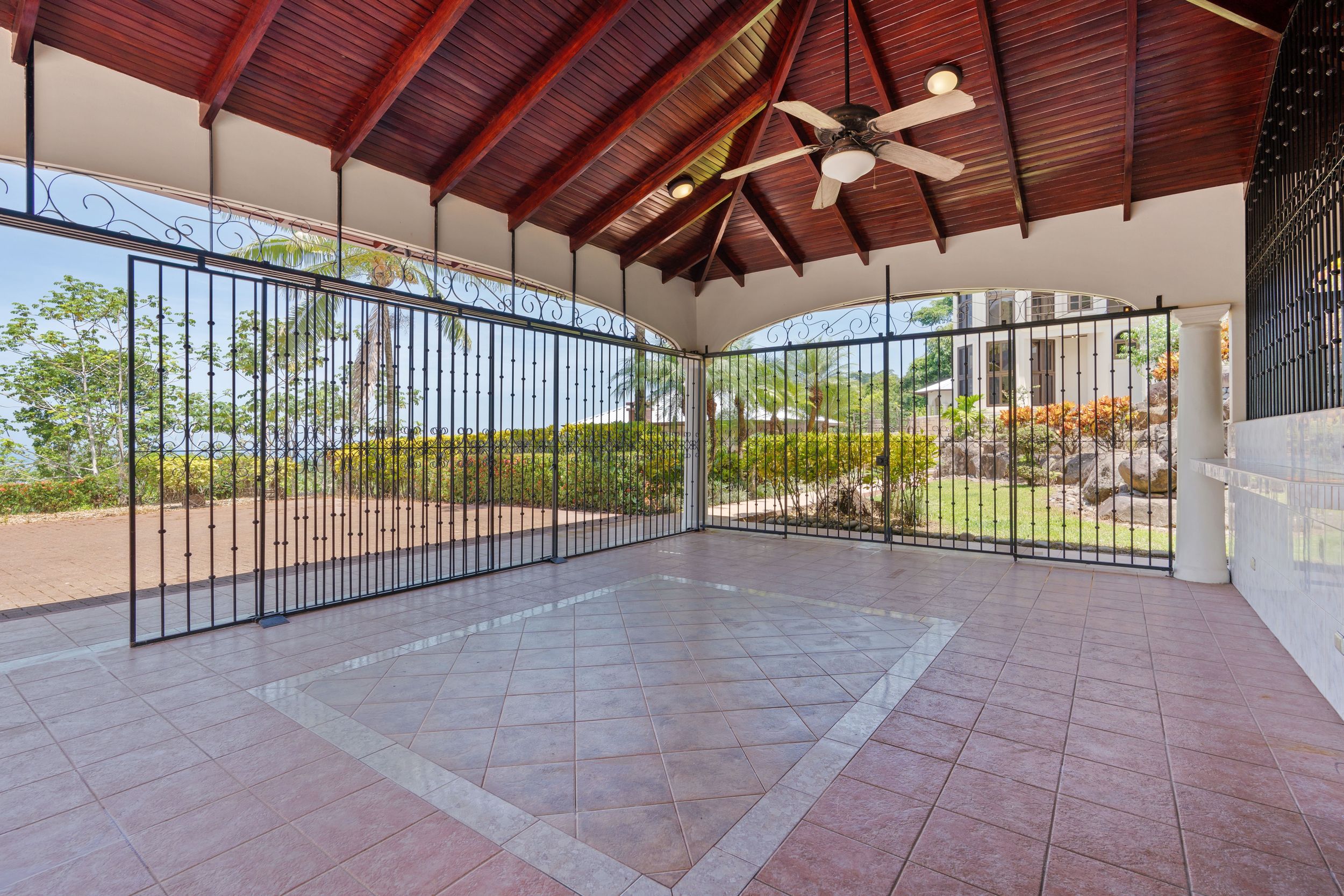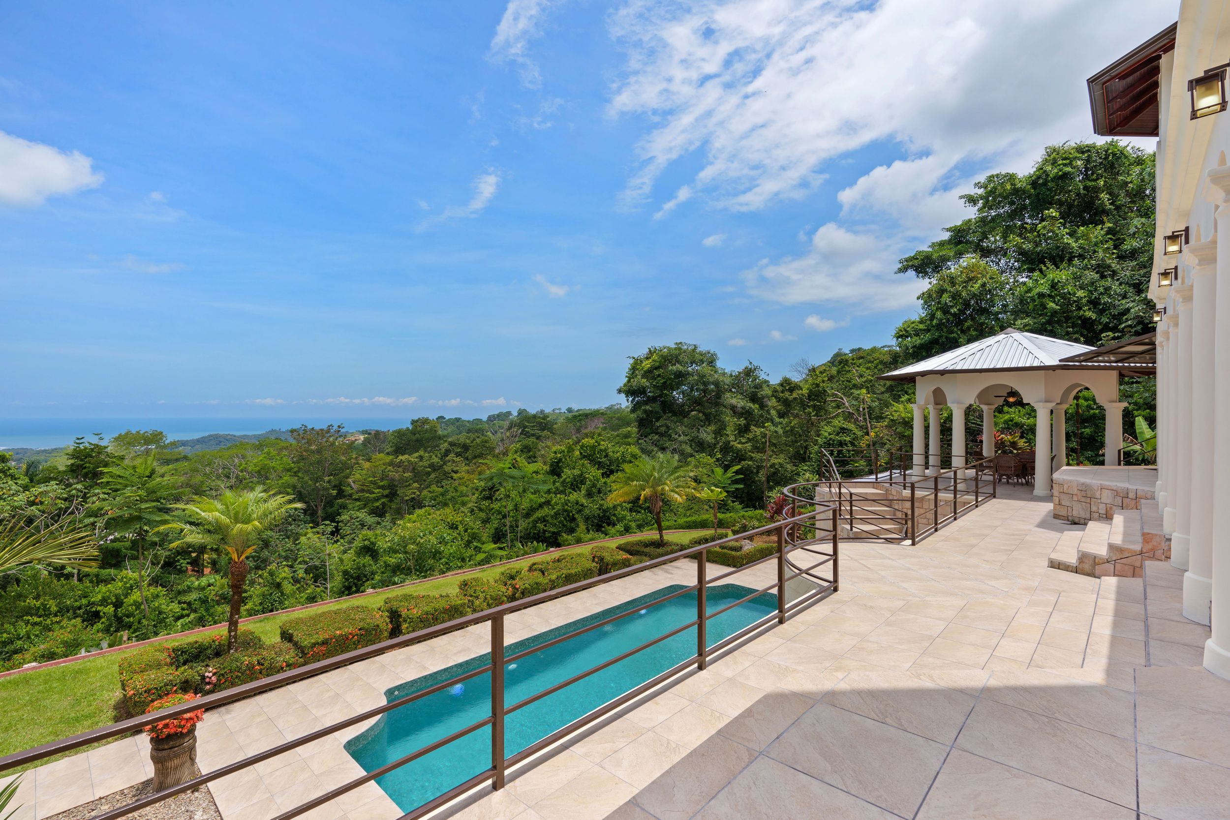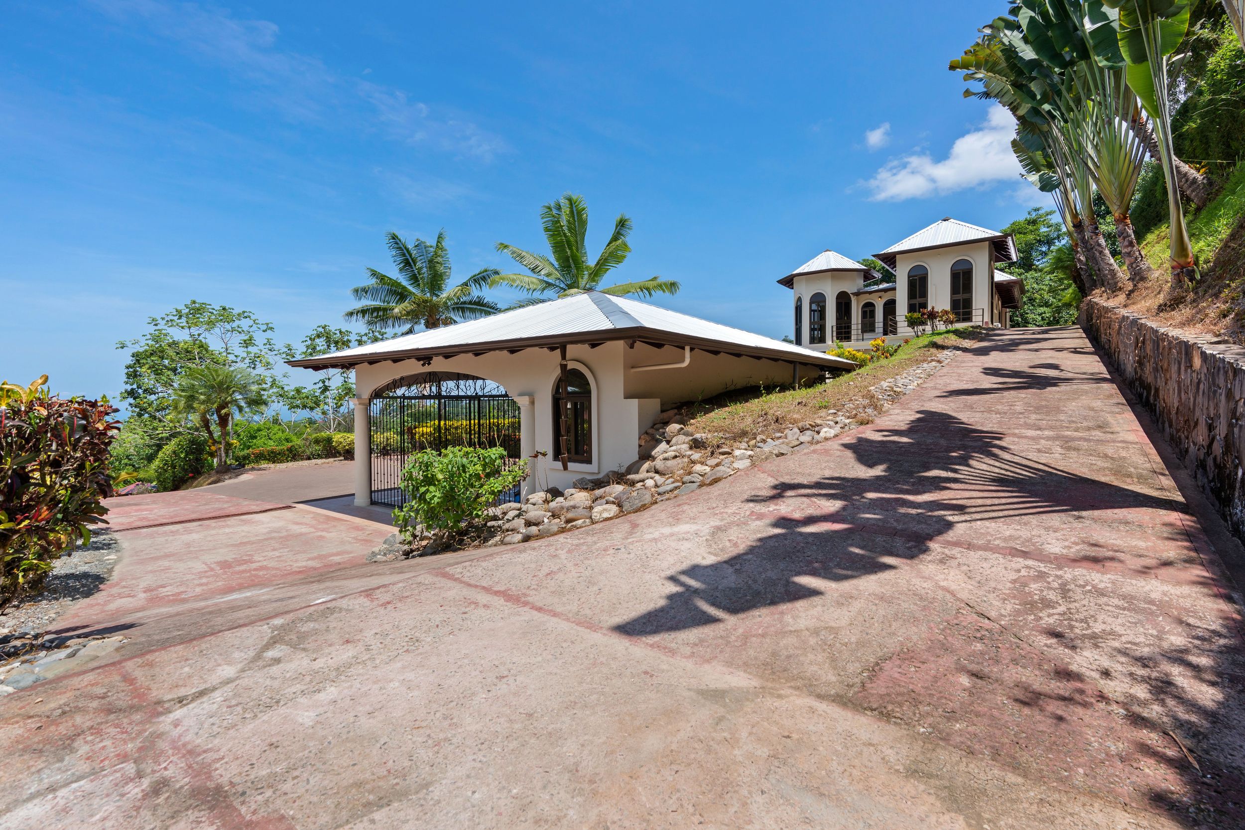 Main House and Pool The main house has a new roof, new railings, new paint, refinished wood kitchen cabinets and paneling made from Cristobal wood (one of the best hardwoods in Costa Rica), living room, and stair case. Upstairs are the 3 bedrooms, 2 full baths and an office, plus there is an entrance accessed by a concrete driveway that loops the entire home and property. The bathrooms feature marble counters and tiles from floor to ceiling.