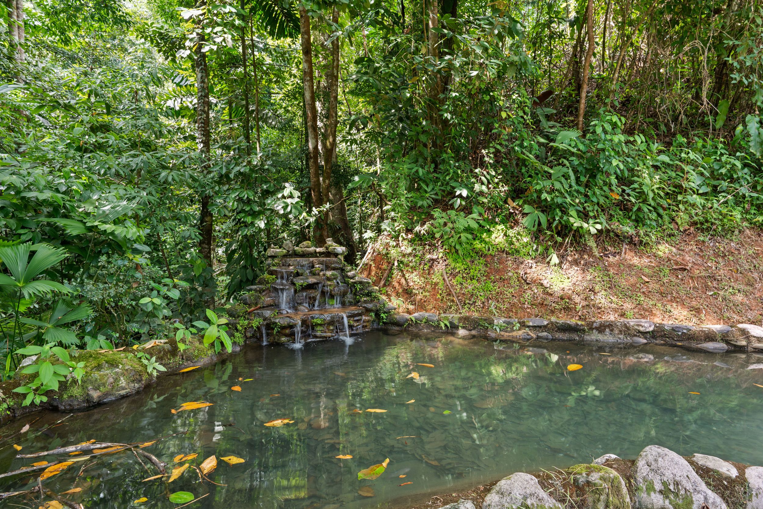 Guest Bungalow, Tilapia Pond, and Waterfall On the lower portion of the property you will find an open-air guest bungalow with two closed off bedrooms; each with on suite full bathrooms. The outdoor kitchen is a great place to BBQ some fresh fish from the rock and boulder made natural looking pond stocked with Tilapia. There is also a sauna plus hot and cold tubs for your own private spa experience. A short trail leads to the bordering creek with a 10-12 foot waterfall. This structure was also re-done with new ceilings and improved columns.