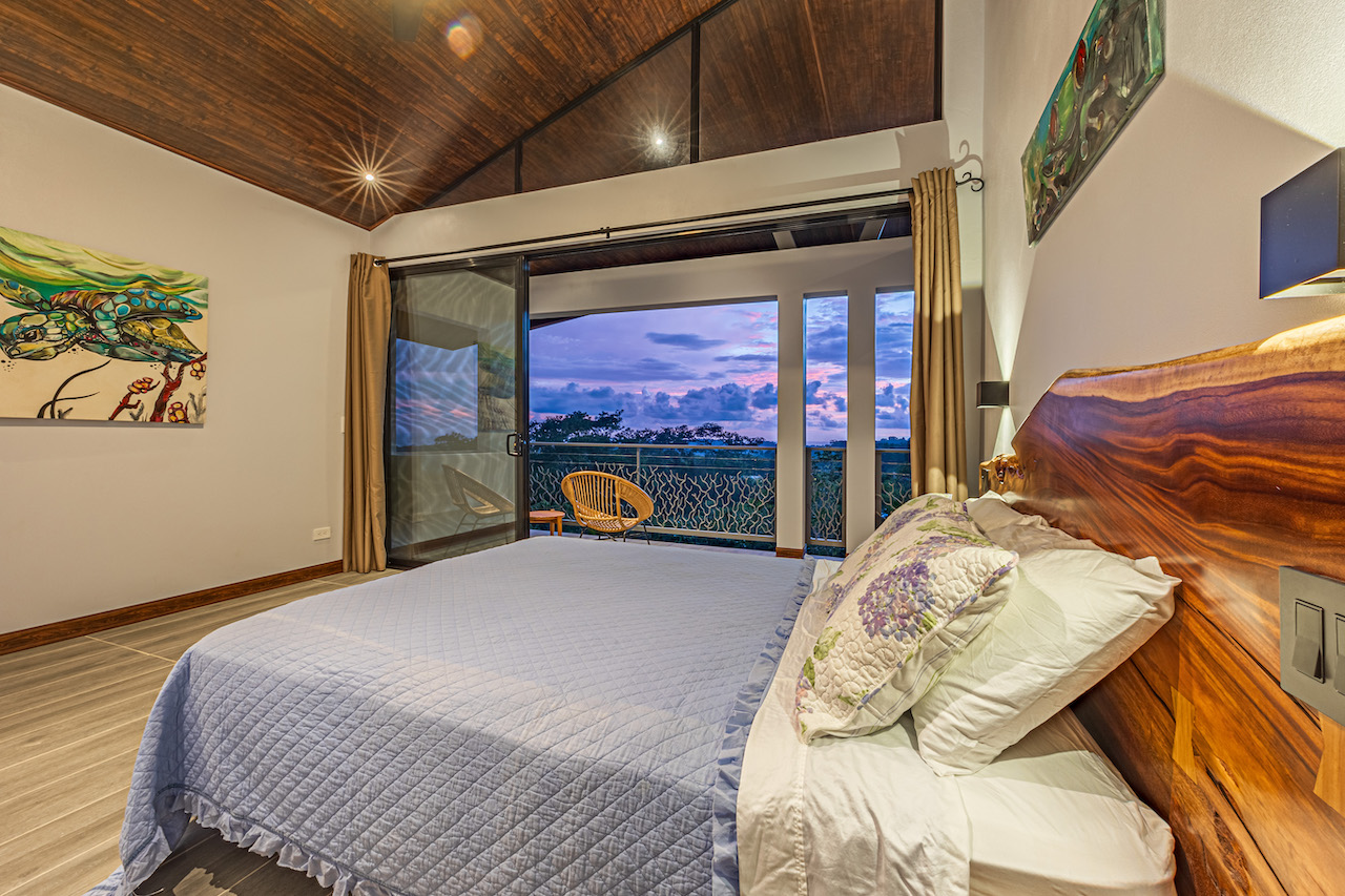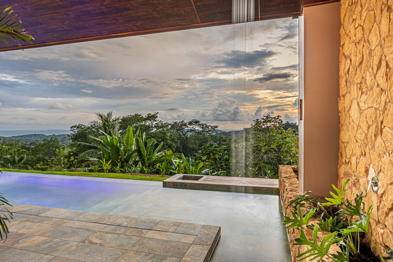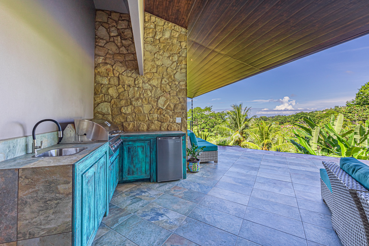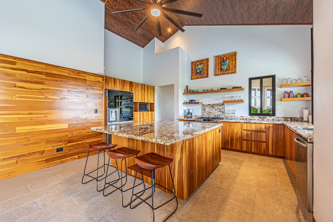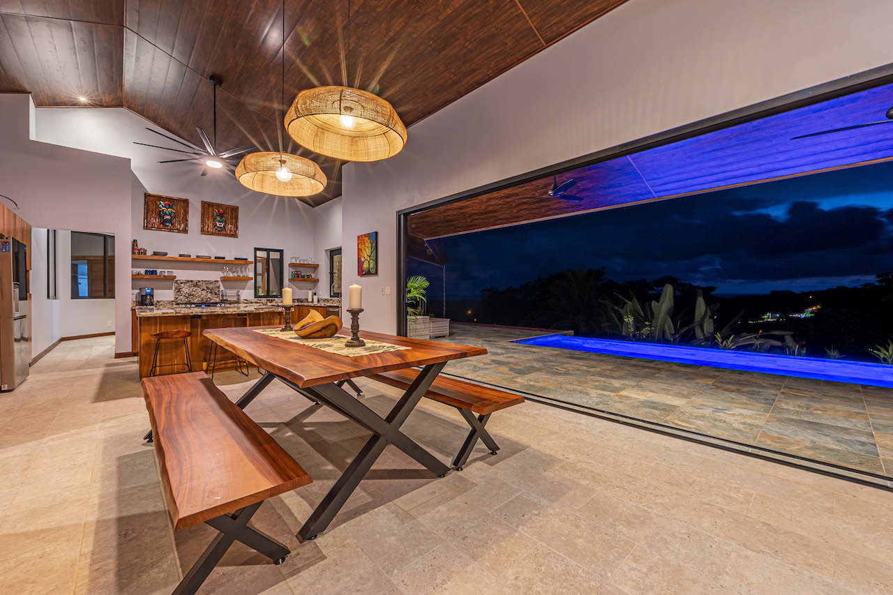 The entry to the home is magnificent featuring custom iron work fences and a perfectly planted back yard oasis. The roof is such that it allows for one to stay dry whether you are coming in with groceries or enjoying the back patio. Enter through the oversized laurel front door equipped with key pad to the homes entertaining delight. Large open concept with artesian guanacaste furniture, a large chefs kitchen featuring custom cabintry with an oversized granite island and counter tops. Enjoy the ability to fully open the accordion window above the sink to bring in those wonderful breezes. Hand crafted teak kitchen cabinets and wall decor are just a few features of this wonderful space. Conveniently located half bath is in easy access for entertaining featuring a guanacaste vanity. The gorgeous vanishing edge pool and decking that has been incorporated in the home is stunning. Simply unique and a show stopper! The outdoor bbq area with seating is sure to be one the the main areas one will enjoy daily. The home features three master bedrooms all with ensuites but the main principal bath an Integrated Bidet by Homary. The little things that can an owner can really enjoy. The guest master bedrooms feature large terraces, walk in closets and the ability to make the walk in shower inside or outside with a slide of a door. One features and soaking tub. Everything has been thought of! Planting for future abundance one will find two avocados trees- one Haas, one Fuerte, lemon tree, lime tree, mandarina, dwarf coconut and large coconuts. Ylang ylang, mimosa, lorita, rosemary and cilantro.