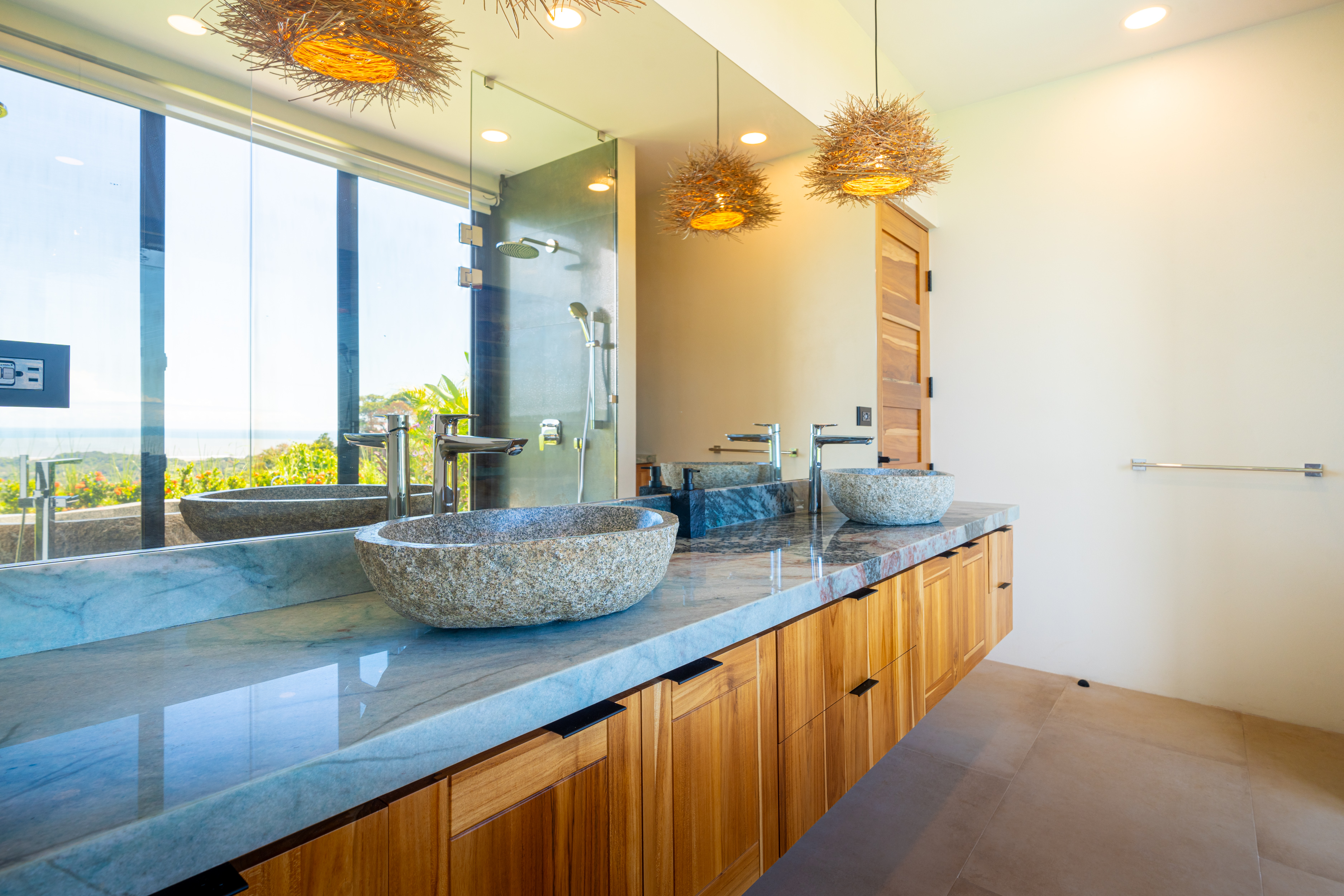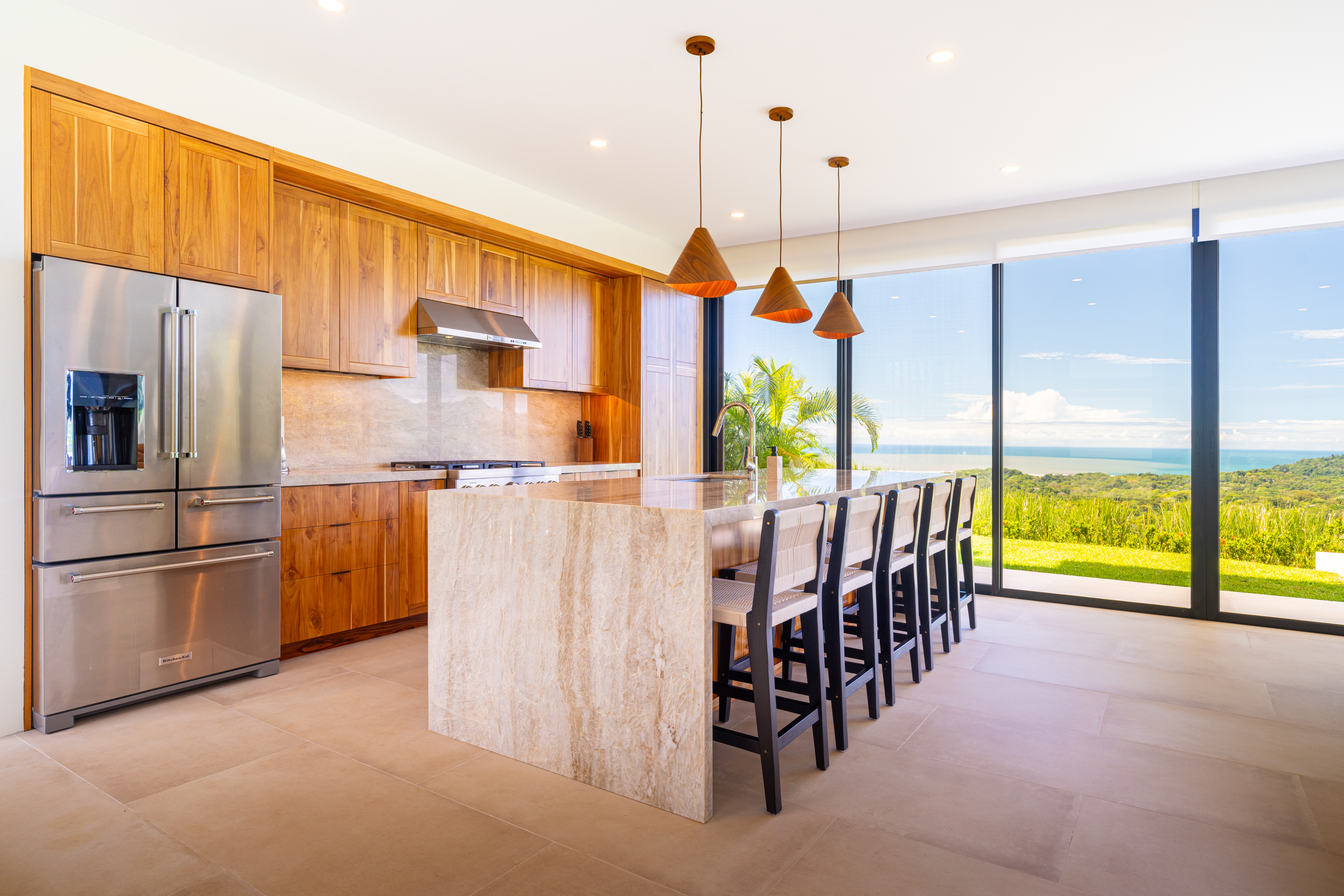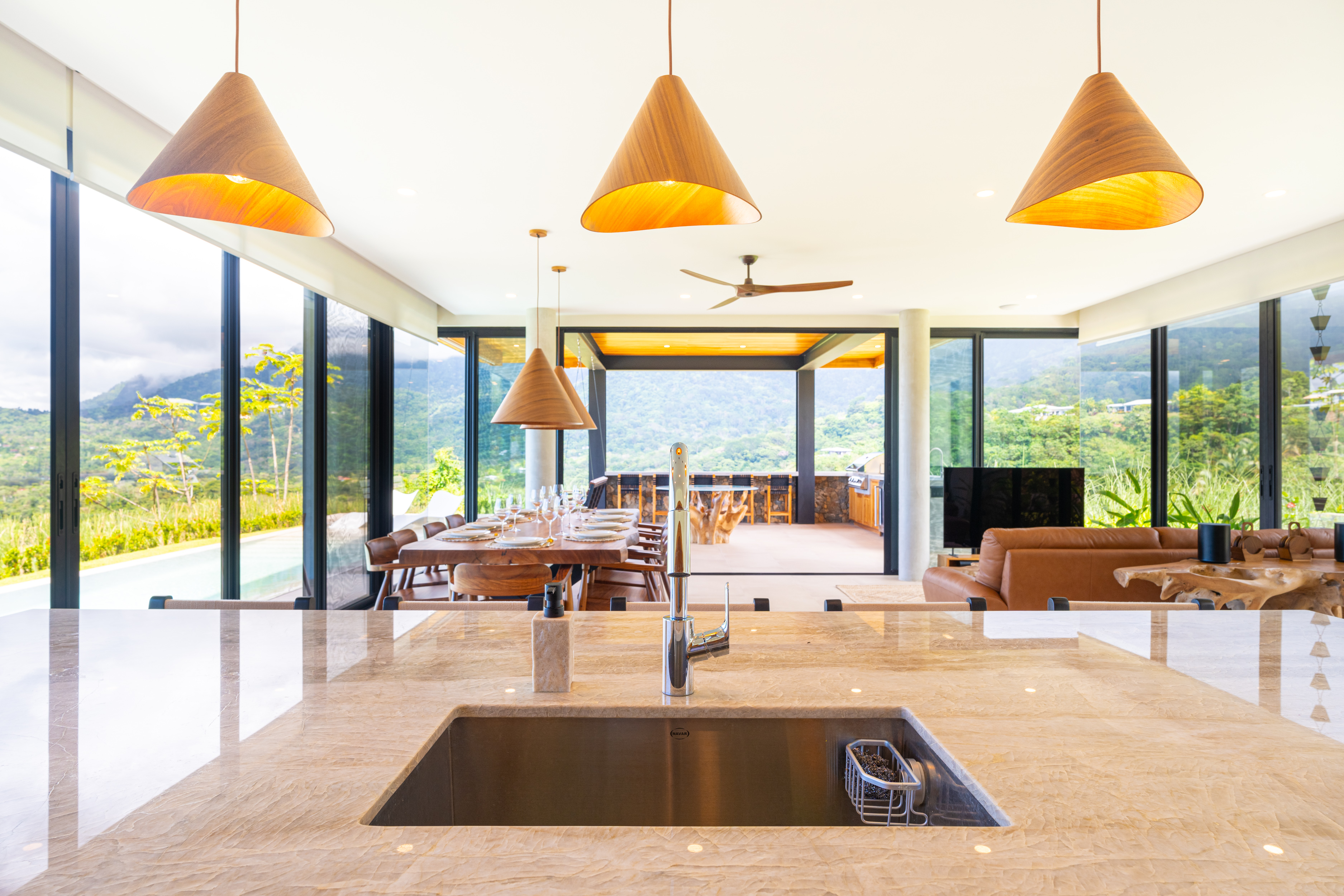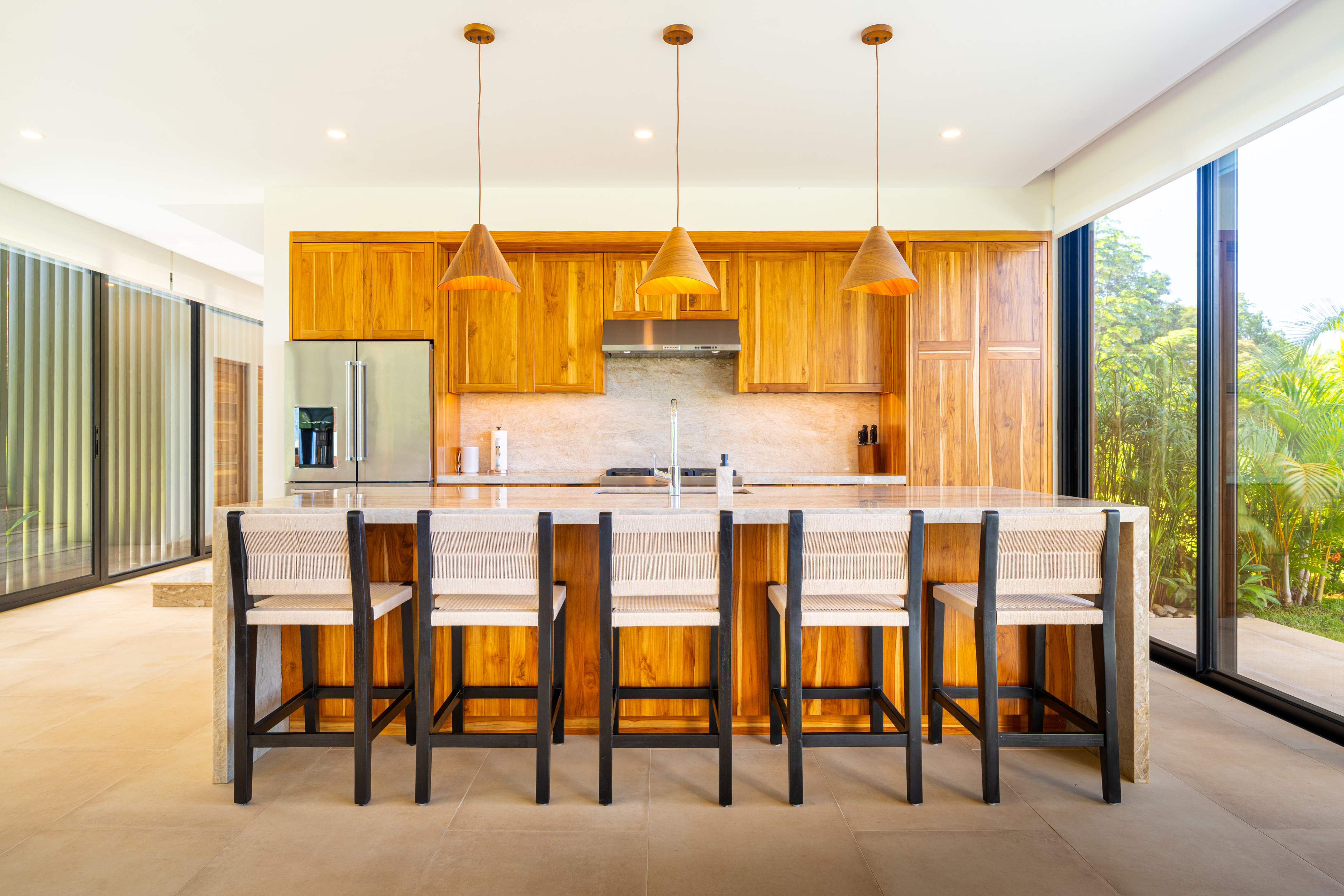 Step inside and the atmosphere shifts immediately. Cooler air. Near silence. A calming sense of serenity that's rare in tropical construction. Sandwich-panel roof insulation, Rockwool-insulated walls, and thick glass set into recessed tracks create exceptional thermal and acoustic performance while keeping insects and humidity at bay. This is a home that feels protected yet open, modern yet grounded. Design blends clean architectural lines with organic warmth. Polished concrete is softened by solid teak cabinetry, doors, and exterior ceilings. The kitchen is outfitted with quartzite countertops designed for real use. Bathrooms feature Hansgrohe fixtures and a refined, spa-like aesthetic. Outdoors, the ozone-treated pool provides crystal-clear water with minimal chemicals and has been tested extensively to ensure long-term integrity. Fully dimmable lighting throughout the residence allows the home to shift effortlessly from daytime openness to evening intimacy.