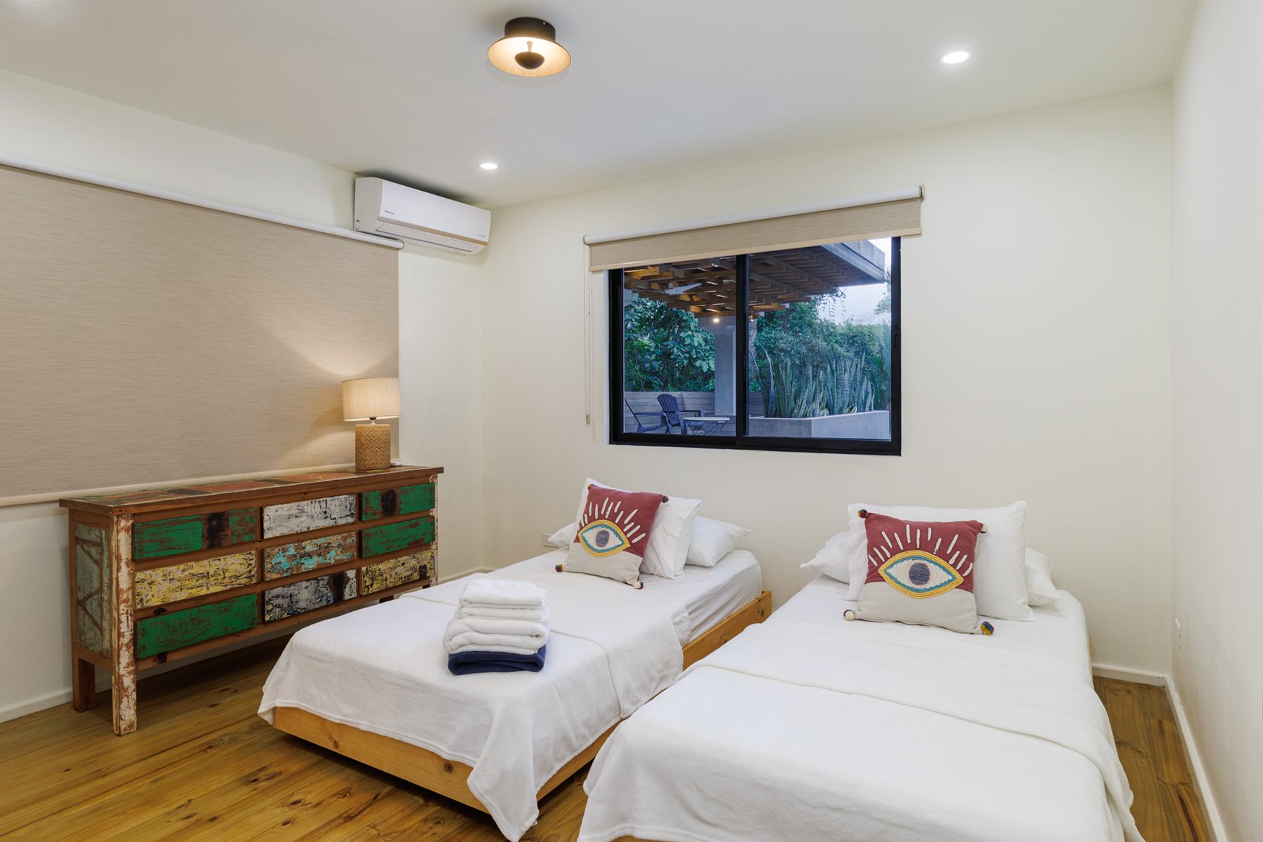 Two bedrooms, each with Daikin mini splits, each with a bathroom with a shower, the main one also with a walk-in closet and sliding glass door that goes to the terrace.