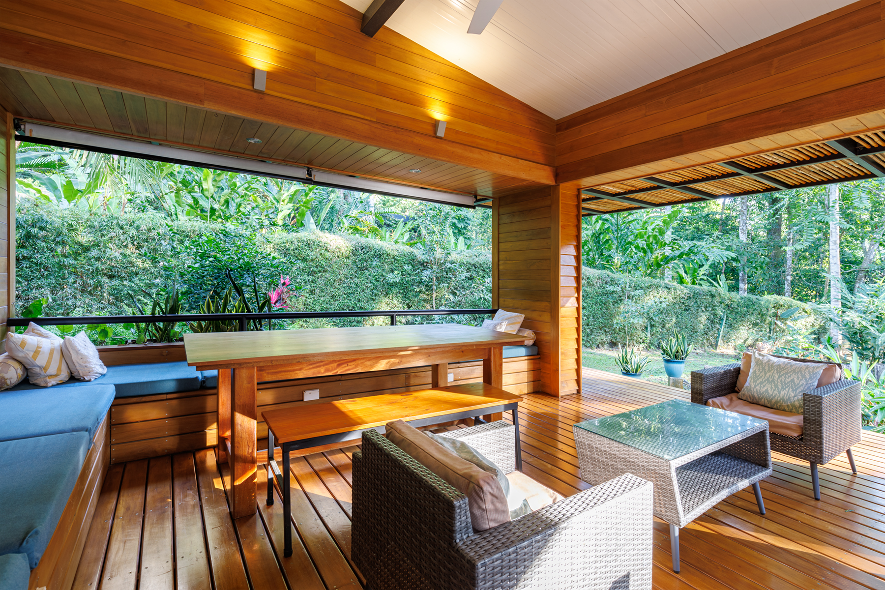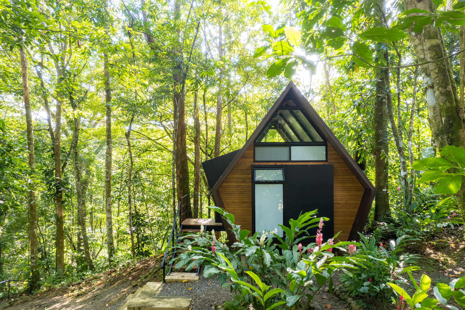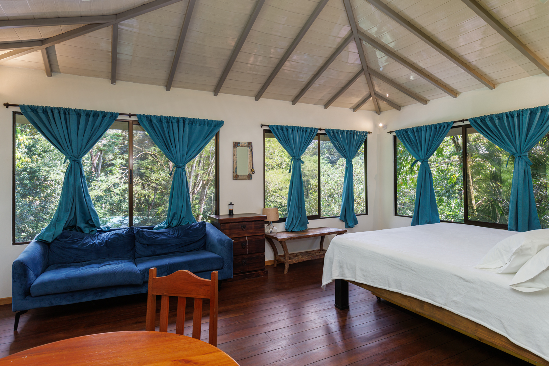 It is a beautiful modern cabin hanging on the top of the hill, surrounded by trees and also overlooking the river and the treetops. The Peacocks and Toucans play on the branches of the surrounding trees. Inside the house offers the room with a variety of built-in spaces, air conditioning and ceiling fan. Balcony, and full bathroom.