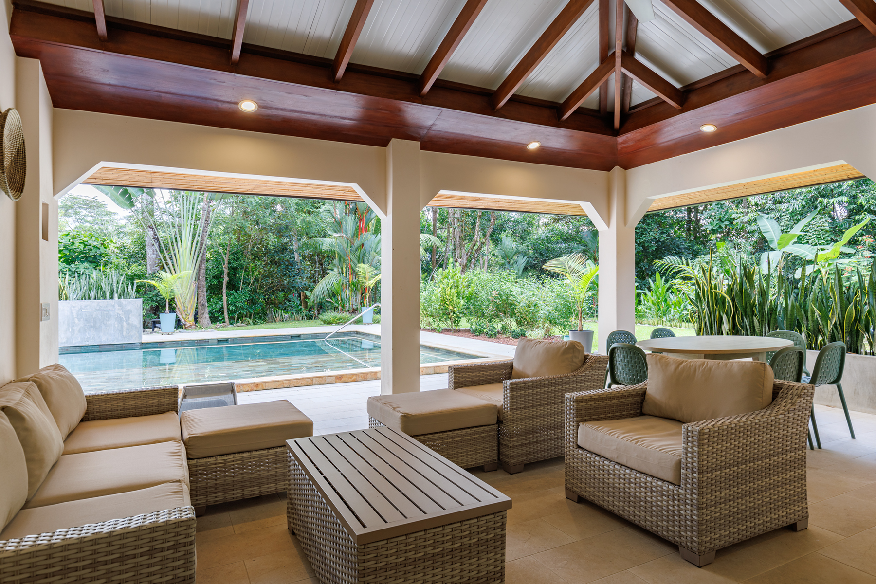 It has an approximate area of 142.18 m2. Located in the lower part of the property, close to the river, surrounded by gardens and lush Guanacaste trees. The house is a mix of materials such as polished cement and wood. It has 4 bedrooms, all with ceiling fans and air conditioning, two full bathrooms. The kitchen has white quartz countertops, gas stove with 4 burners, refrigerator, conventional oven, microwave oven, ceiling fan. In addition, it has a beautiful wooden terrace that functions as a living/dining room and is open to the gardens. There is a beautiful swimming pool with sunbathing area, all surrounded by gardens. Around this house there is space for additional units.