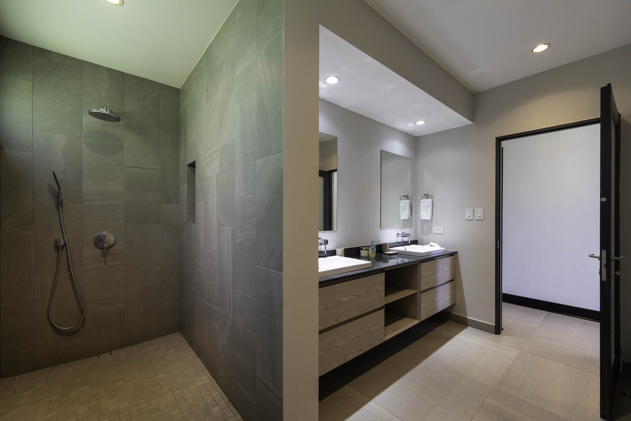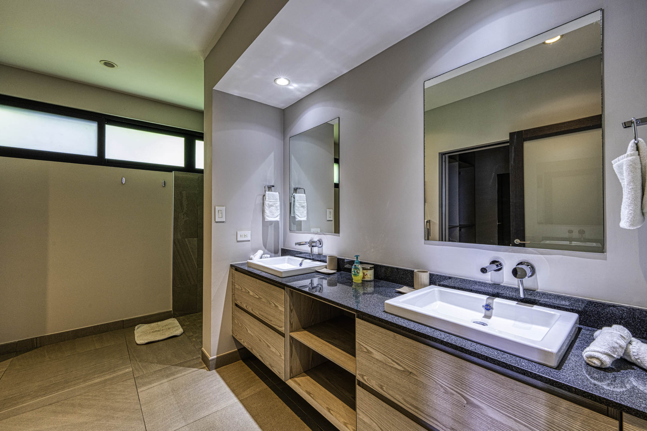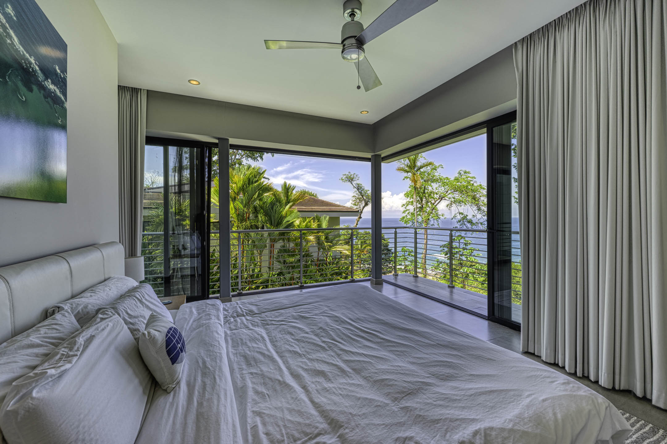 Three lavishly proportioned ensuite bedrooms offer ample room and storage, with a design focused on sleek lines and expansive floor-to-ceiling windows, inviting foliage, and refreshing sea breezes in each space. Every space in this villa acts as a portal to the captivating outdoors, where dense jungle meets the boundless expanse of the Pacific, presenting breathtaking panoramas from all angles. Two of these bedrooms are master suites, each with a balcony overlooking the ocean, where you can see whales jumping in the blue Pacific waters.