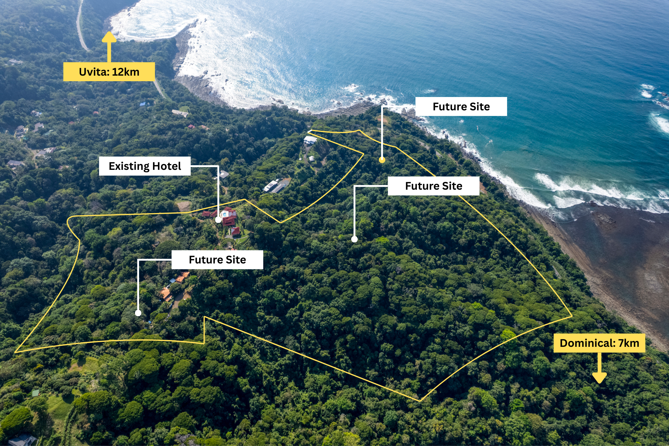 The property sits on elevated terrain with a natural plateau offering expansive Pacific Ocean views, descending gradually into protected rainforest. This topography supports a flexible, low-density master plan that can accommodate a range of uses, including a wellness-oriented hospitality concept, private residences, or a mixed-use development combining both.
