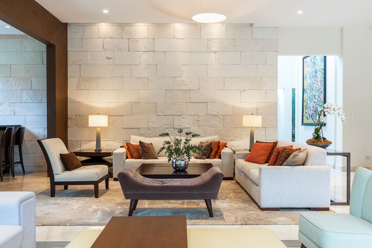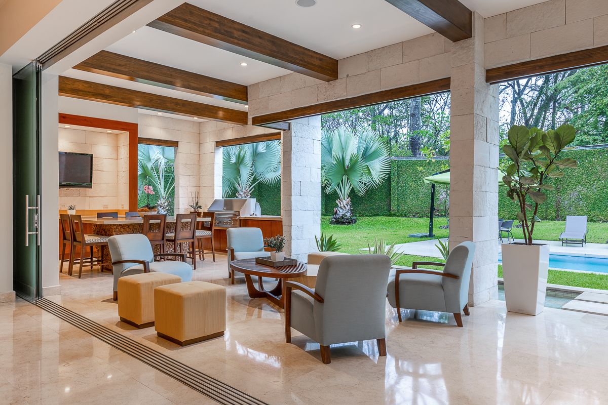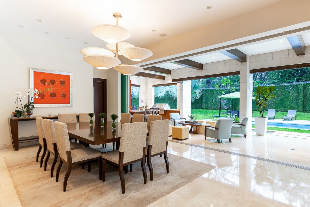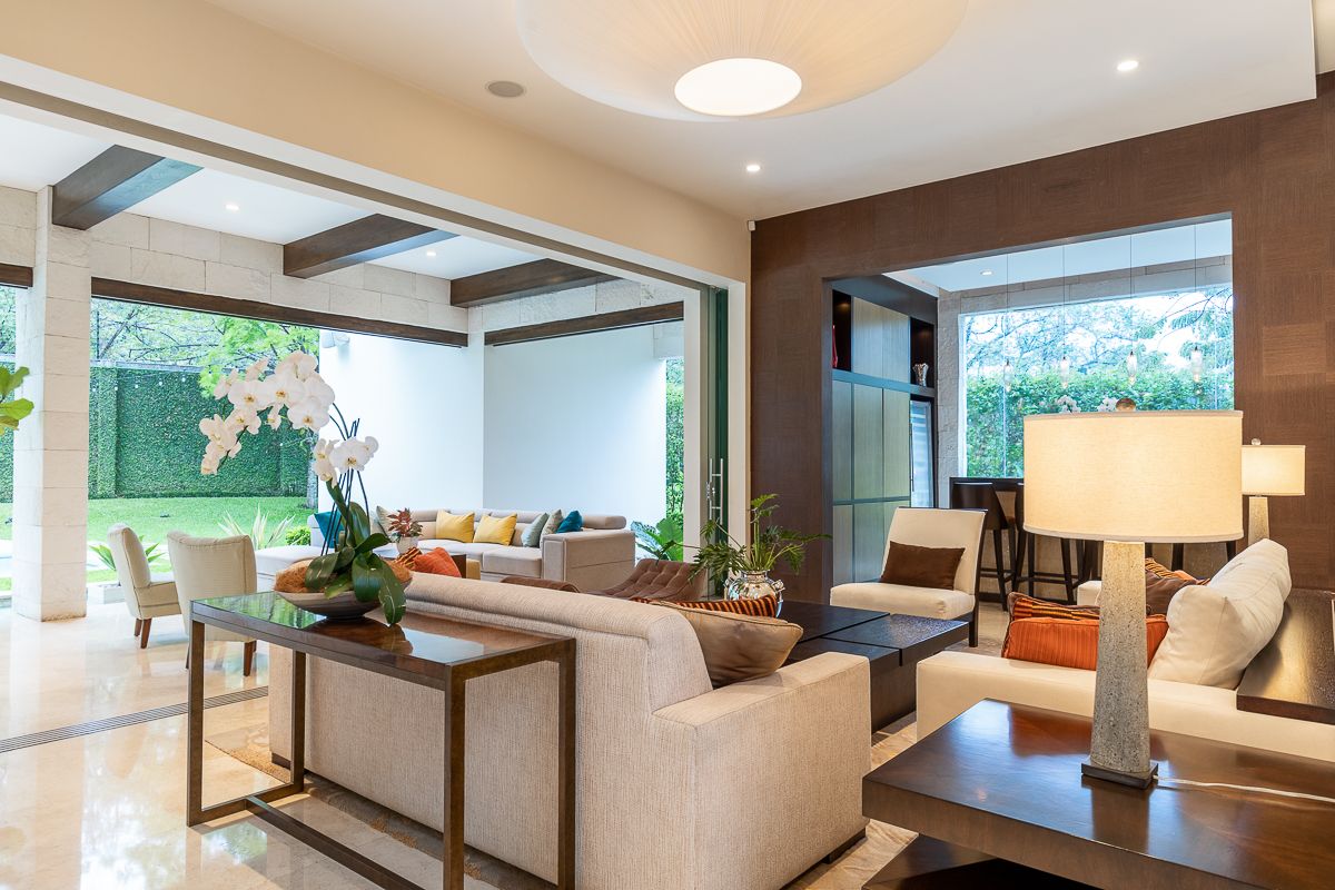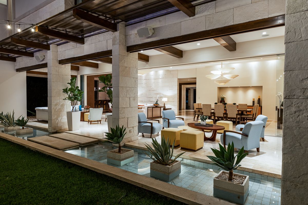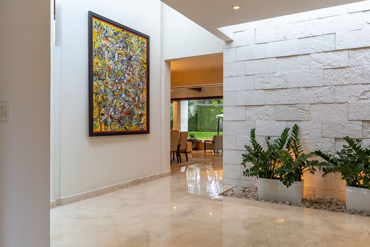 This elegant luxury home for sale in Residencial La Hacienda was designed in a contemporary style. The work of the renowned architect Jean Garnier, it is an example of high design, ideal spaces and good taste. The beautiful path to the large front door is a harmonious blend of modern water features, vegetation and rich textures achieved through the limestone that covers several external and internal walls of the house.