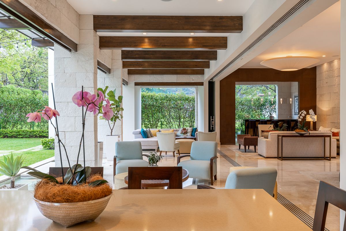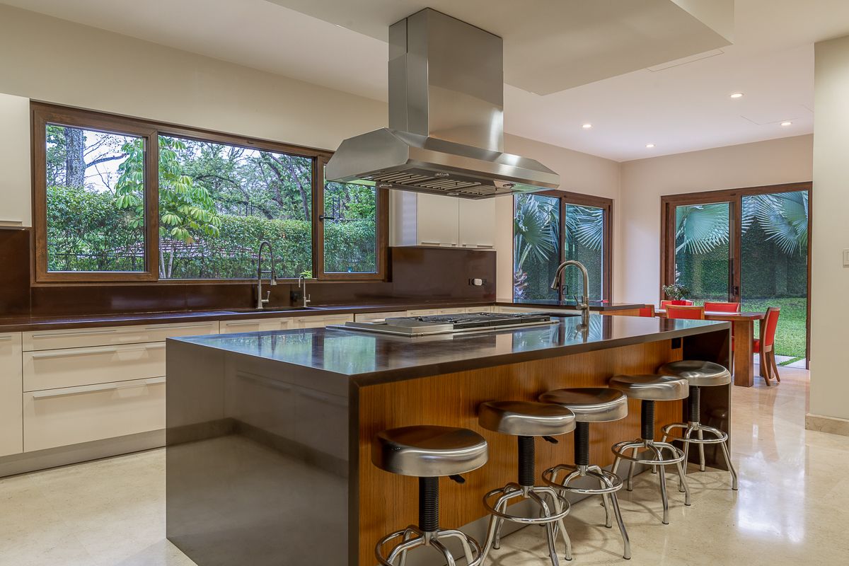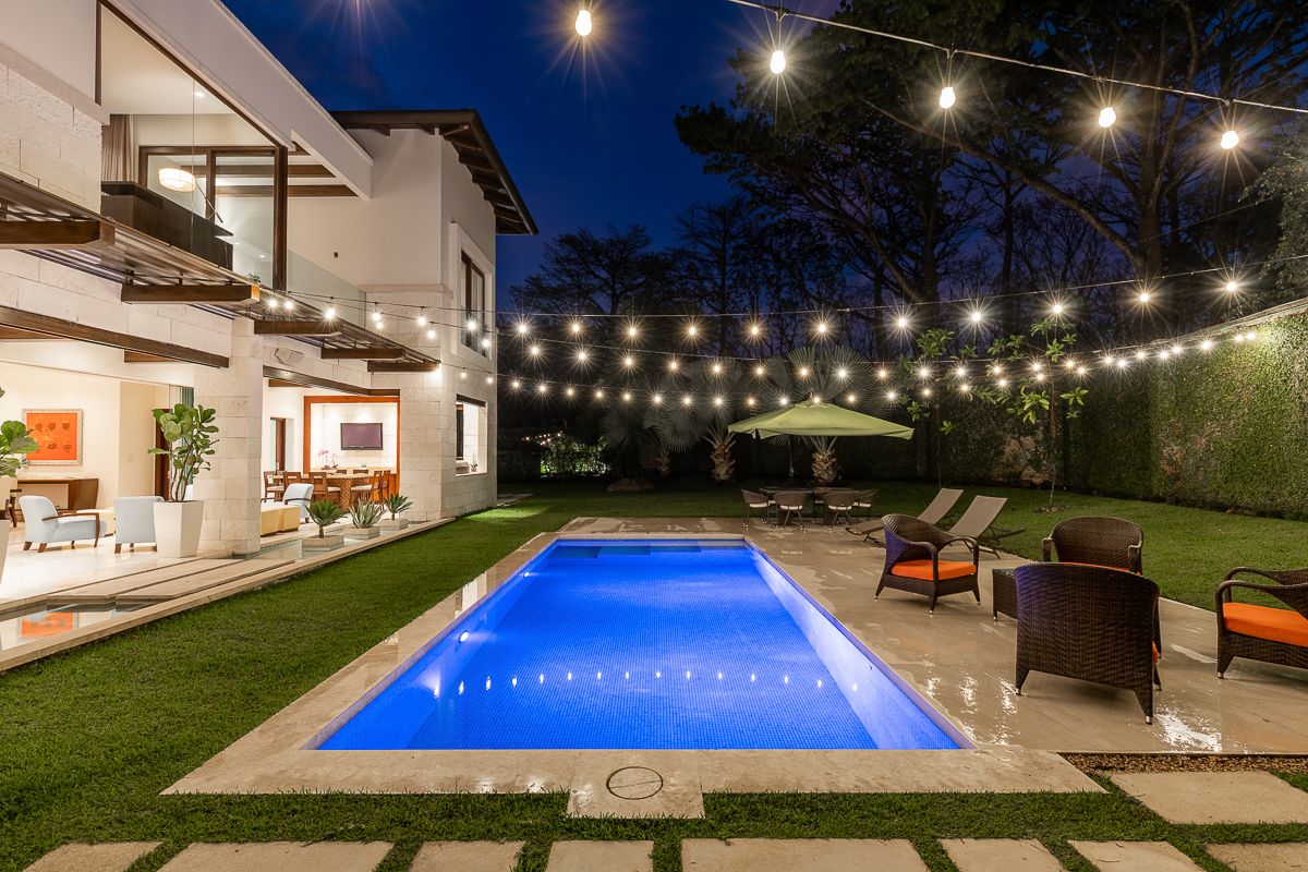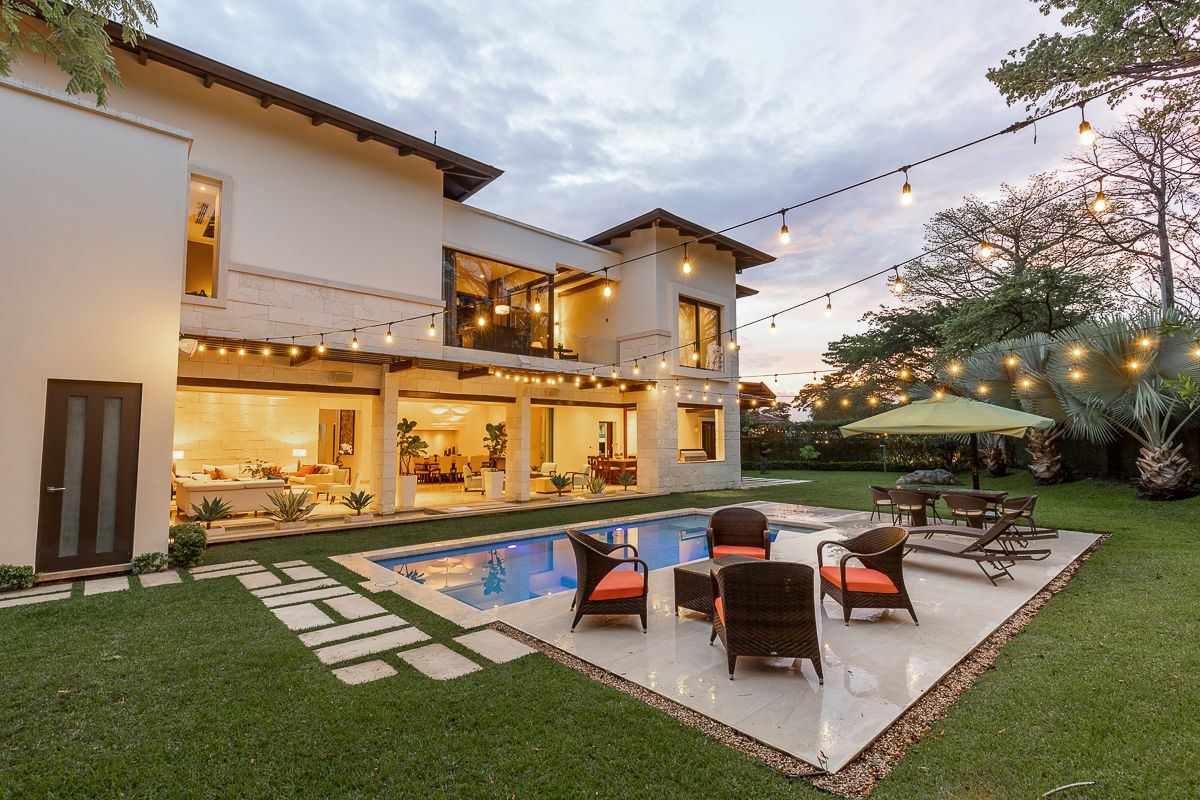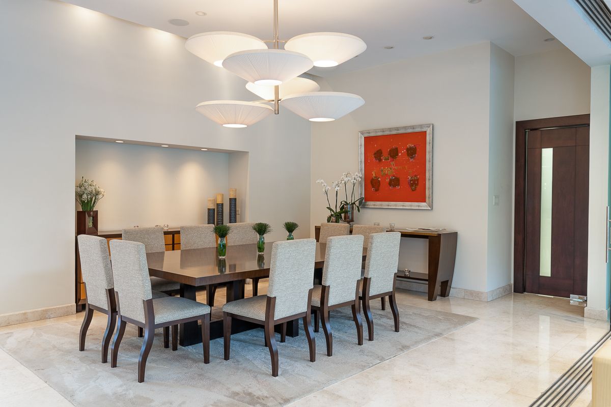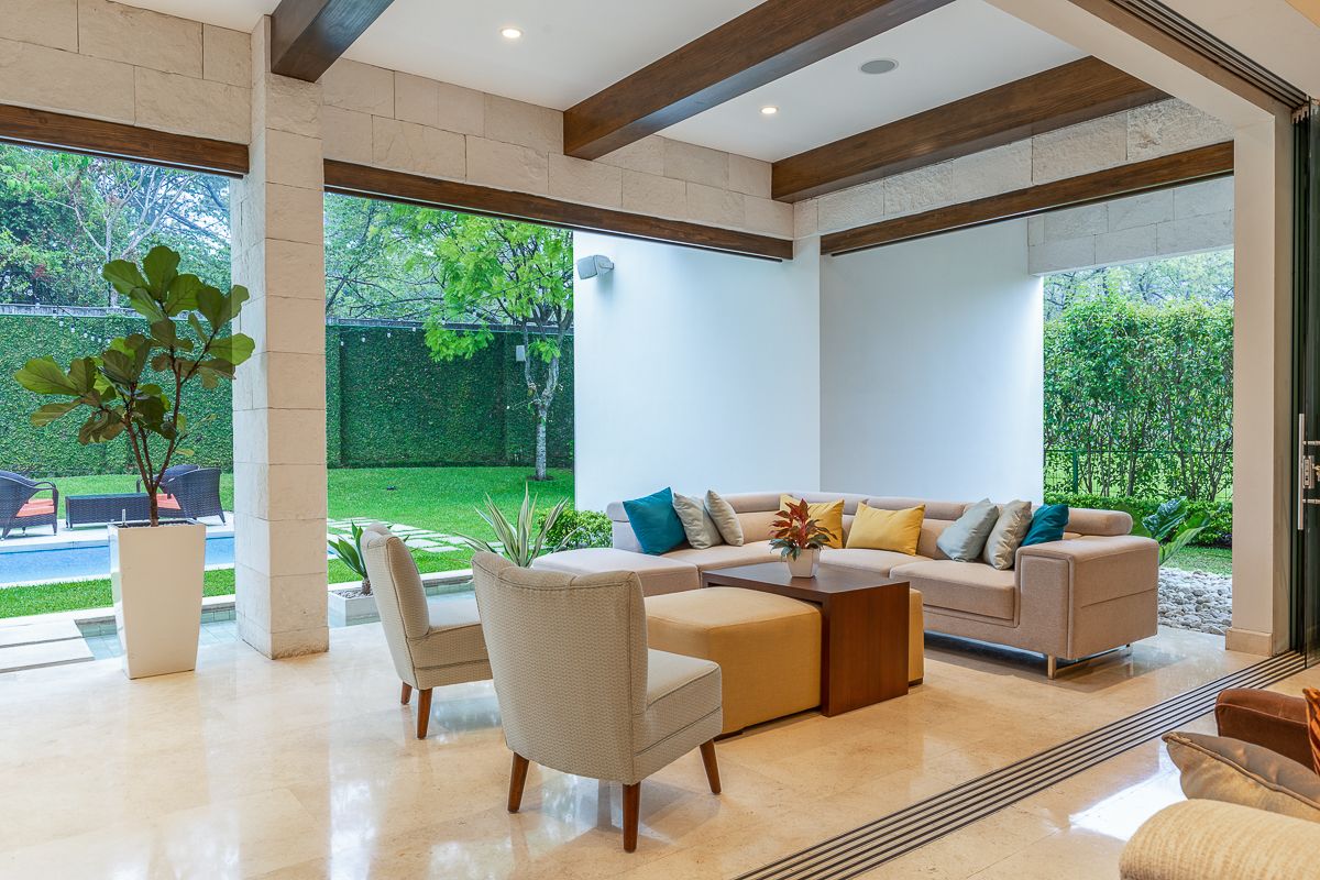 This elegant luxury home for sale in Residencial La Hacienda was designed in a contemporary style. The work of the renowned architect Jean Garnier, it is an example of high design, ideal spaces and good taste. The beautiful path to the large front door is a harmonious blend of modern water features, vegetation and rich textures achieved through the limestone that covers several external and internal walls of the house.