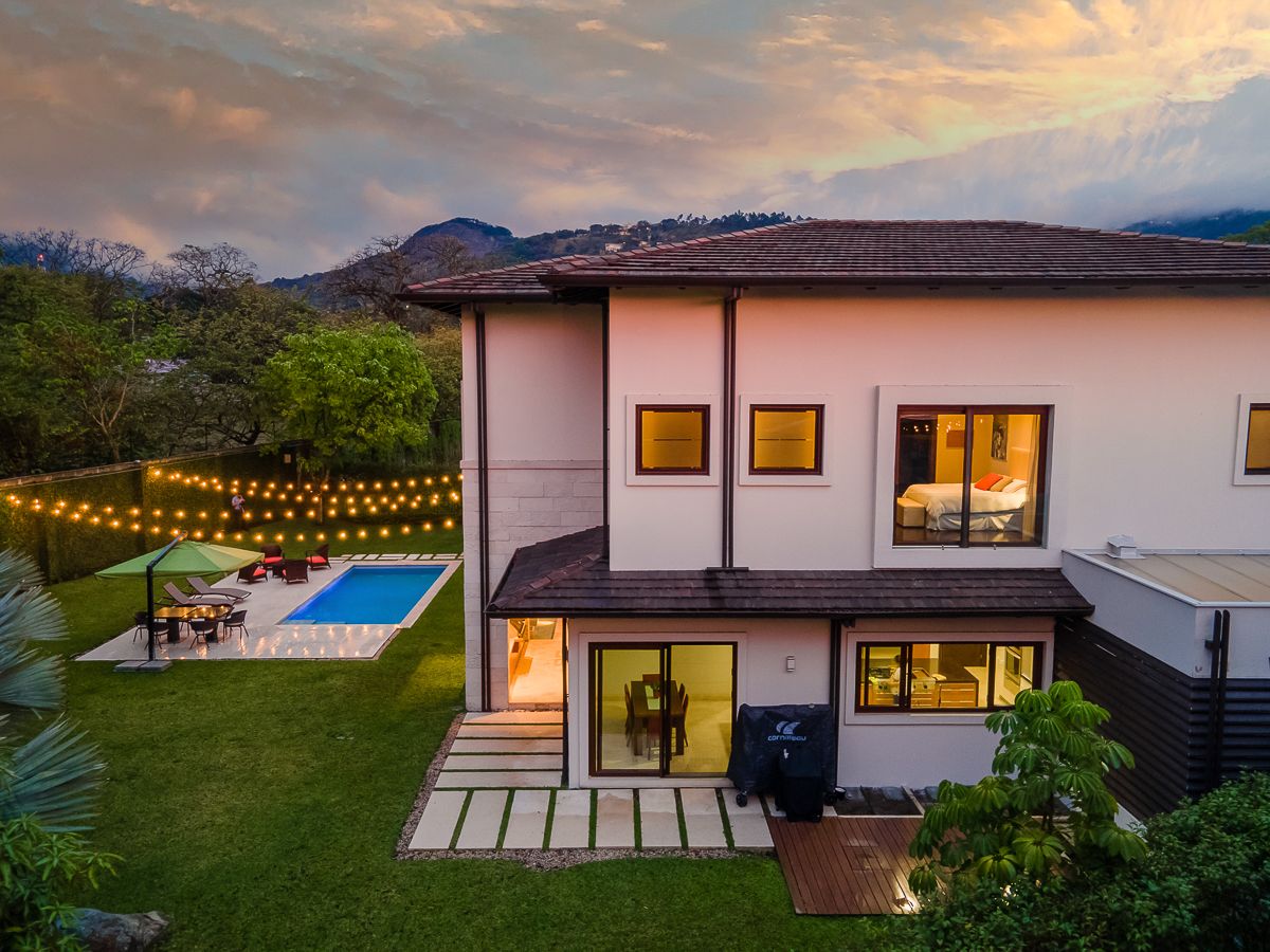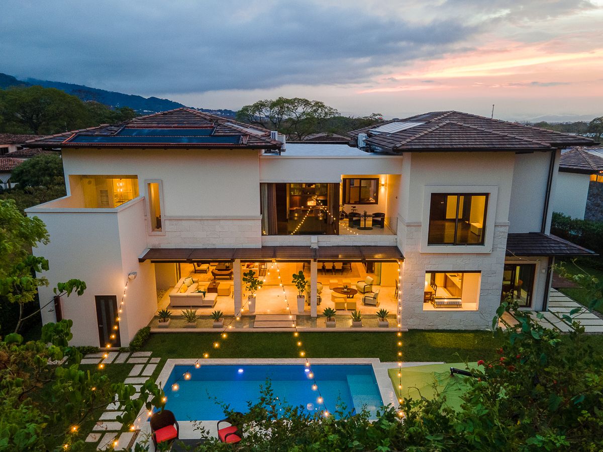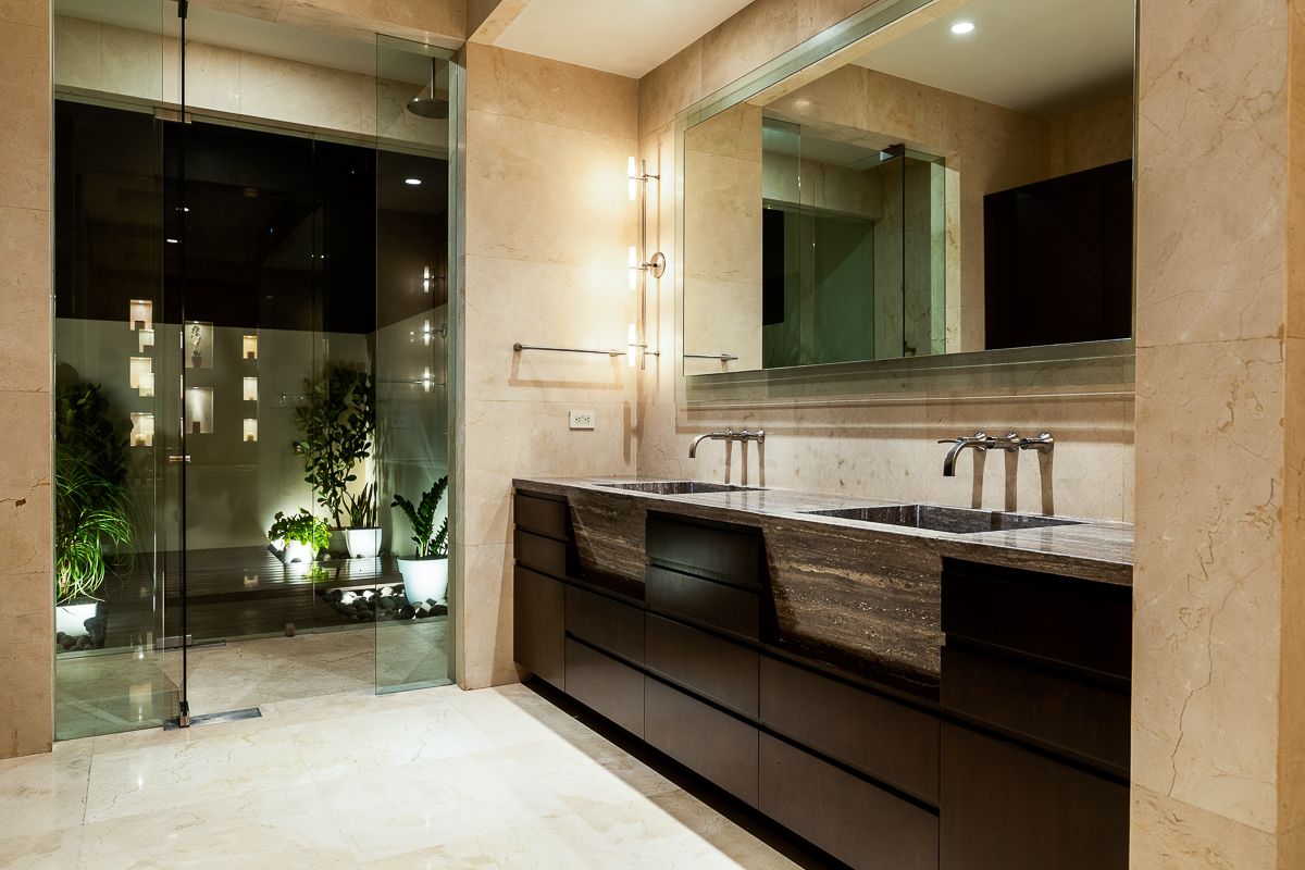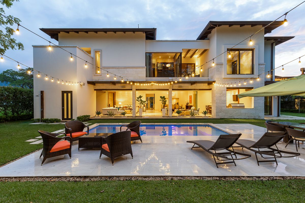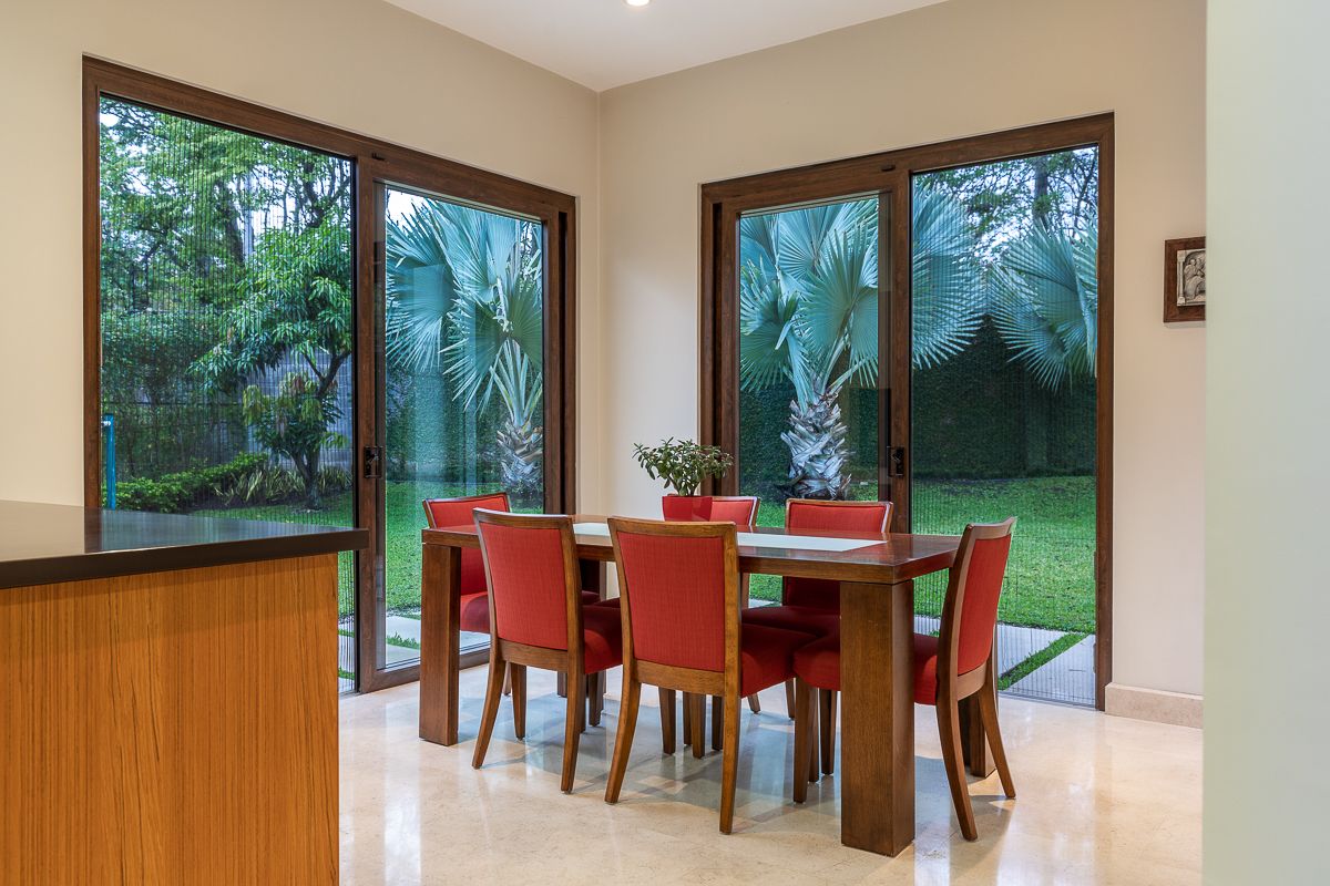 This elegant luxury home for sale in Residencial La Hacienda was designed in a contemporary style. The work of the renowned architect Jean Garnier, it is an example of high design, ideal spaces and good taste. The beautiful path to the large front door is a harmonious blend of modern water features, vegetation and rich textures achieved through the limestone that covers several external and internal walls of the house.
