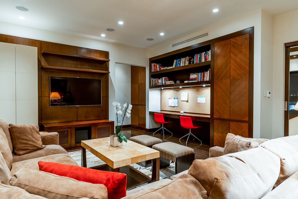 The TV room houses the home theater and space for a large double desk with all the tools of a home office. There is also the comfort of a linen closet and beverage cooler. The built-in furniture was designed in wood for the specific space and use.